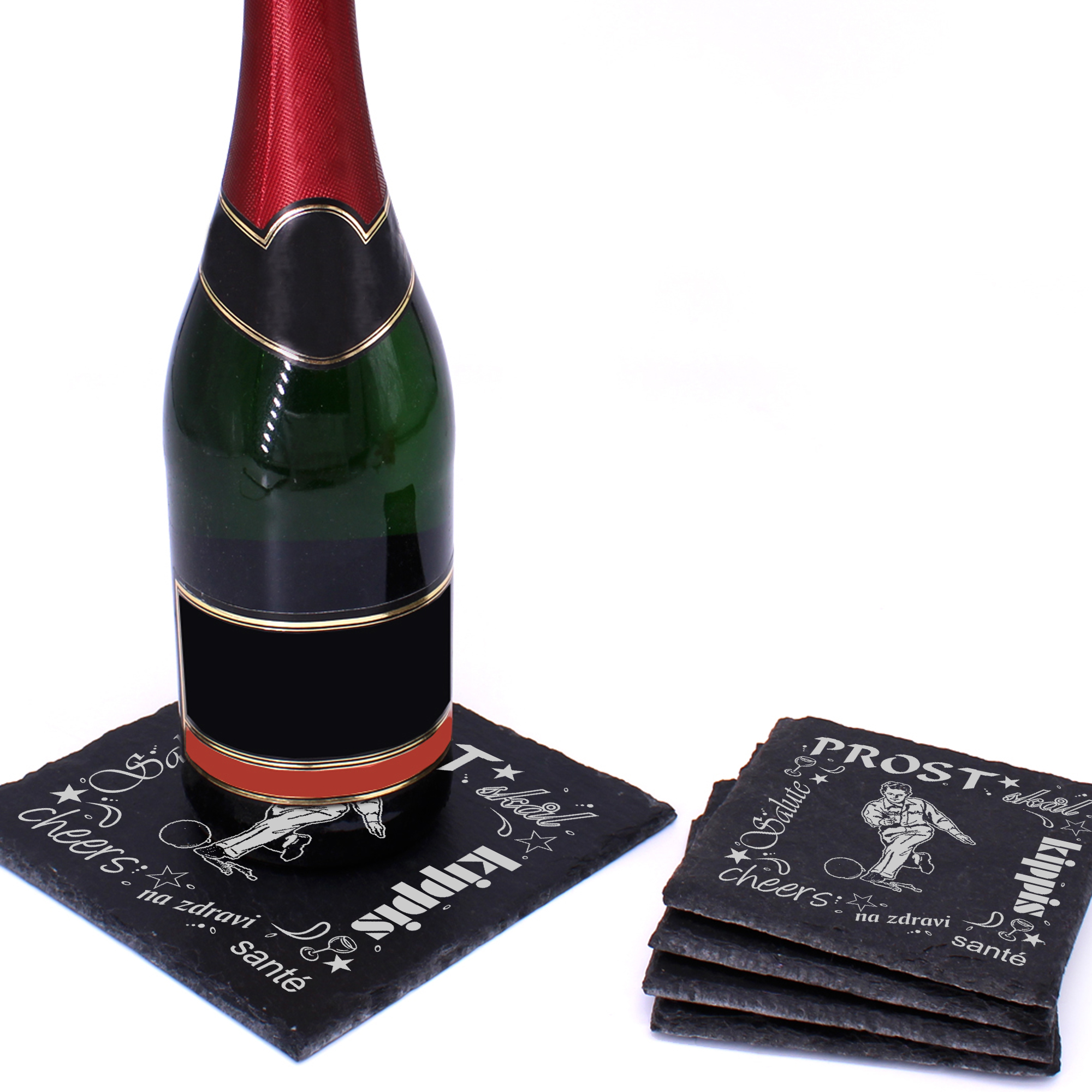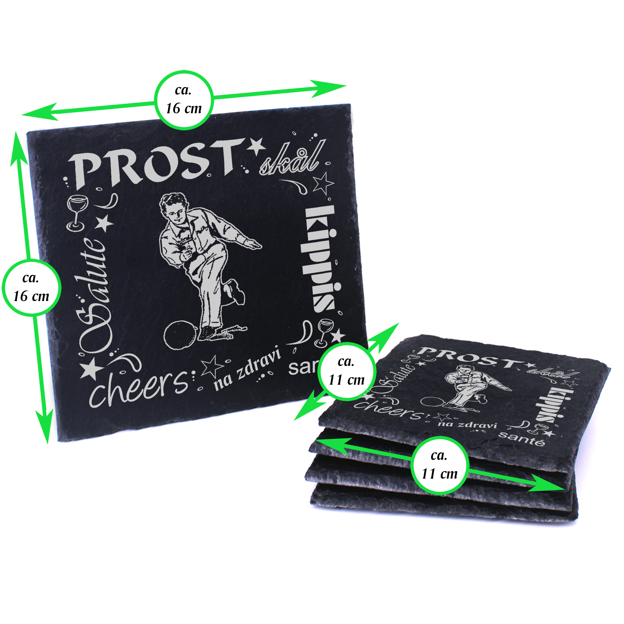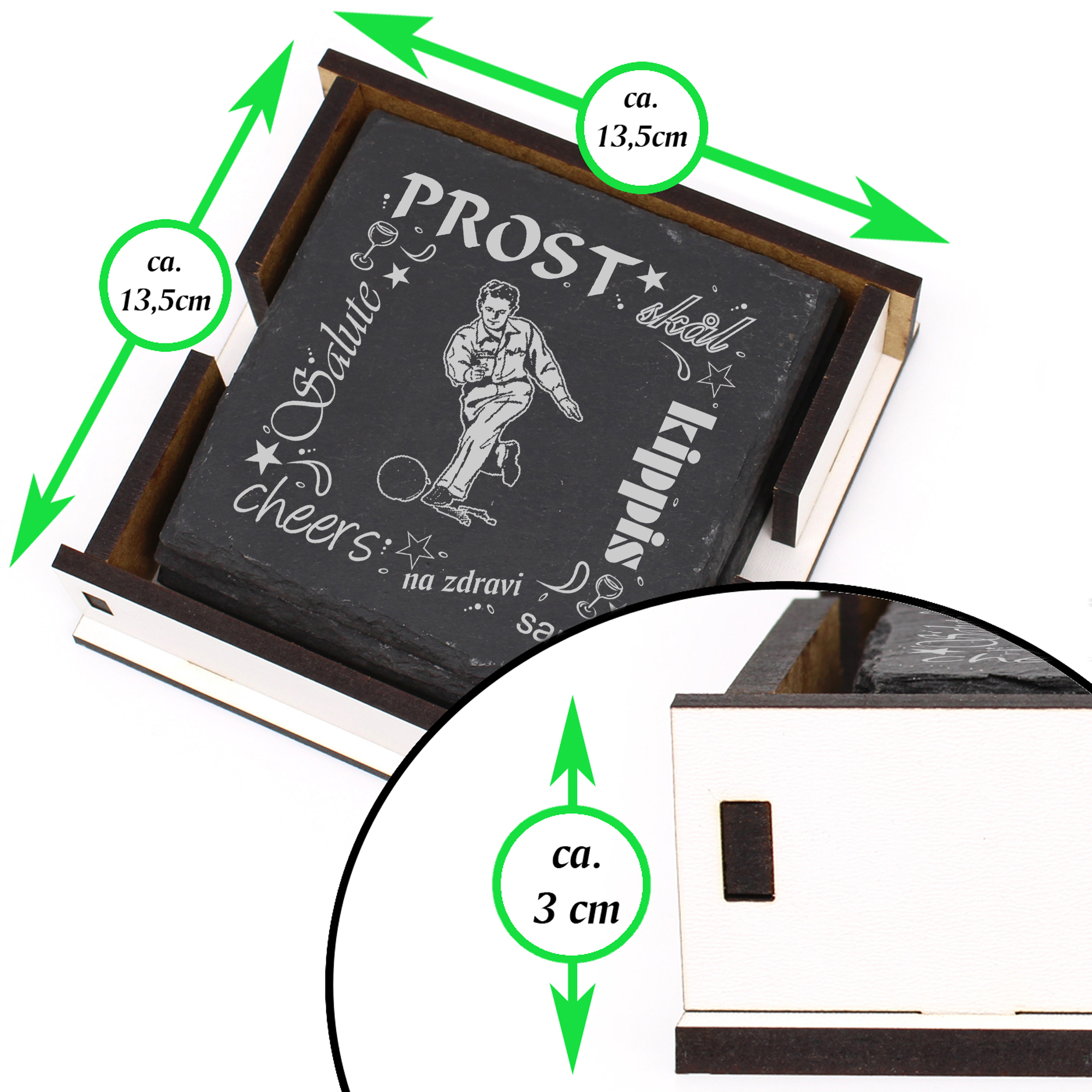 5 x Schiefer Untersetzer - Prost Bownling - inkl. Holzbox & Flaschenuntersetzer
