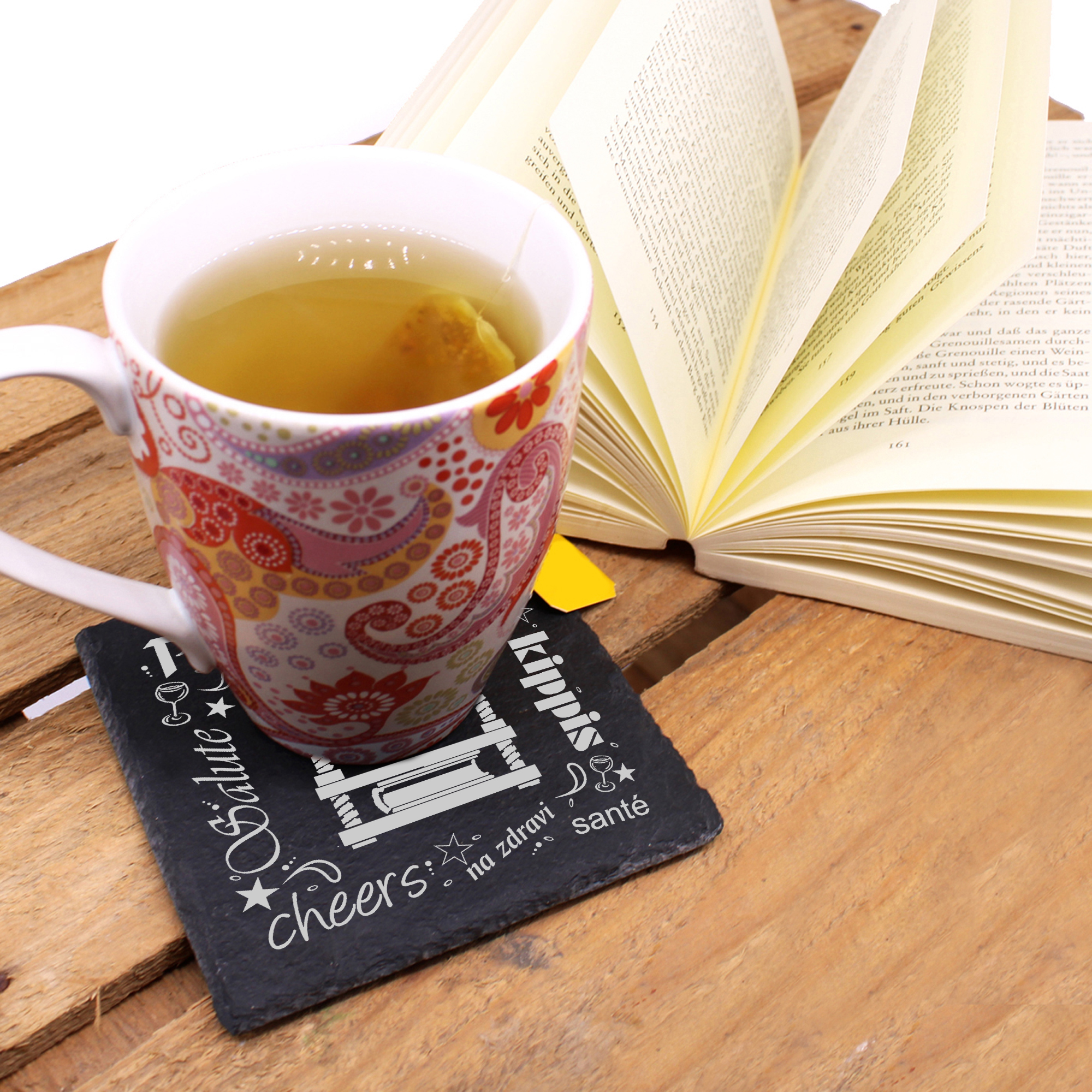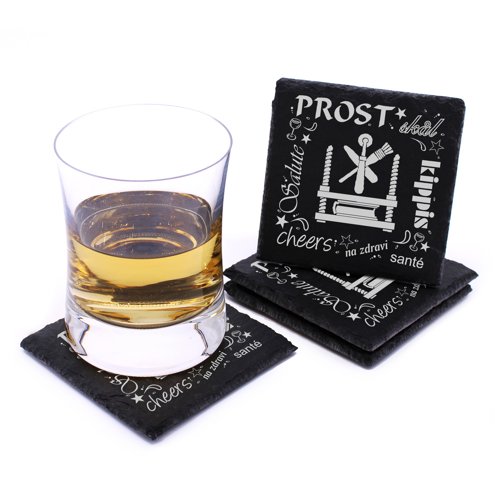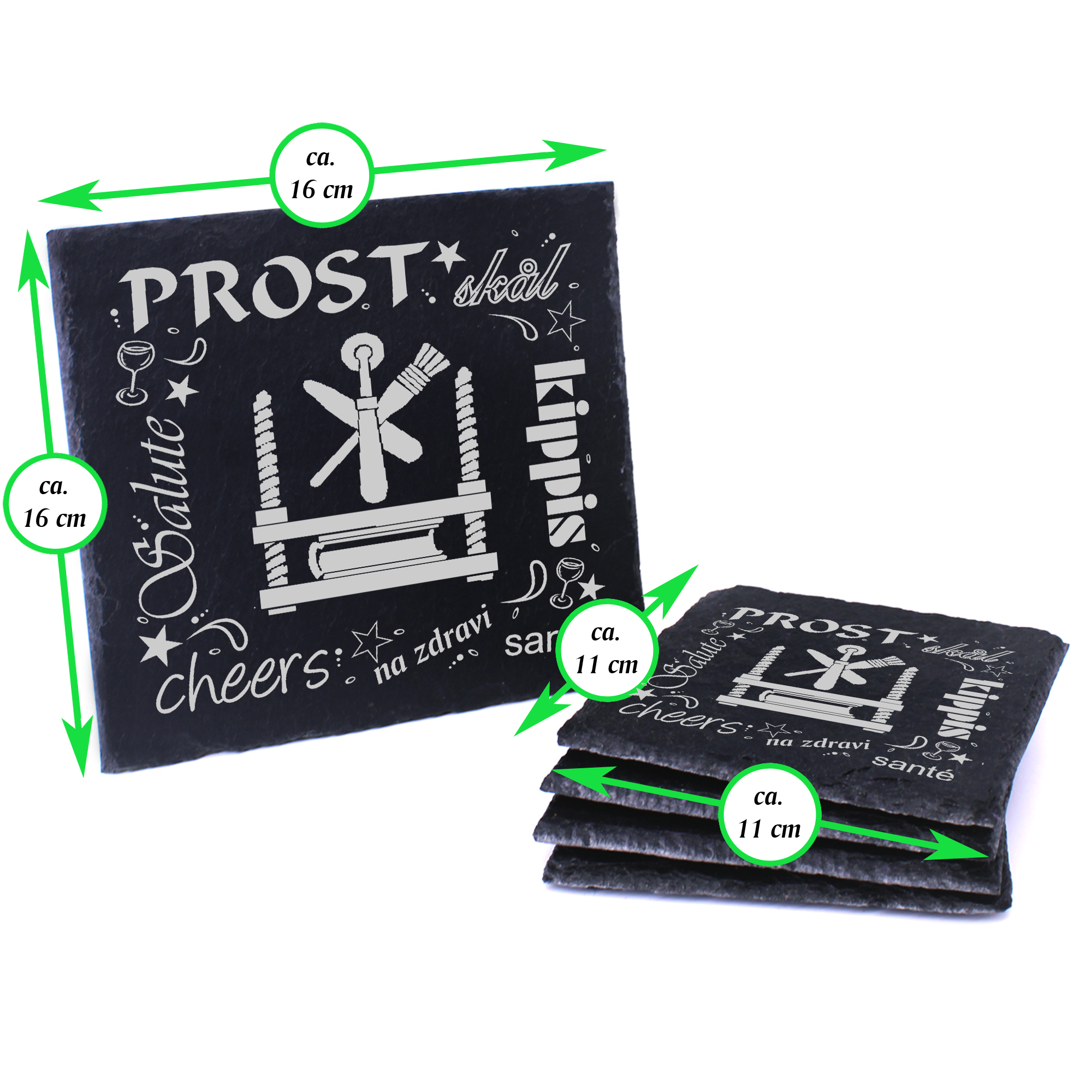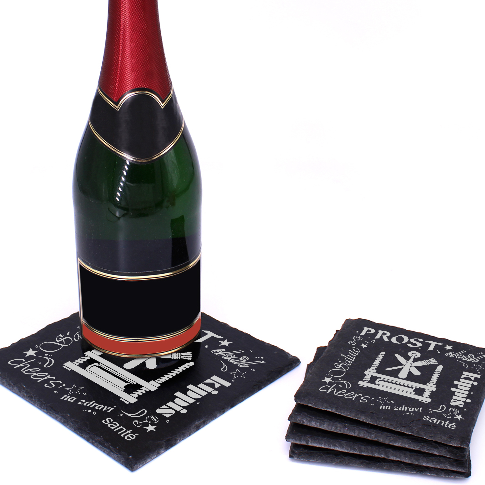 5 x Schiefer Untersetzer - Prost Buchbinder - inkl. Holzbox & Flaschenuntersetzer