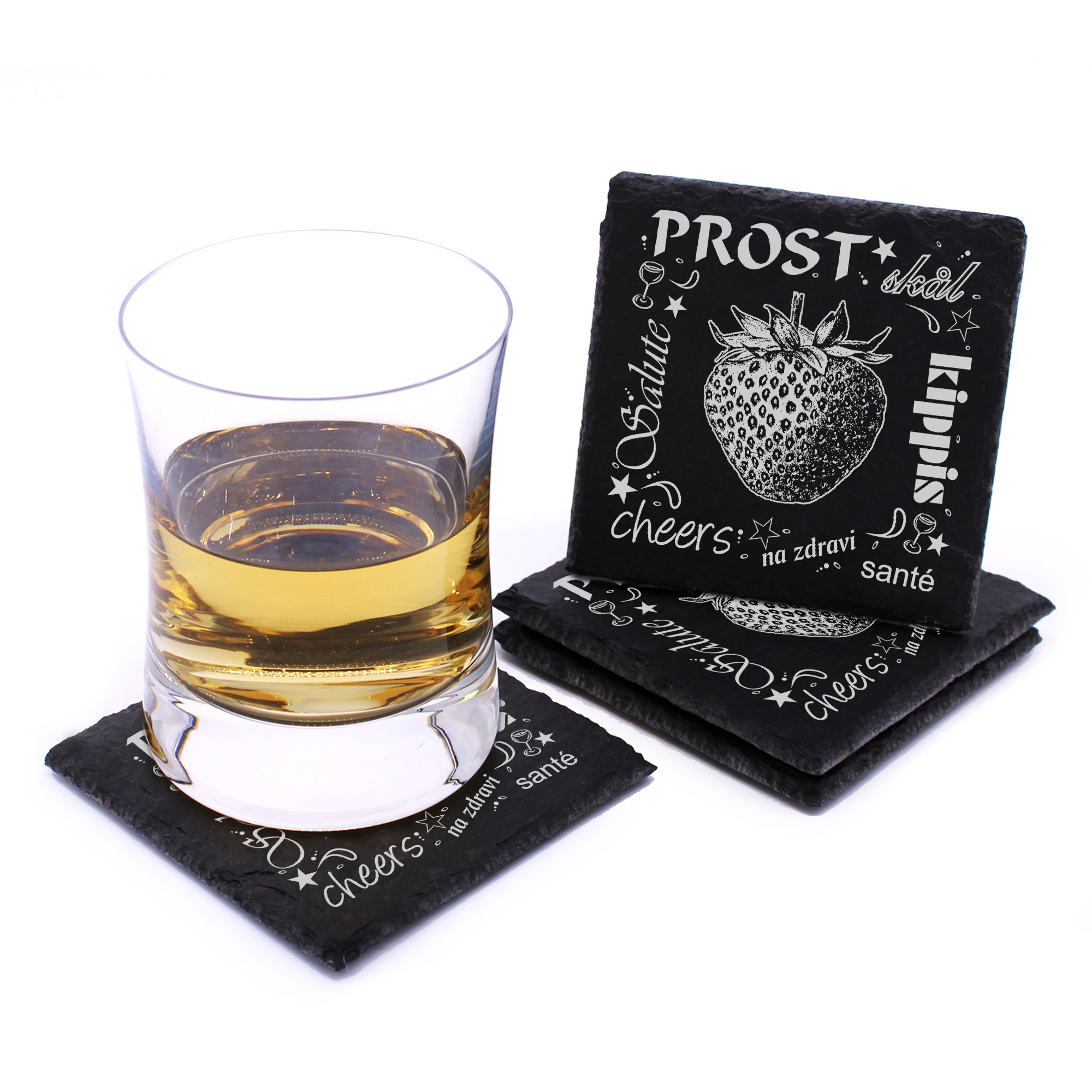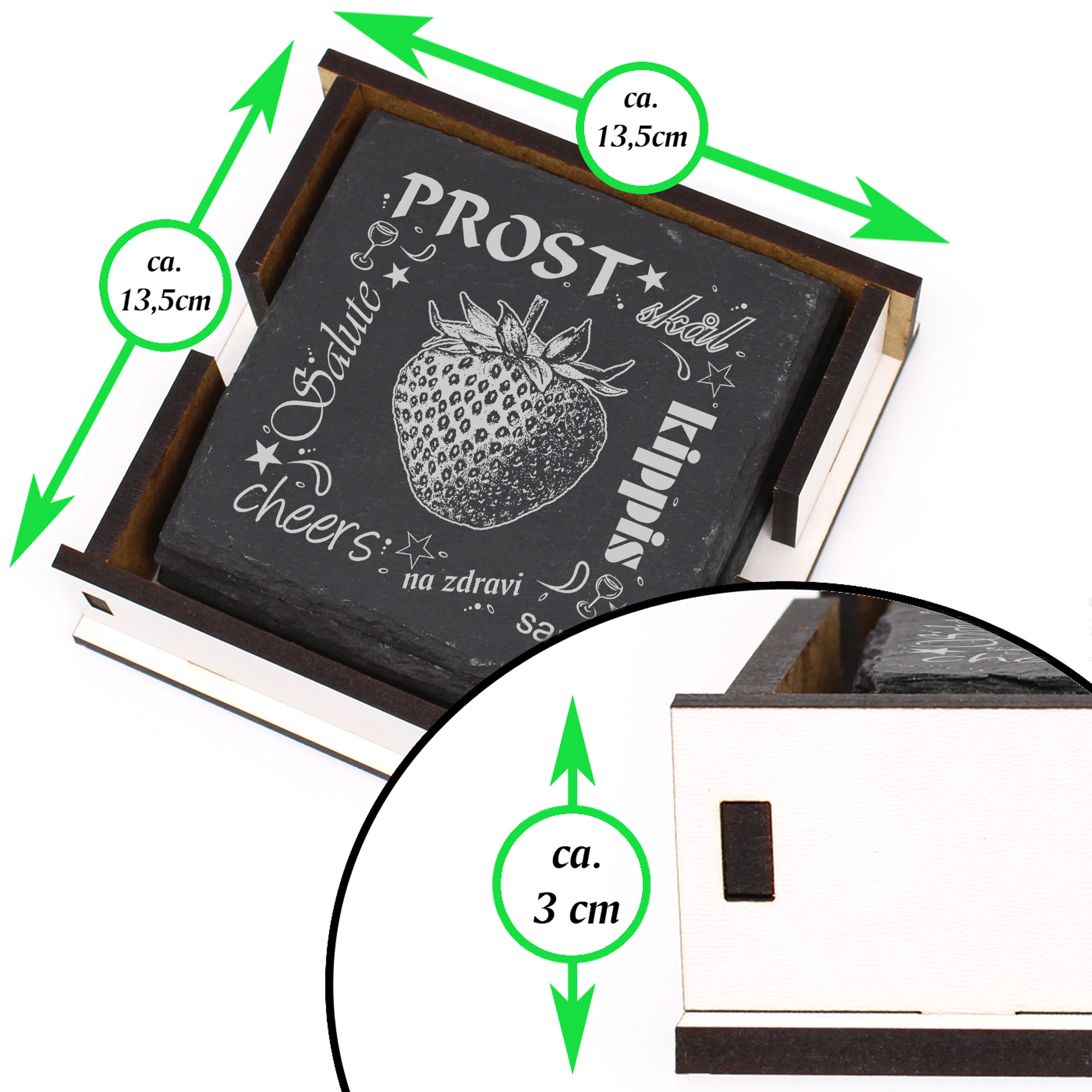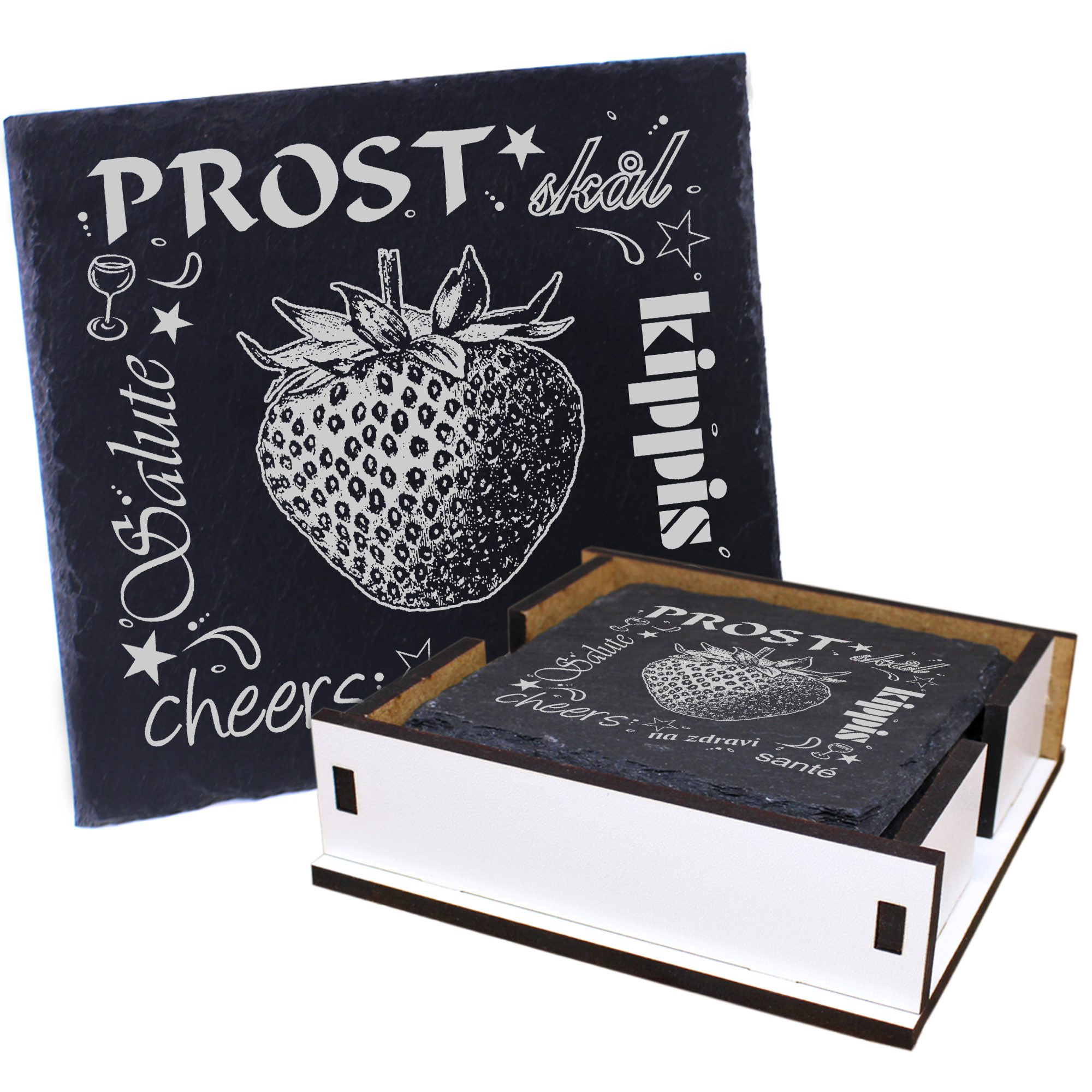 5 x Schiefer Untersetzer - Prost Erdbeere - inkl. Holzbox & Flaschenuntersetzer