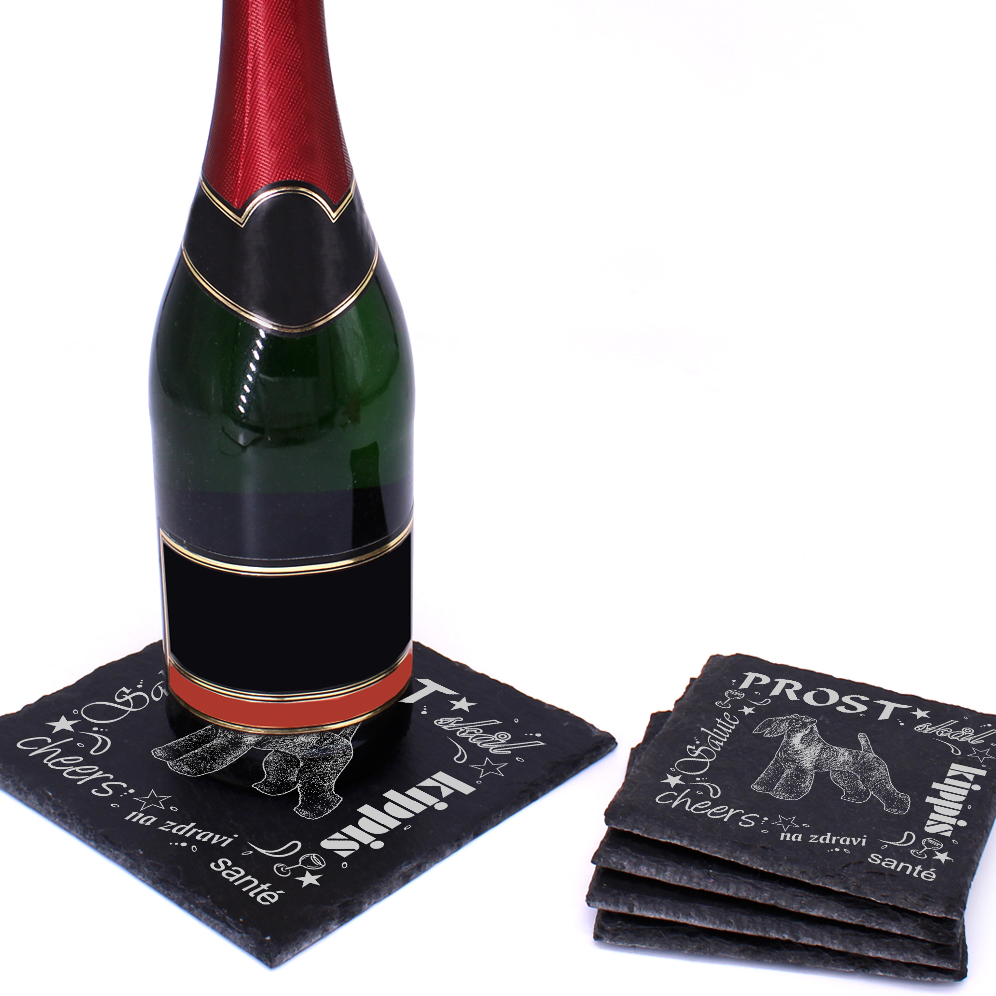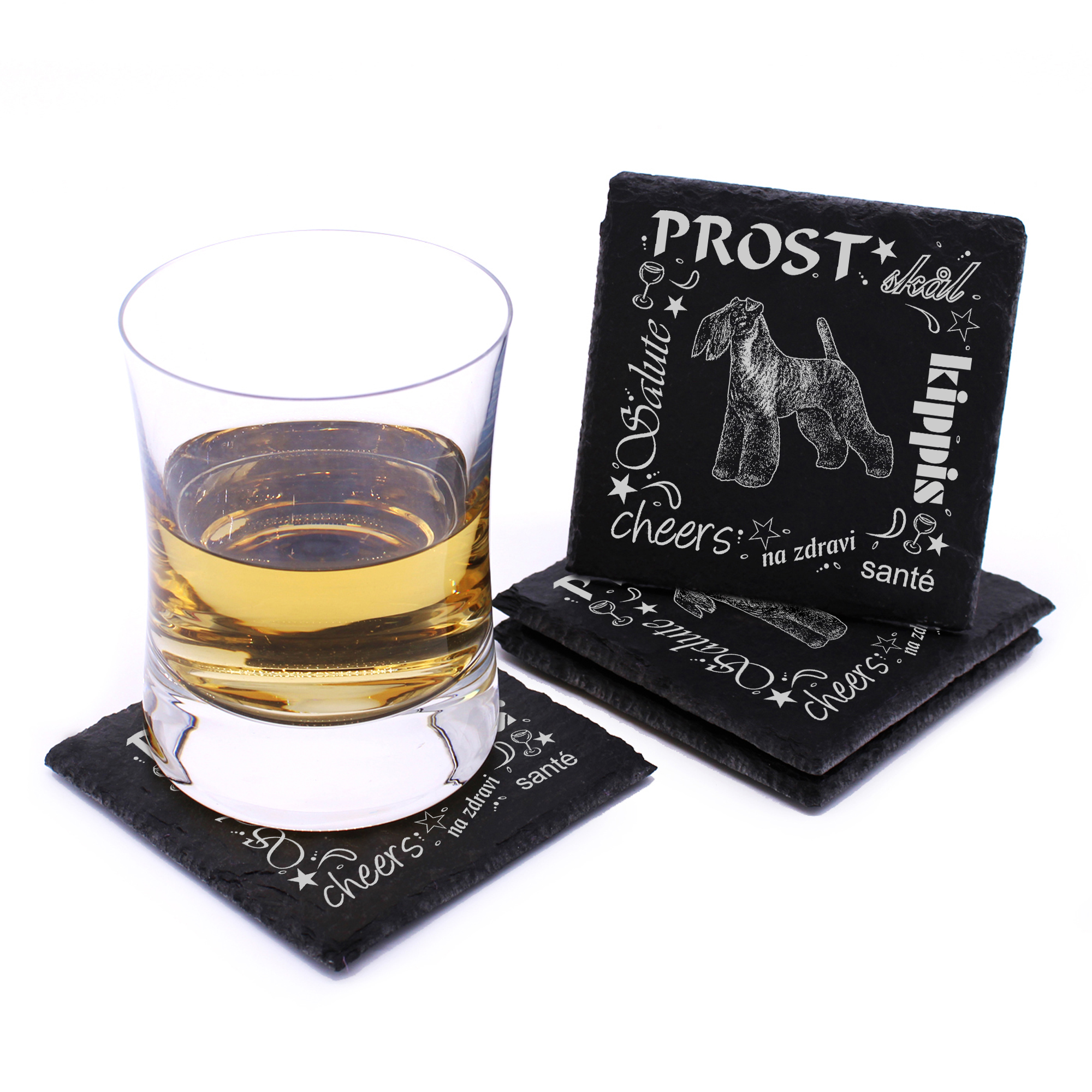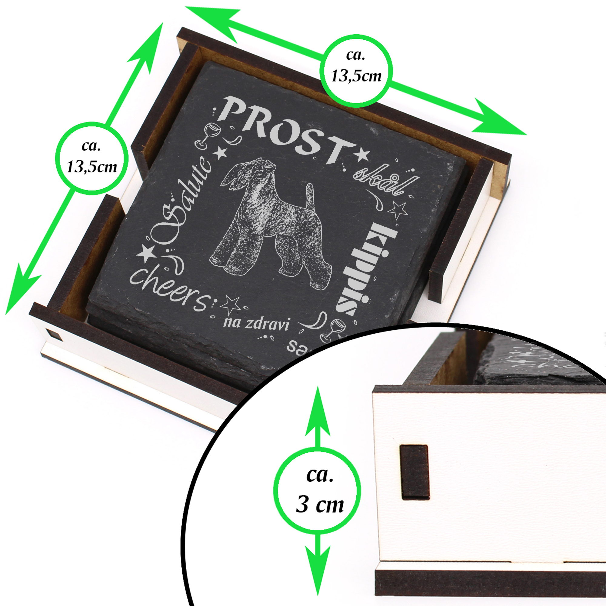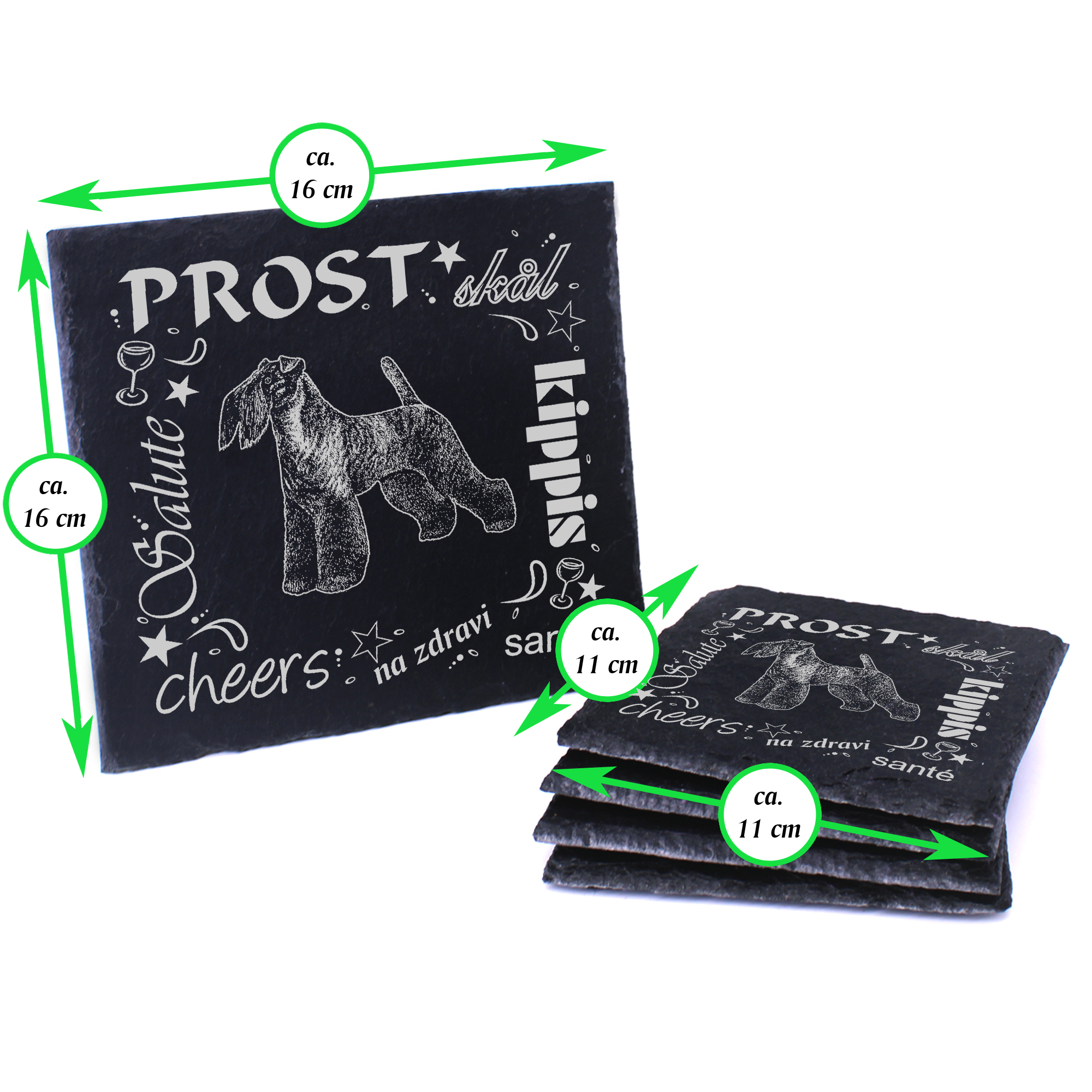 5 x Schiefer Untersetzer - Prost Kerry Blue Terrier - inkl. Holzbox & Flaschenuntersetzer
