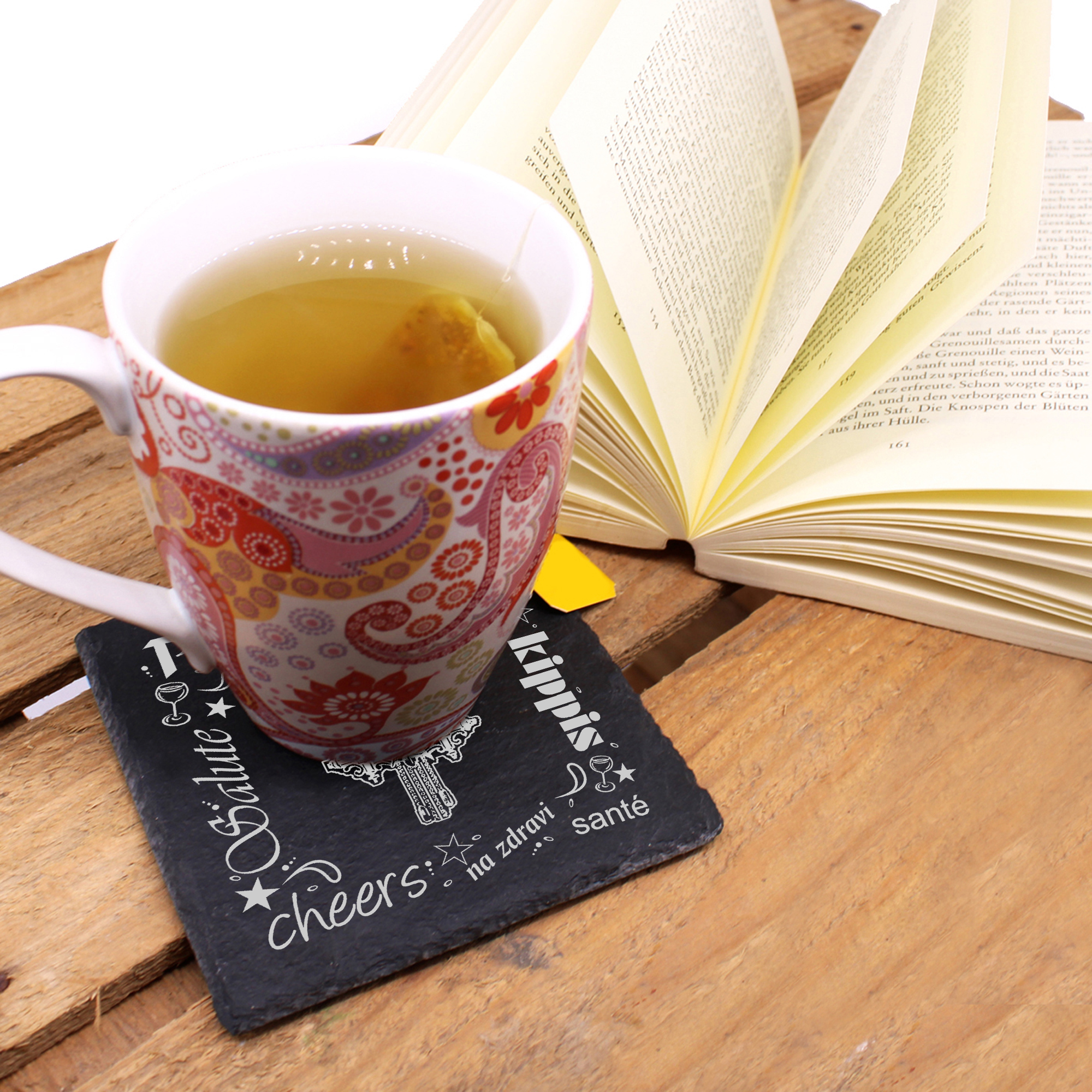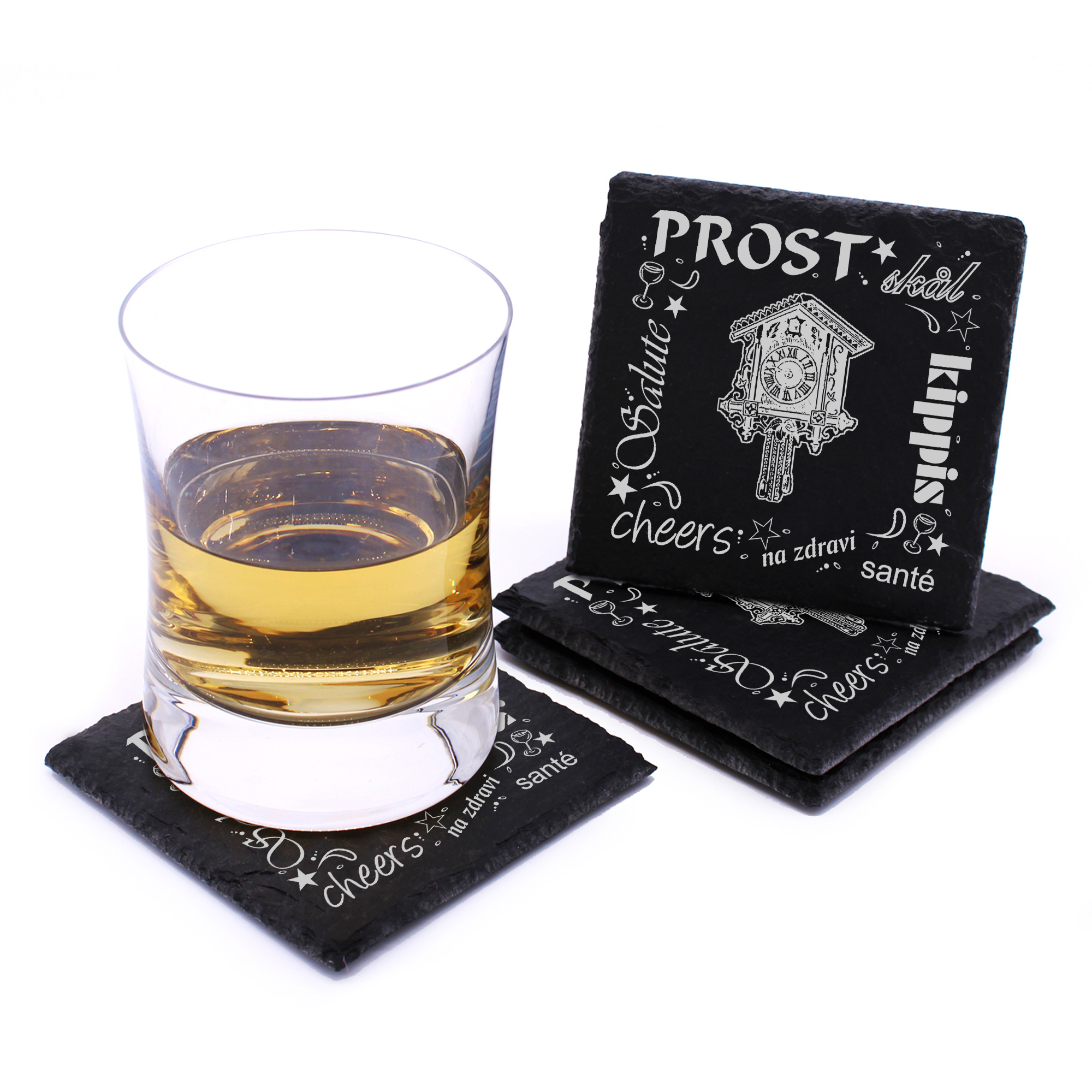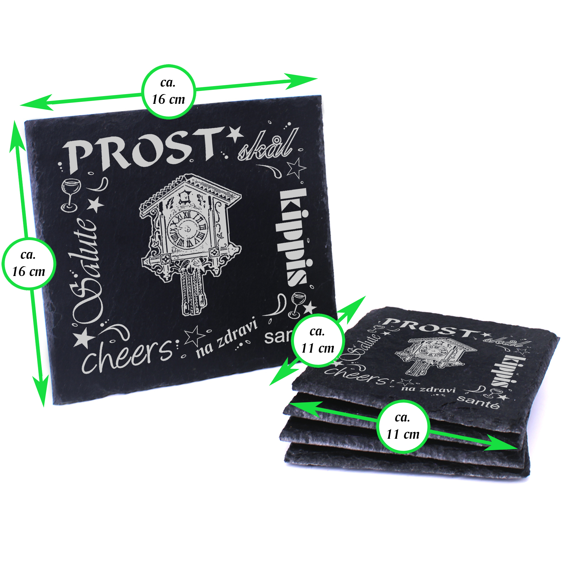 5 x Schiefer Untersetzer - Prost Kuckucksuhr - inkl. Holzbox & Flaschenuntersetzer