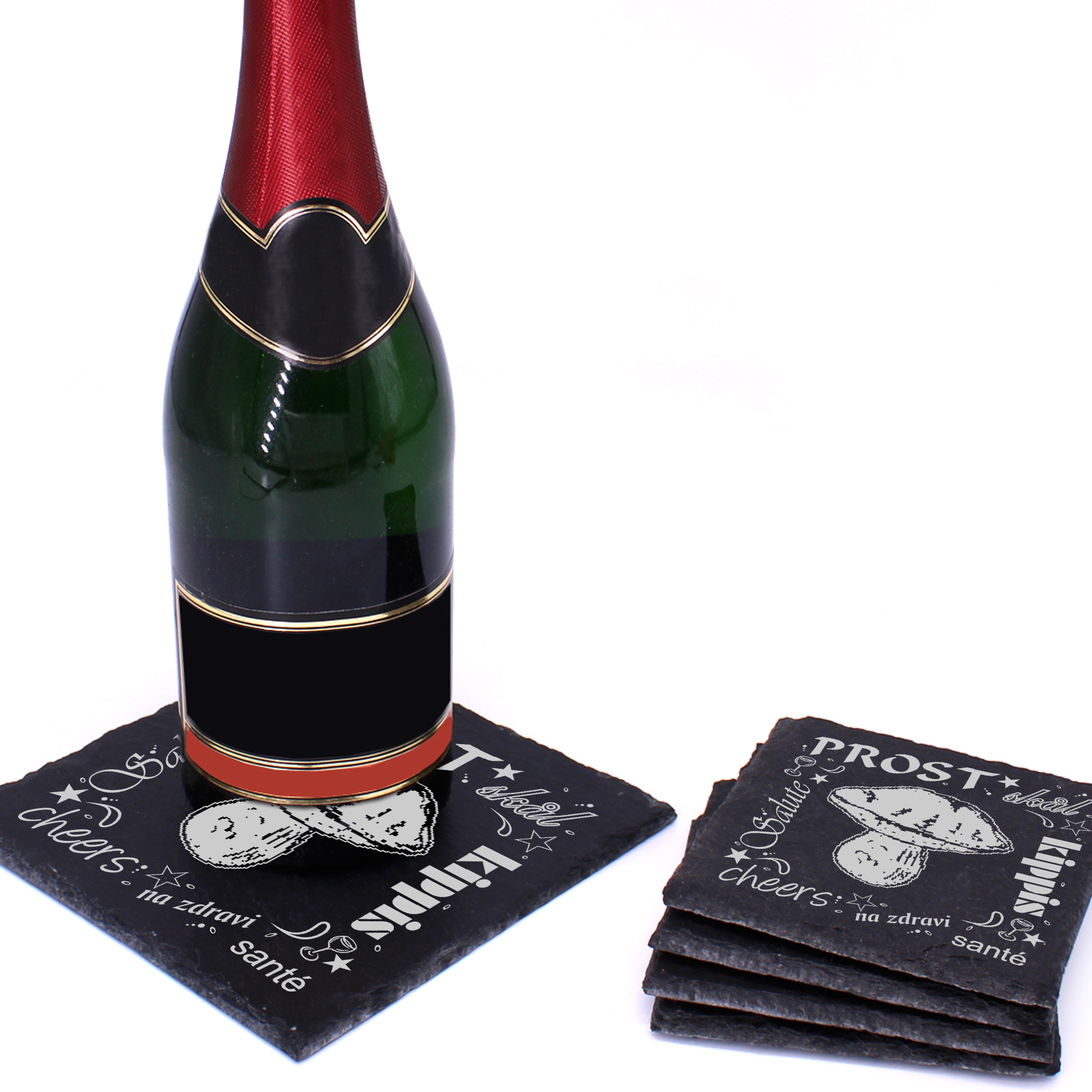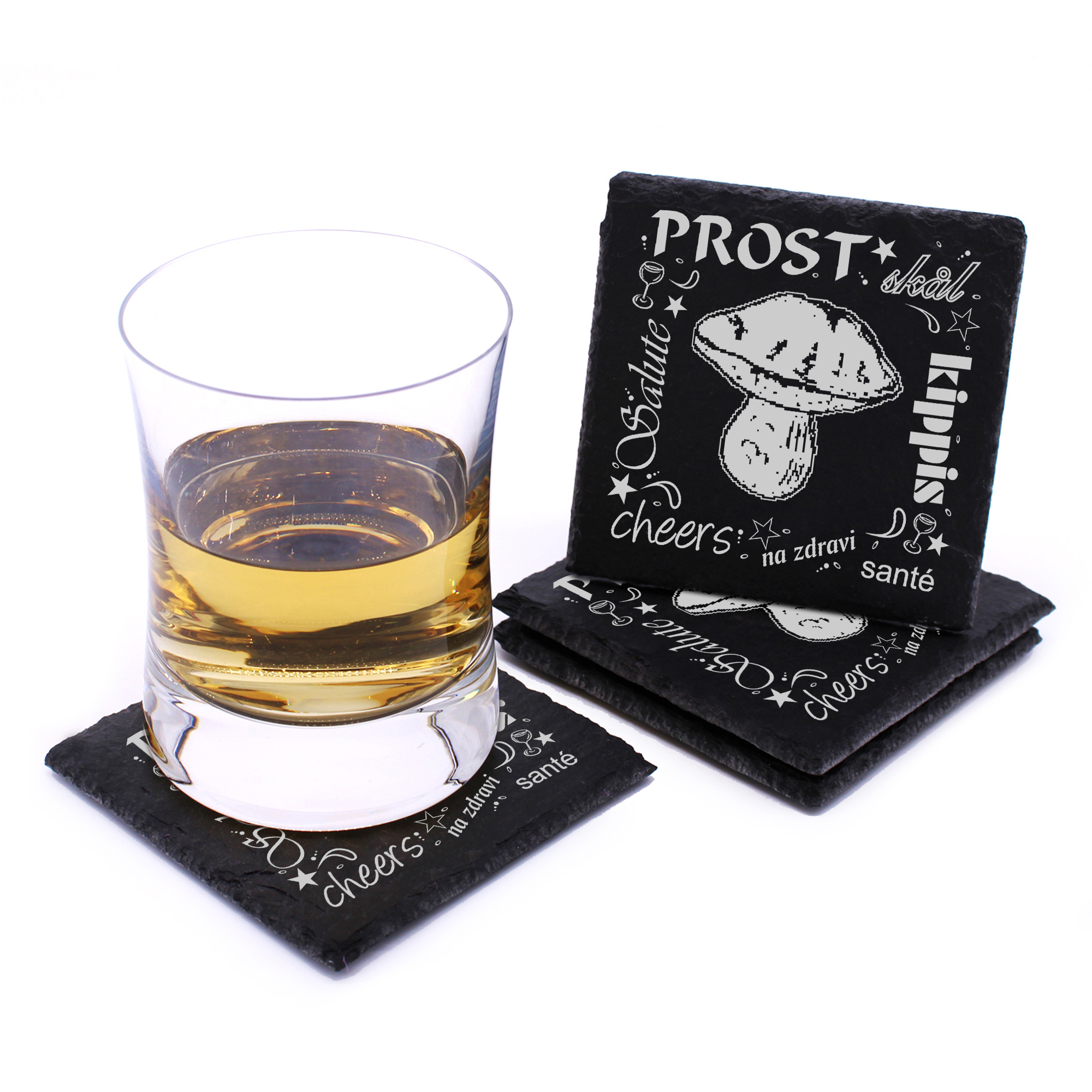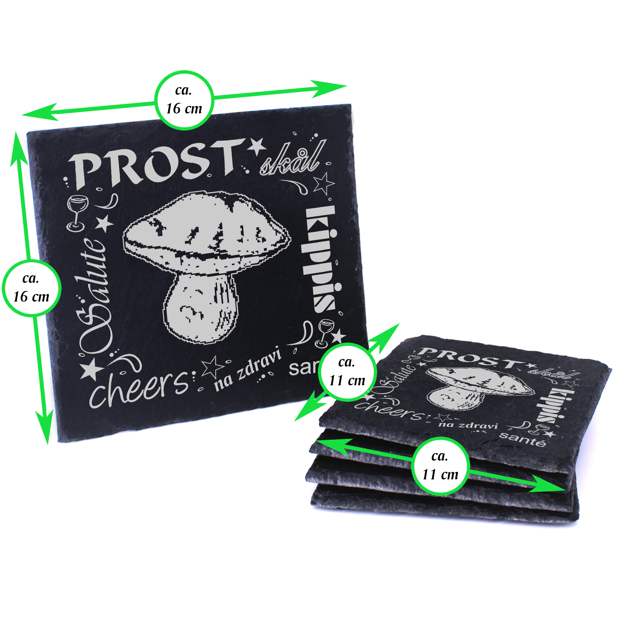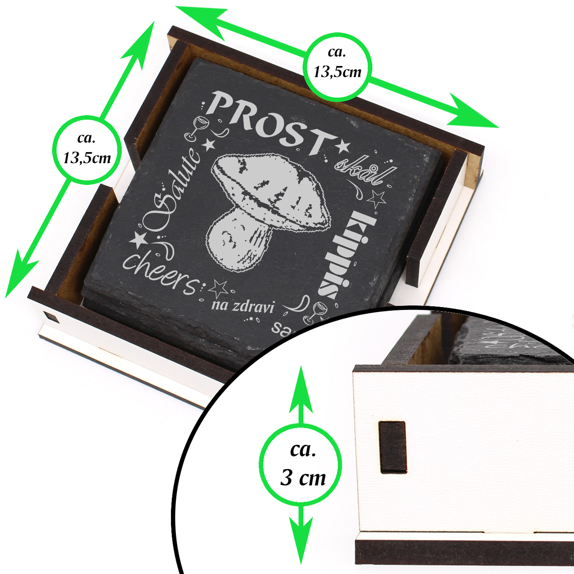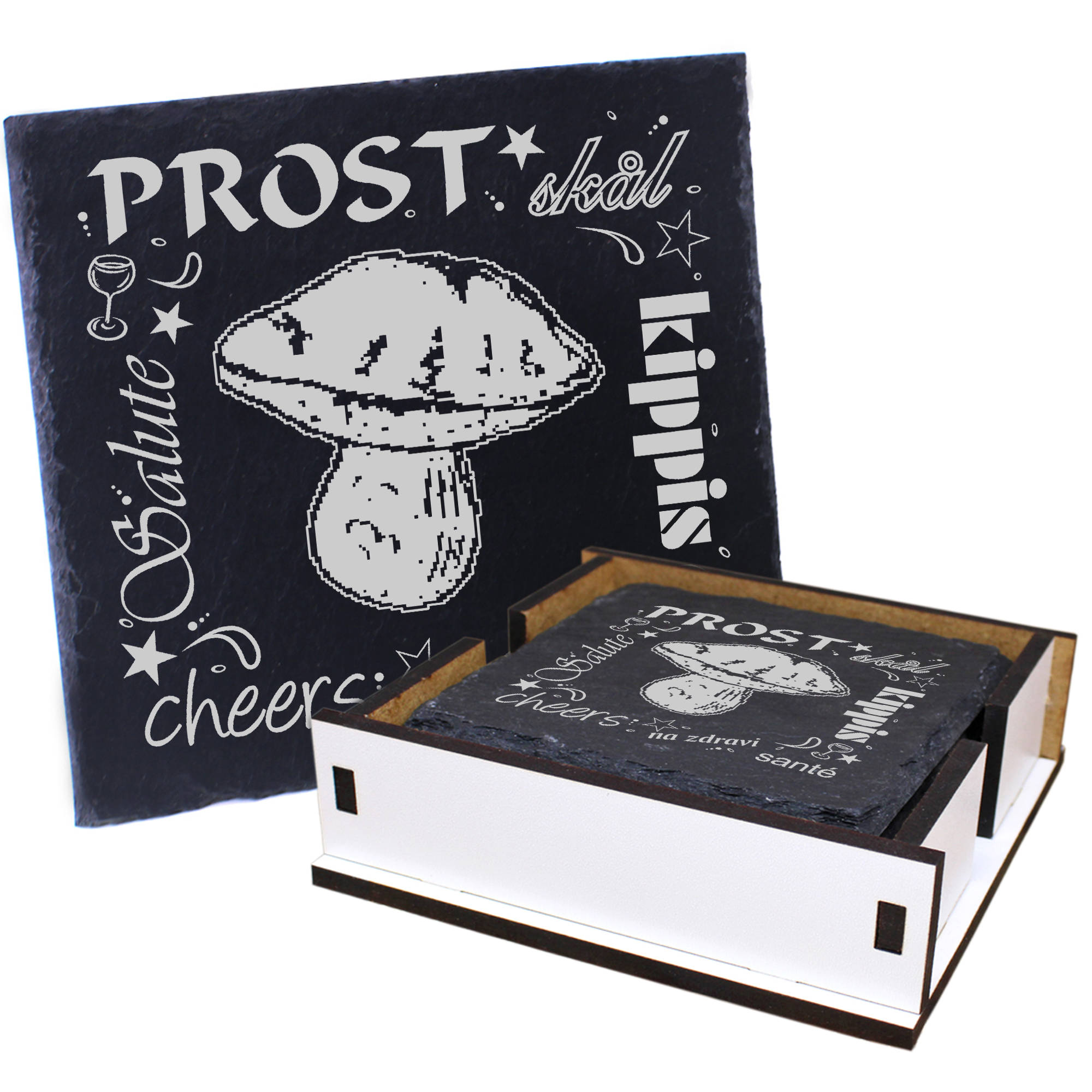 5 x Schiefer Untersetzer - Prost Steinpilz - inkl. Holzbox & Flaschenuntersetzer