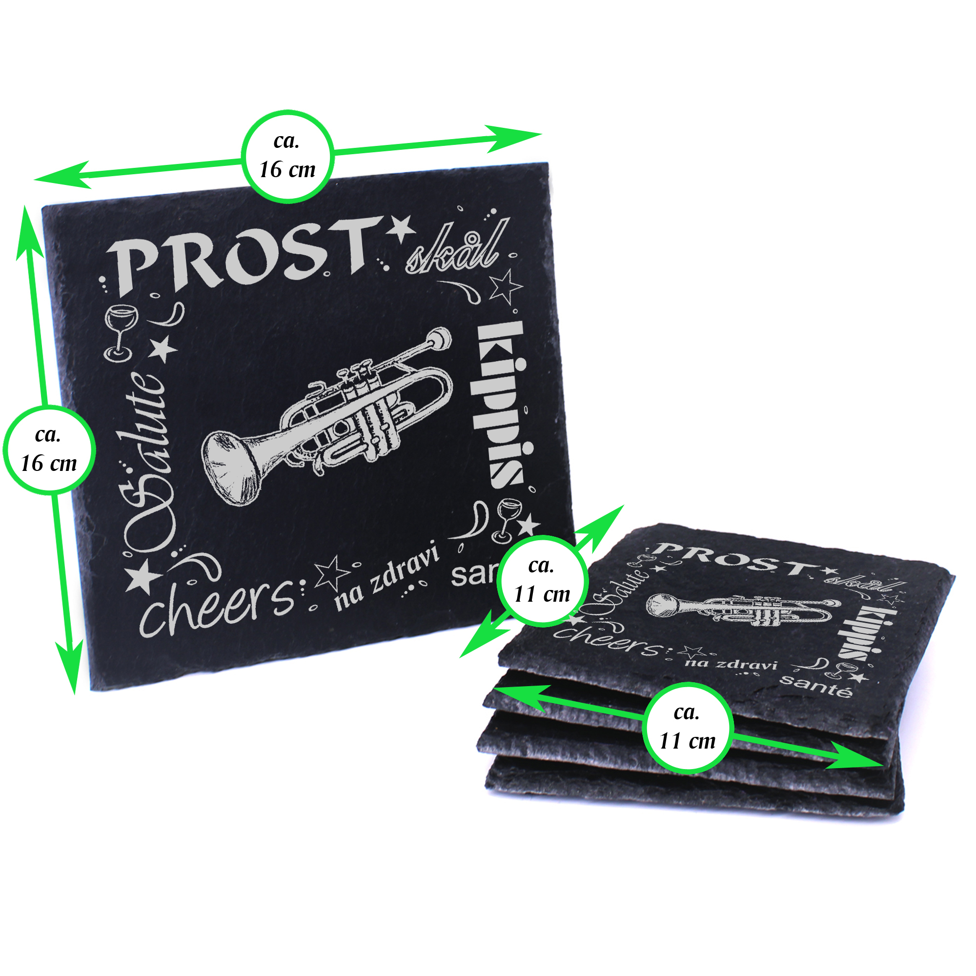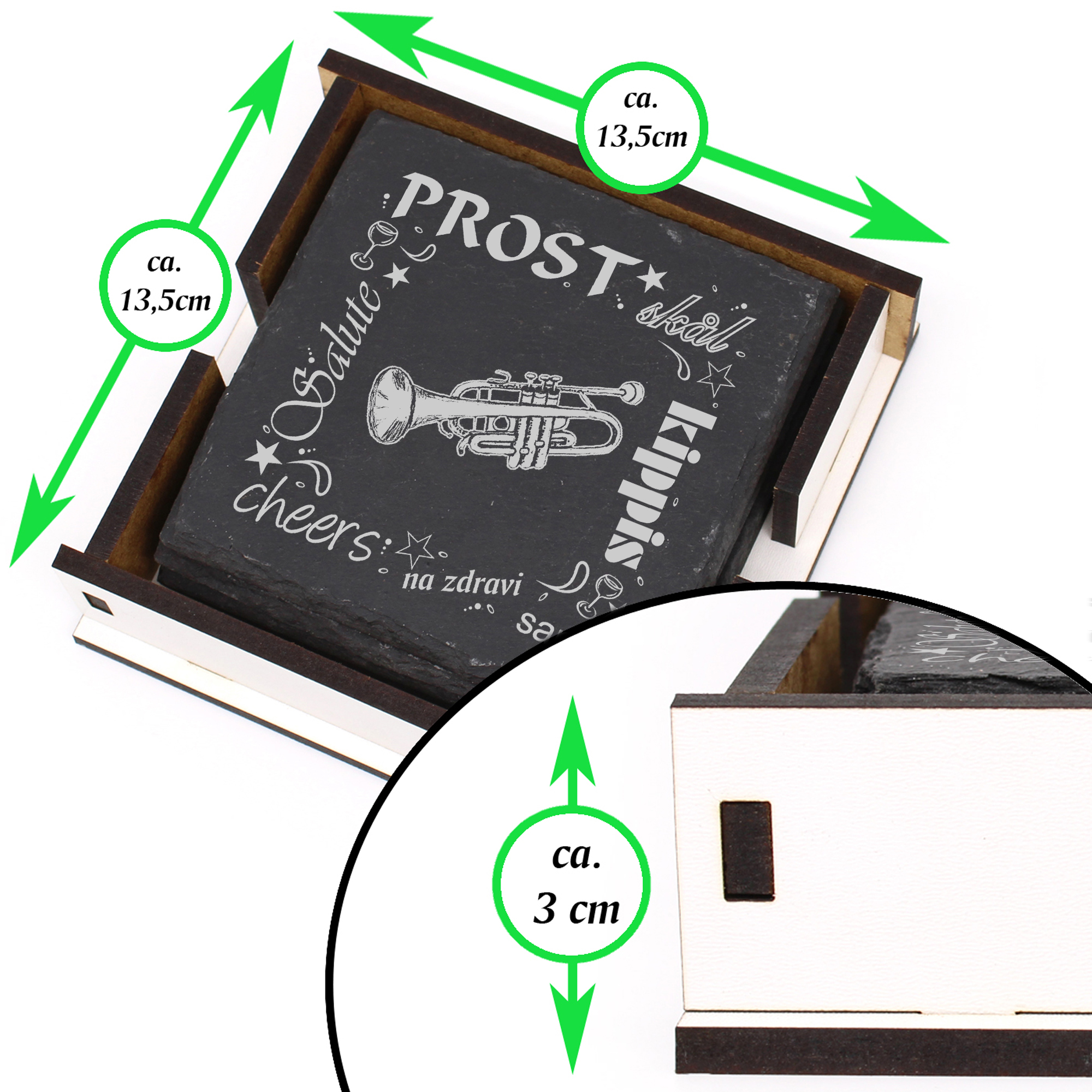 5 x Schiefer Untersetzer - Prost Trompete - inkl. Holzbox & Flaschenuntersetzer