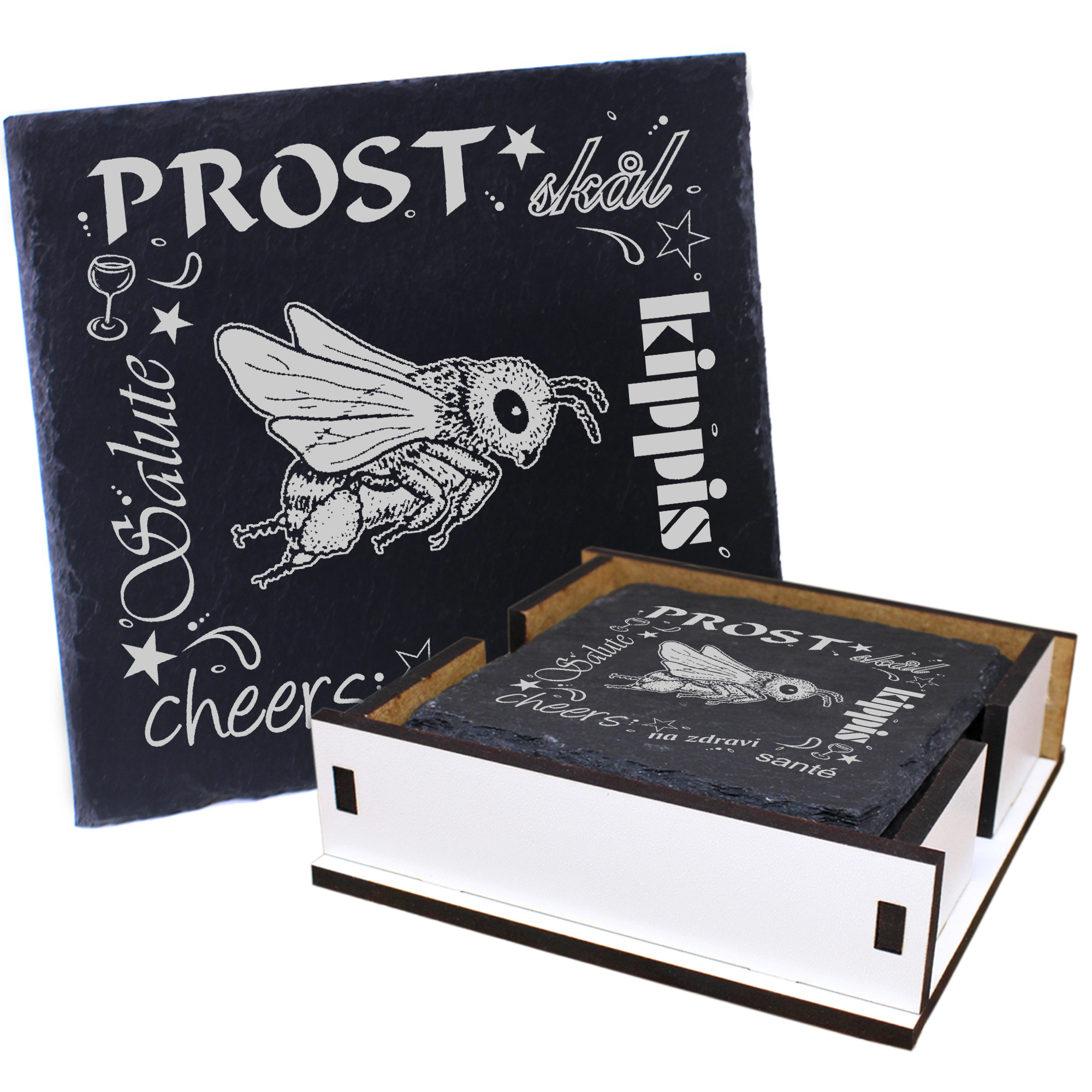 5 x Schiefer Untersetzer - Prost fliegende Biene - inkl. Holzbox & Flaschenuntersetzer