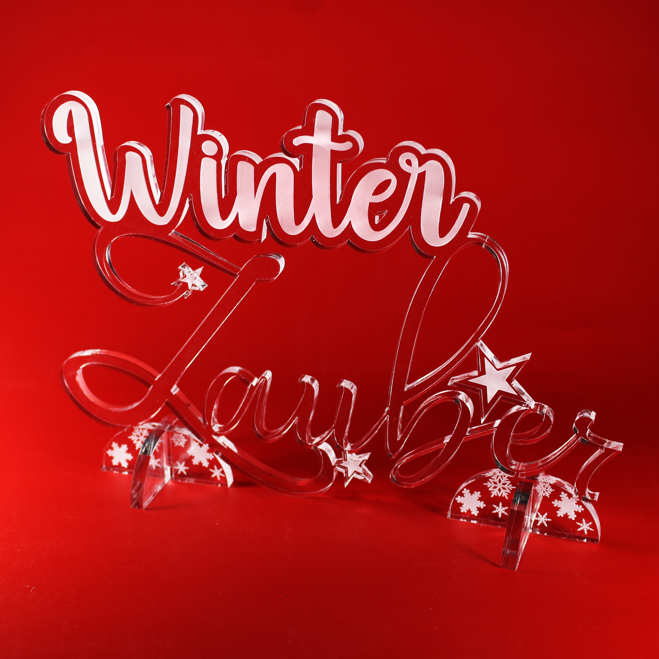 Acryl Aufsteller Winterzauber – weiß gravierter Schriftzug aus klarem Acrylglas