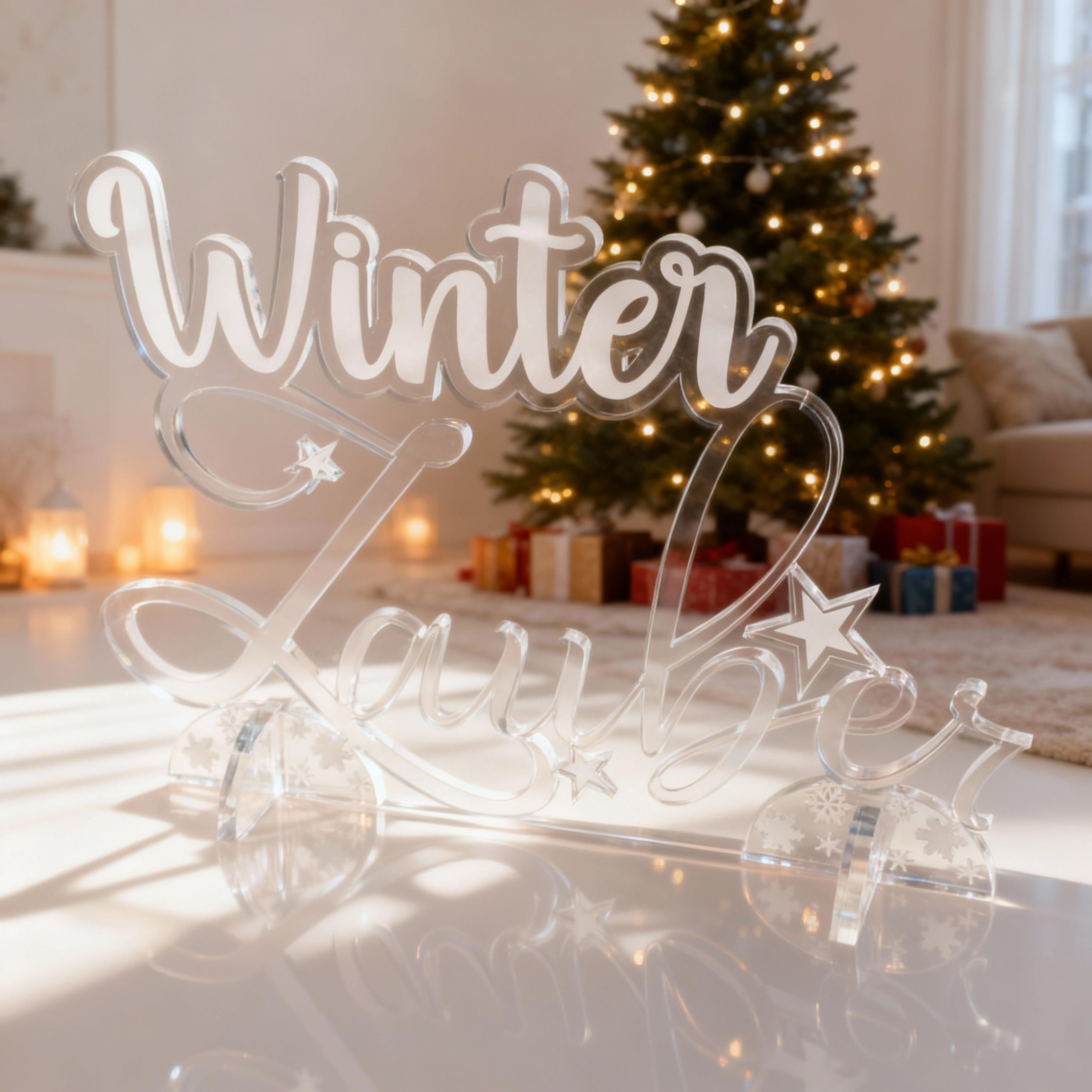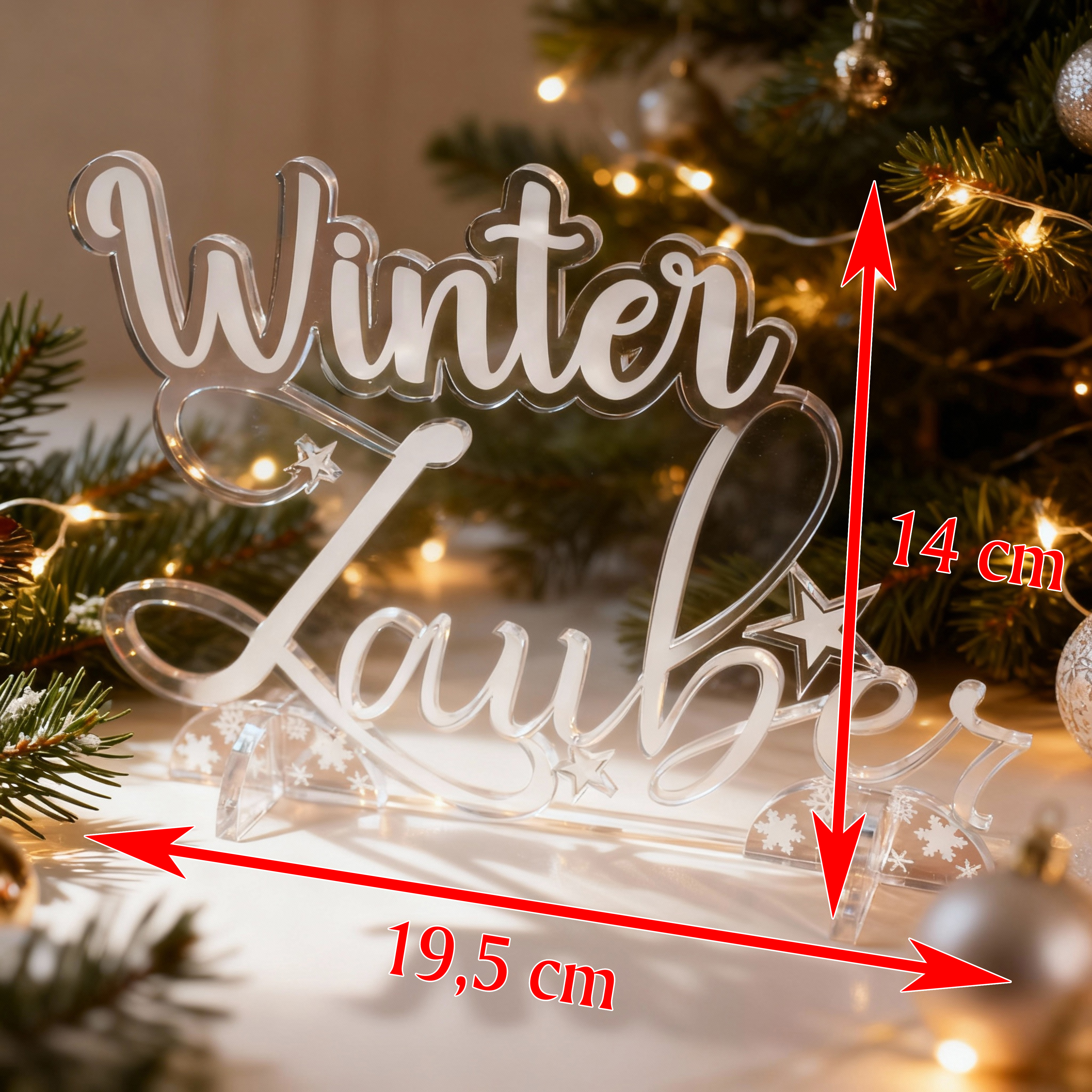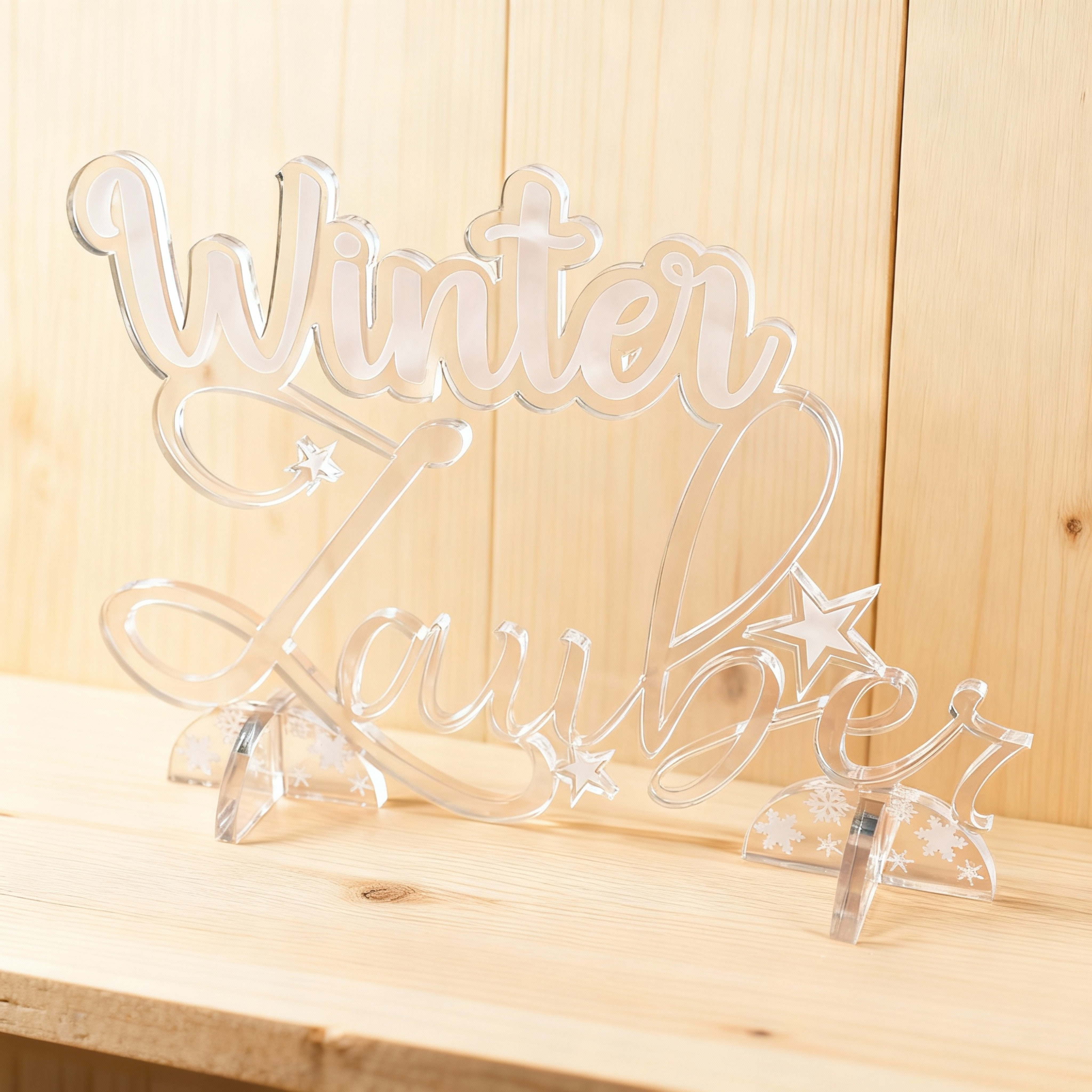 Eleganter Acryl Aufsteller „Winterzauber“ – Stilvoller Schriftzug aus klarem, transparentem Acrylglas mit feiner weißer Gravur. Perfekt für eine winterliche, festliche und moderne Dekoration im Zuhause.