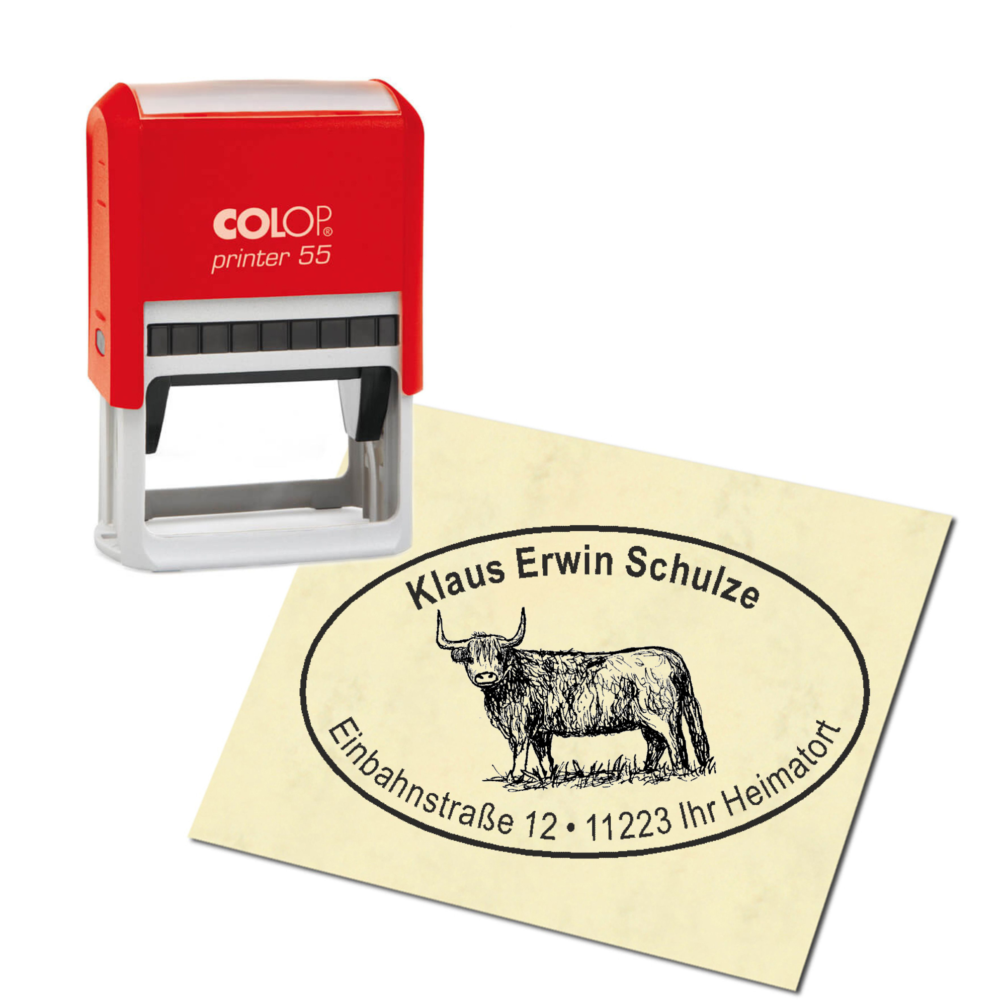 Adressstempel personalisiert Stempel - Schottisches Hochlandrind - oval 59 x 39 mm
