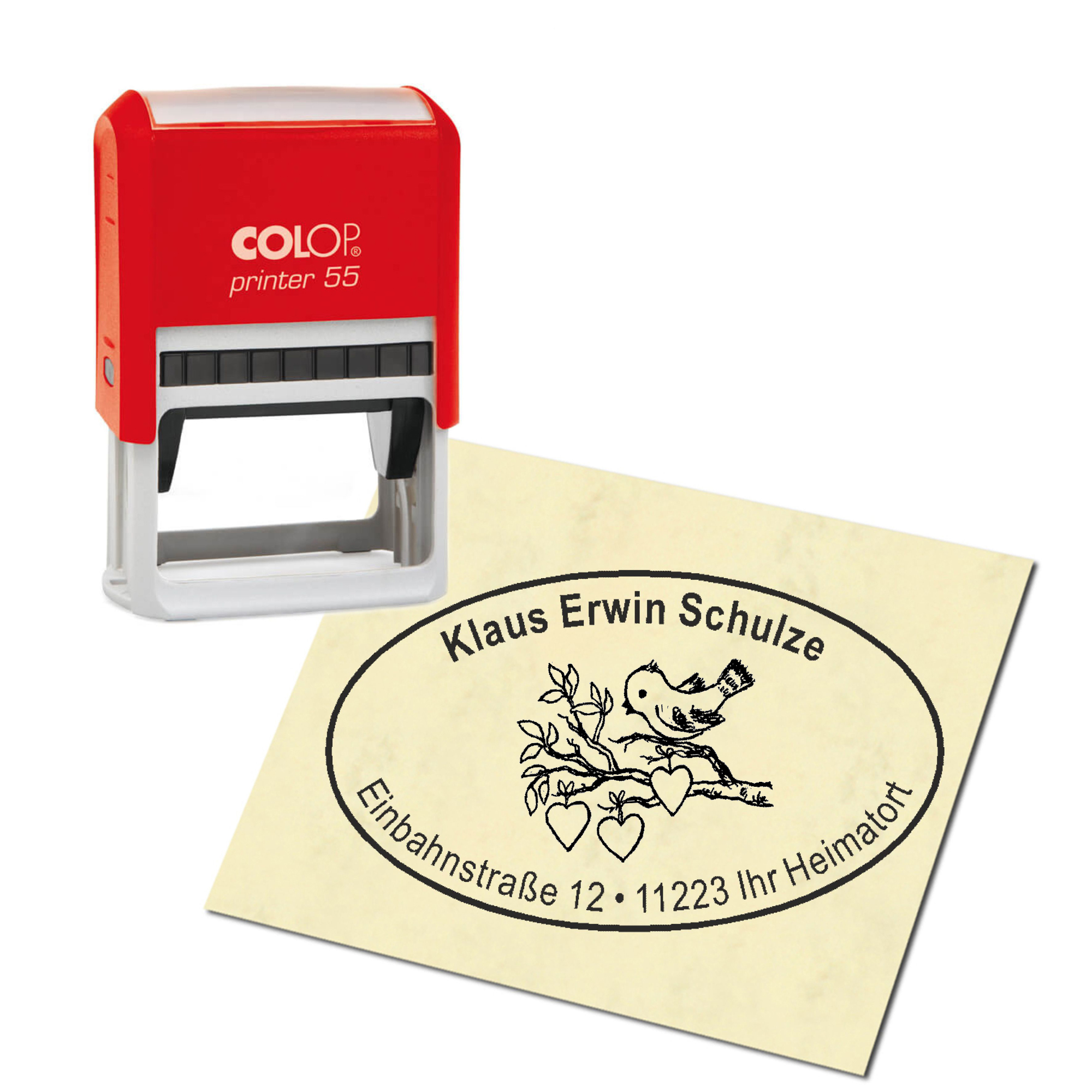 Adressstempel personalisiert Stempel - Vögelchen mit Herzen - oval 59 x 39 mm