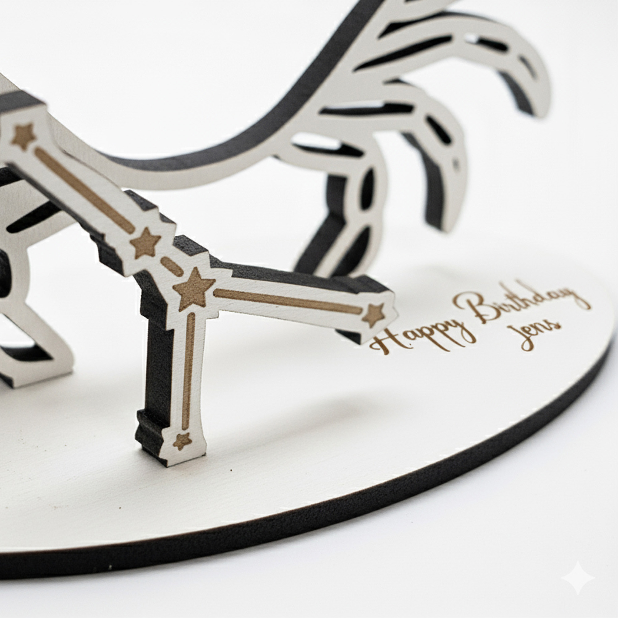 Der ovale Sockel kann auf Wunsch individuell personalisiert werden – ideal für Namen, Daten oder kurze Widmungen. So wird aus jedem Sternzeichen-Aufsteller ein einzigartiges Geschenk mit persönlichem Charakter.