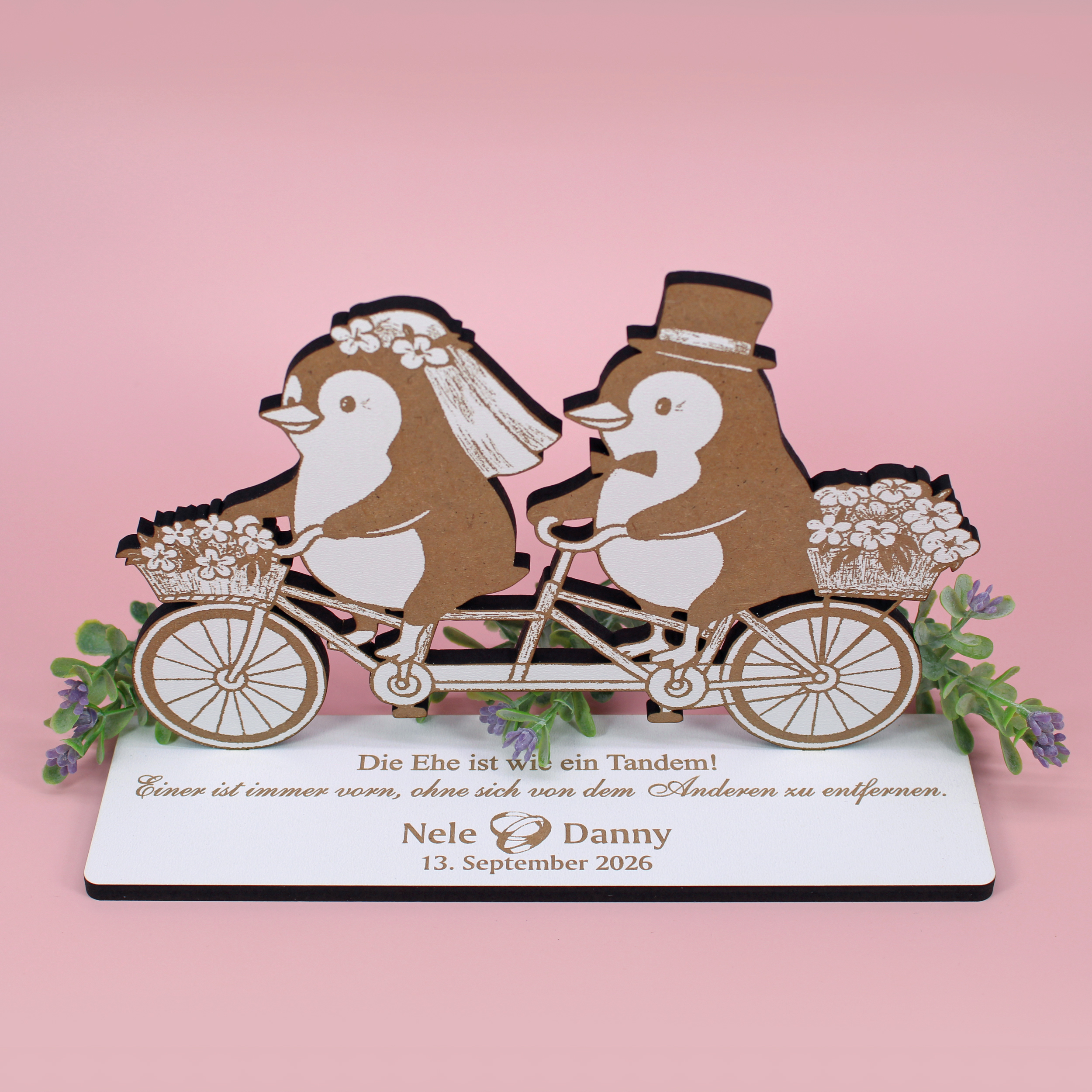 Aufsteller Pinguin Brautpaar auf Tandem mit Spruch - Hochzeitsgeschenk personalisiert mit Namen & Datum 20 x 12 cm