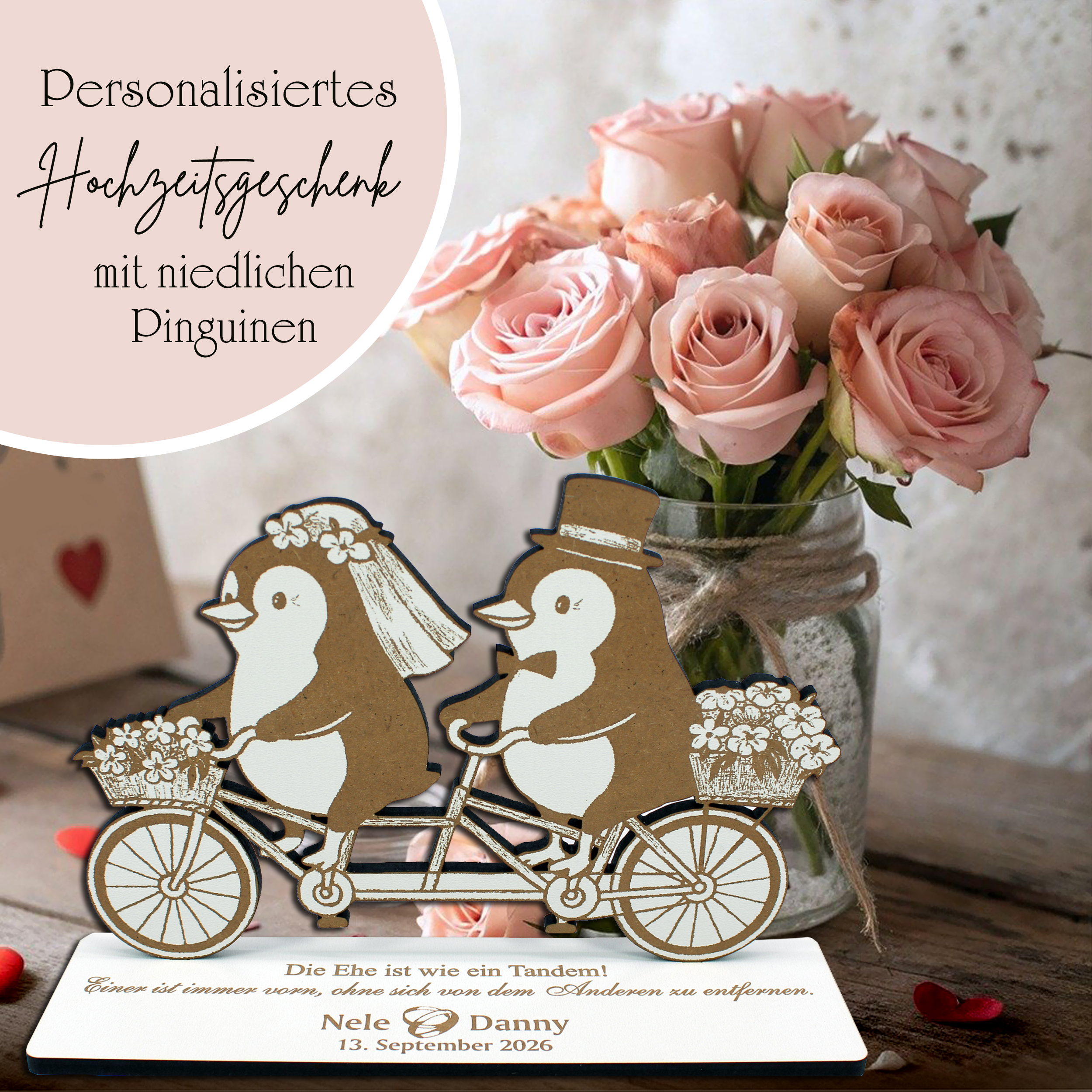 Dieses liebevoll gestaltete Hochzeitsgeschenk mit Gravur zeigt zwei süße Pinguine als Braut und Bräutigam auf einem Tandem – ein Symbol für Teamgeist, Vertrauen und lebenslange Liebe.