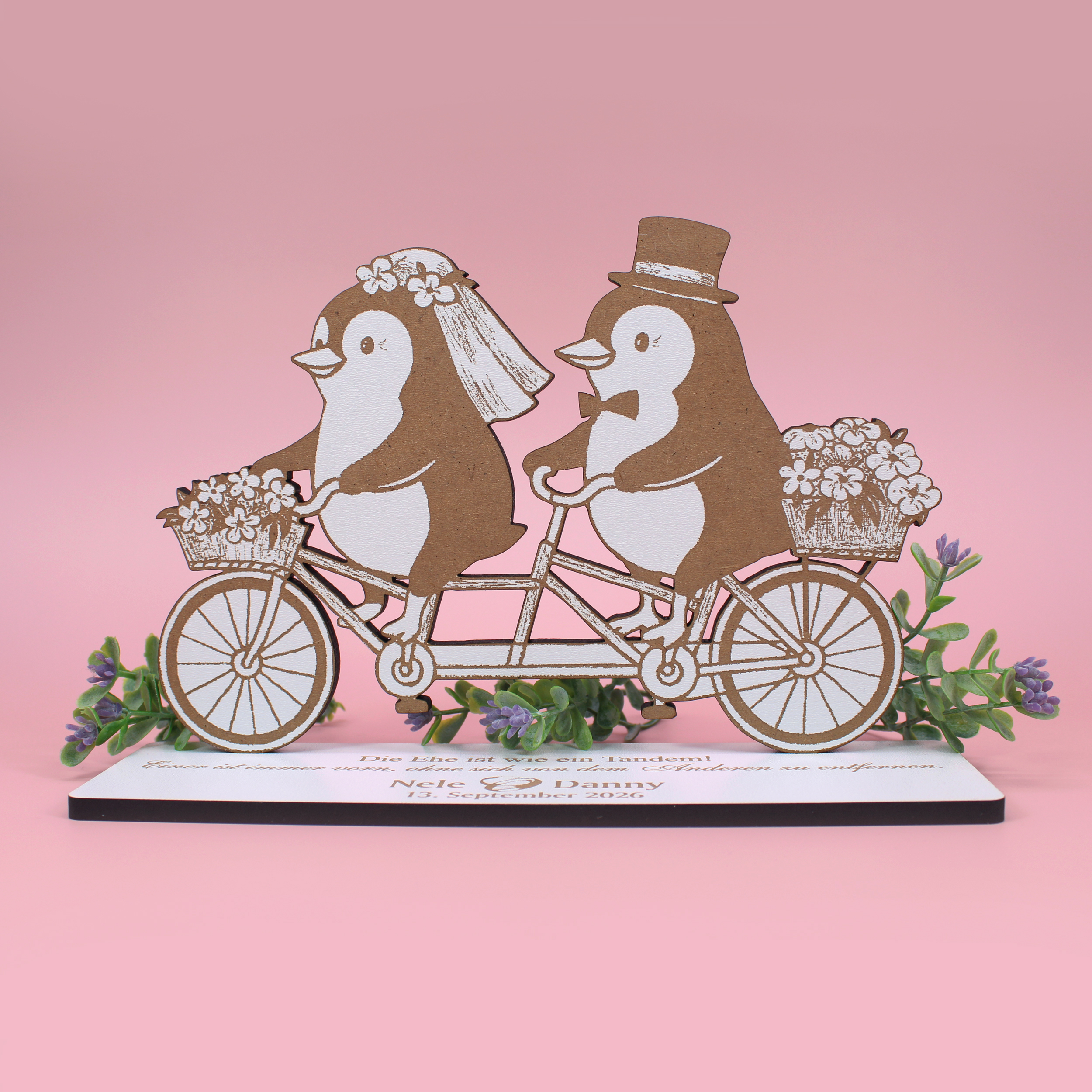 Hochzeitsgeschenk Pinguin-Brautpaar auf Tandem: Ein liebevoll gestalteter Holz-Aufsteller mit zwei Pinguinen als Braut und Bräutigam auf einem Tandem. Perfekt als Hochzeitsgeschenk, Verlobungsgeschenk oder Deko für das Brautpaar – symbolisch für Zusammenhalt und Liebe.