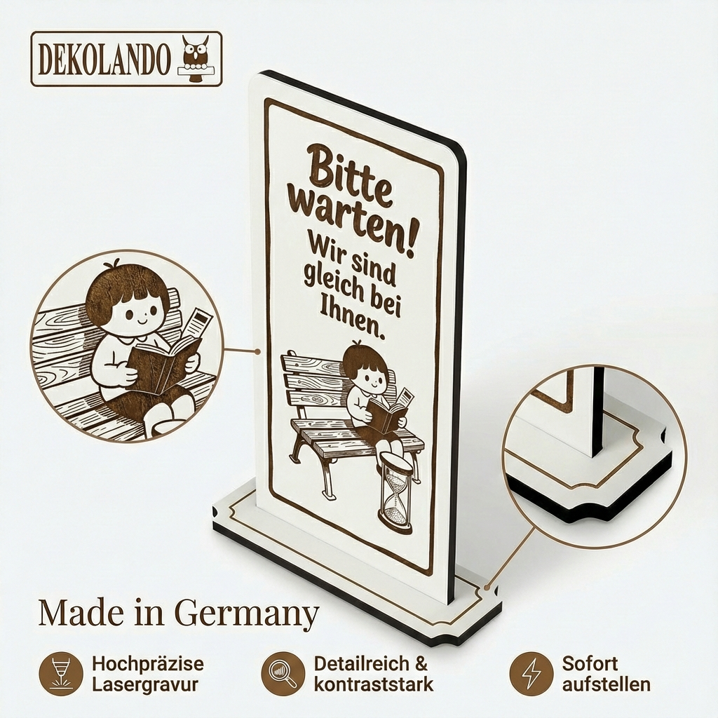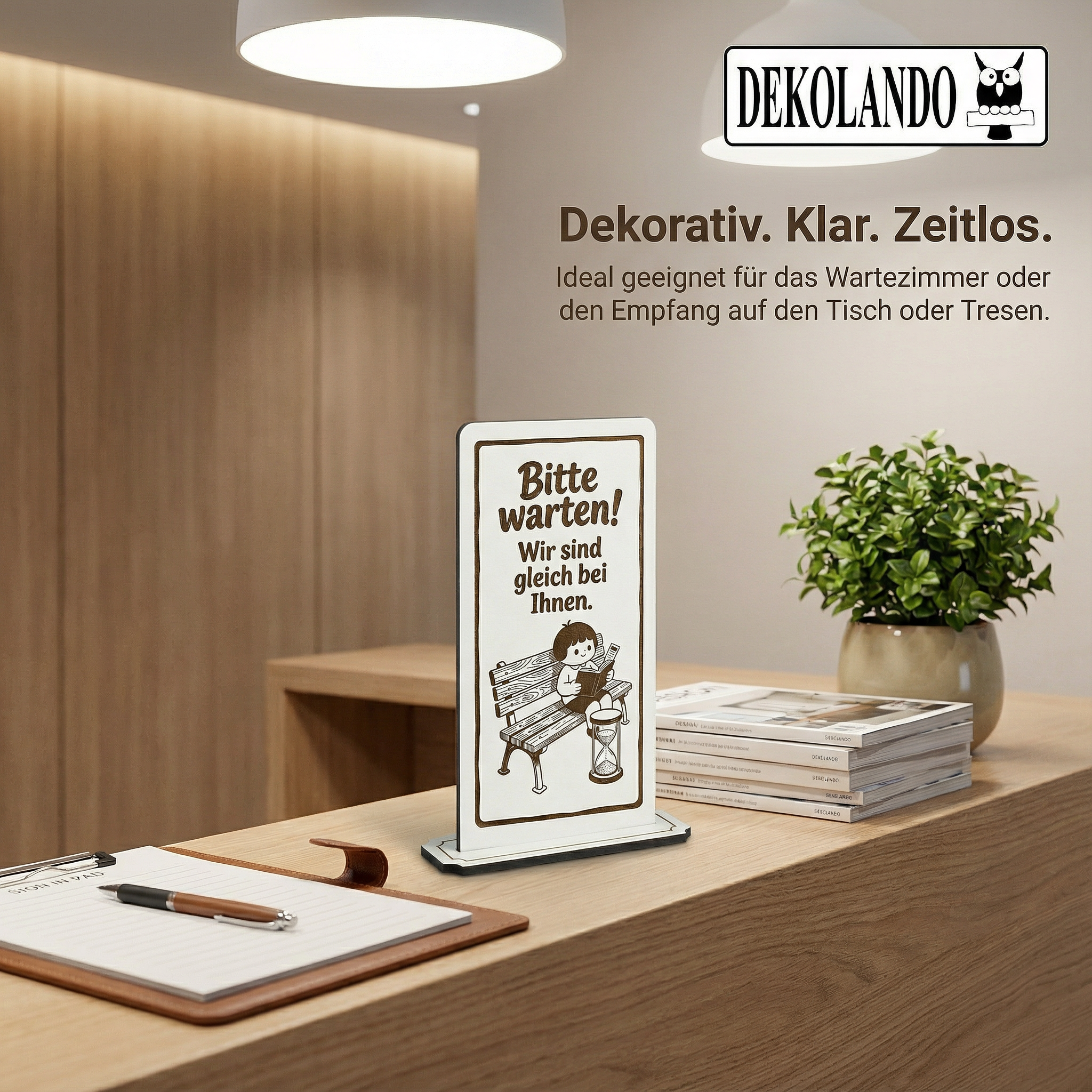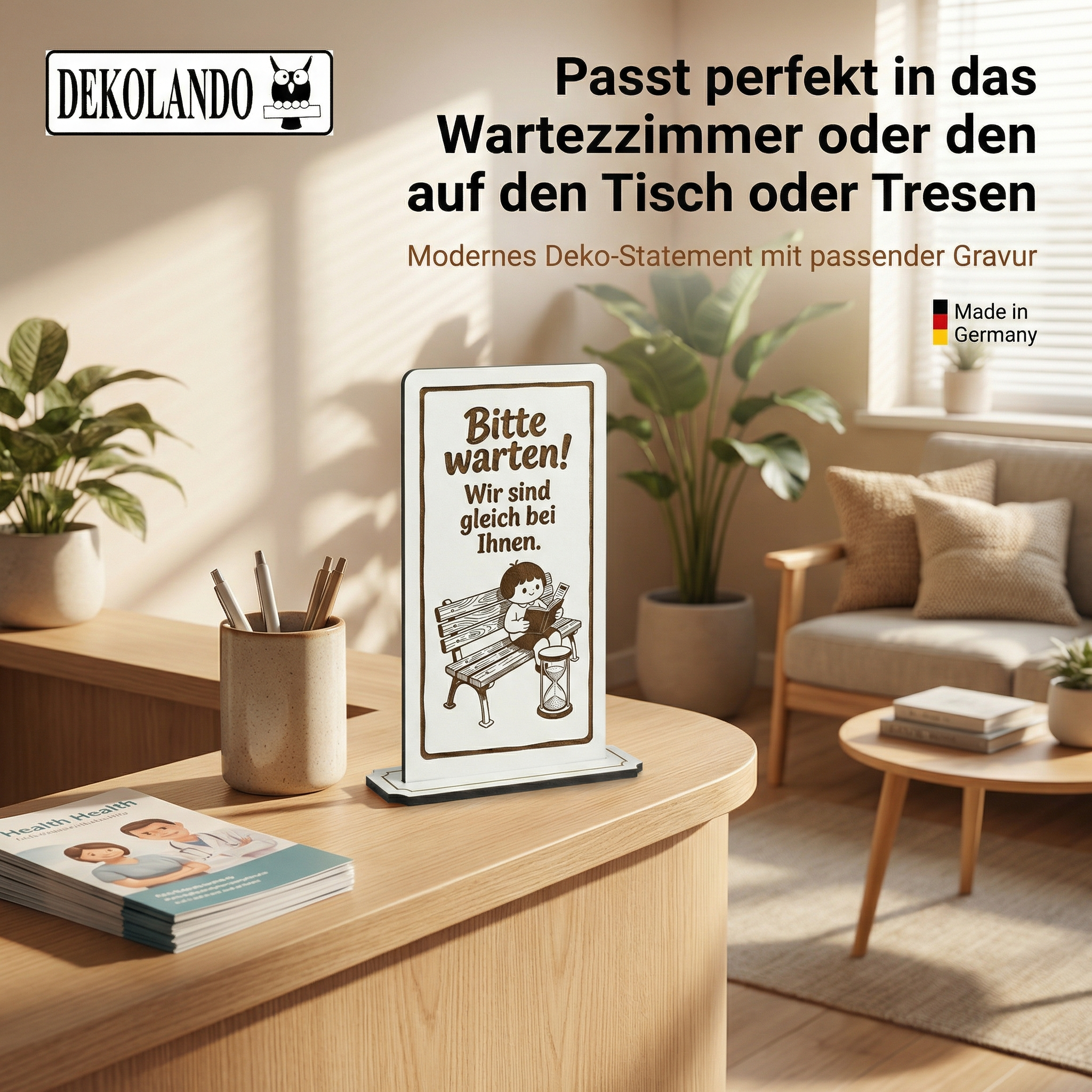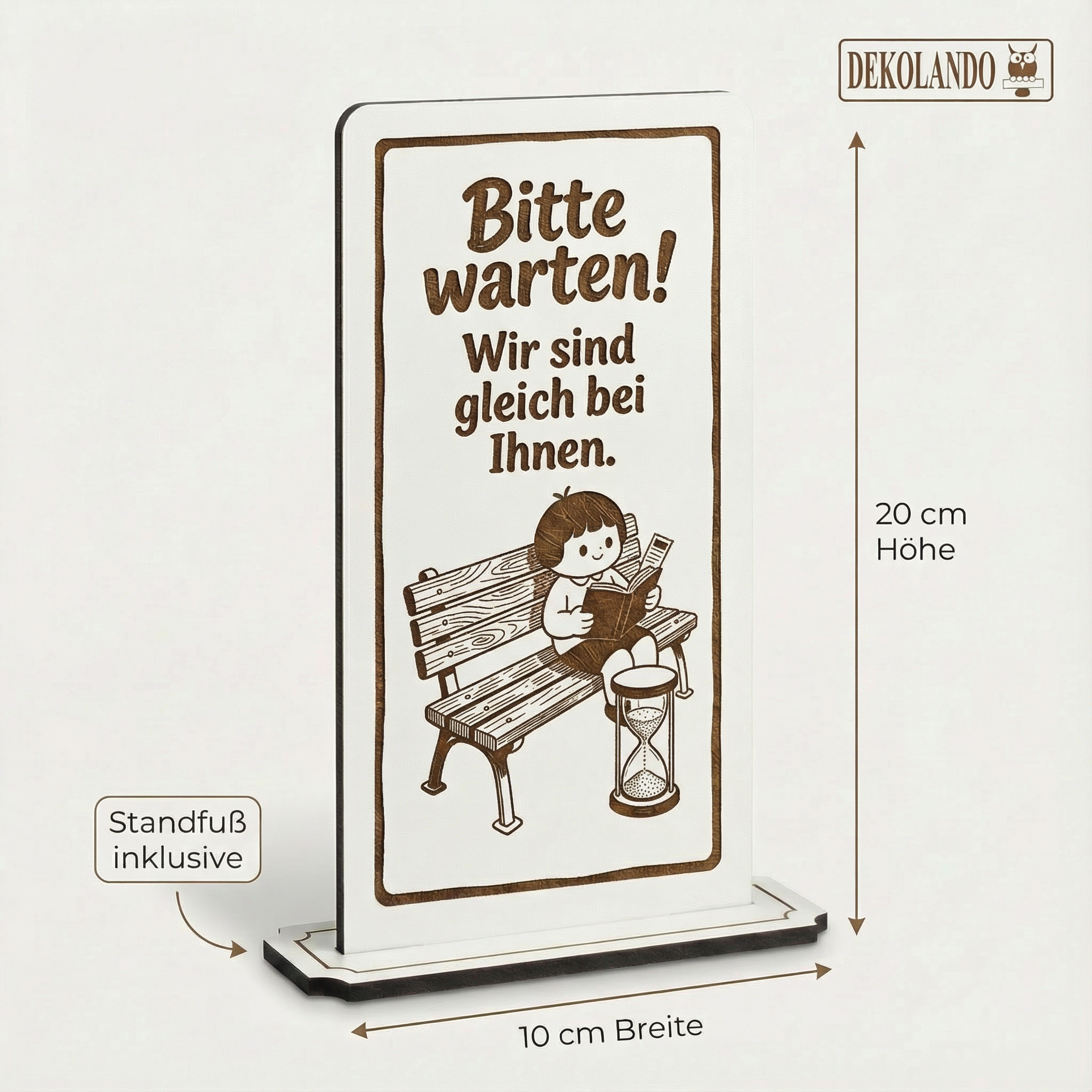 - MOTIV BITTE WARTEN: Aufsteller Schild mit Gravur „Bitte warten! Wir rufen Sie auf.“ – gut sichtbar am Empfang, Tresen, Praxis oder Kundenannahme.