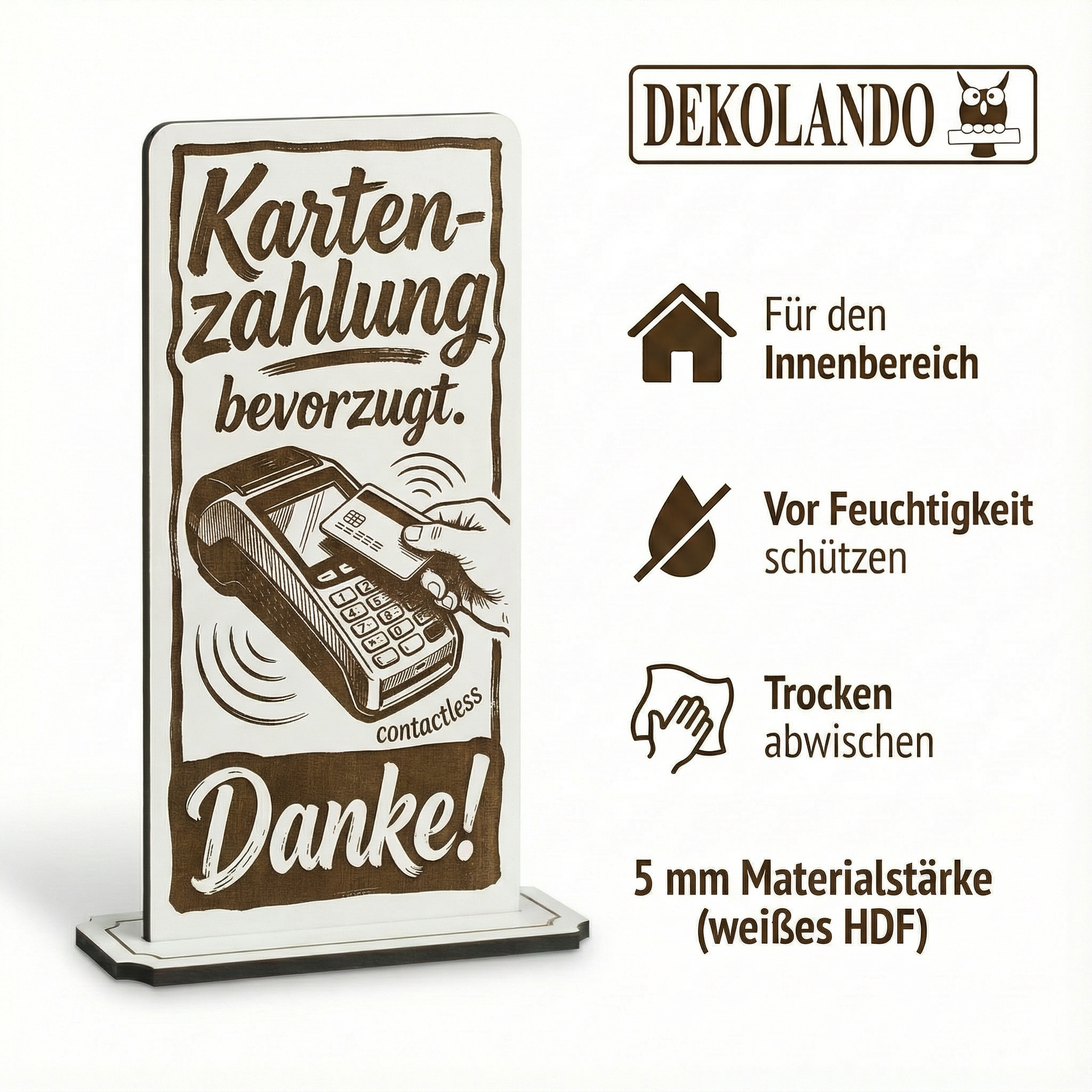 WICHTIGER HINWEIS (HDF): HDF ist nicht wasserfest – bitte vor Feuchtigkeit/Nässe schützen und nicht dauerhaft feucht reinigen; so bleibt der Aufsteller lange schön