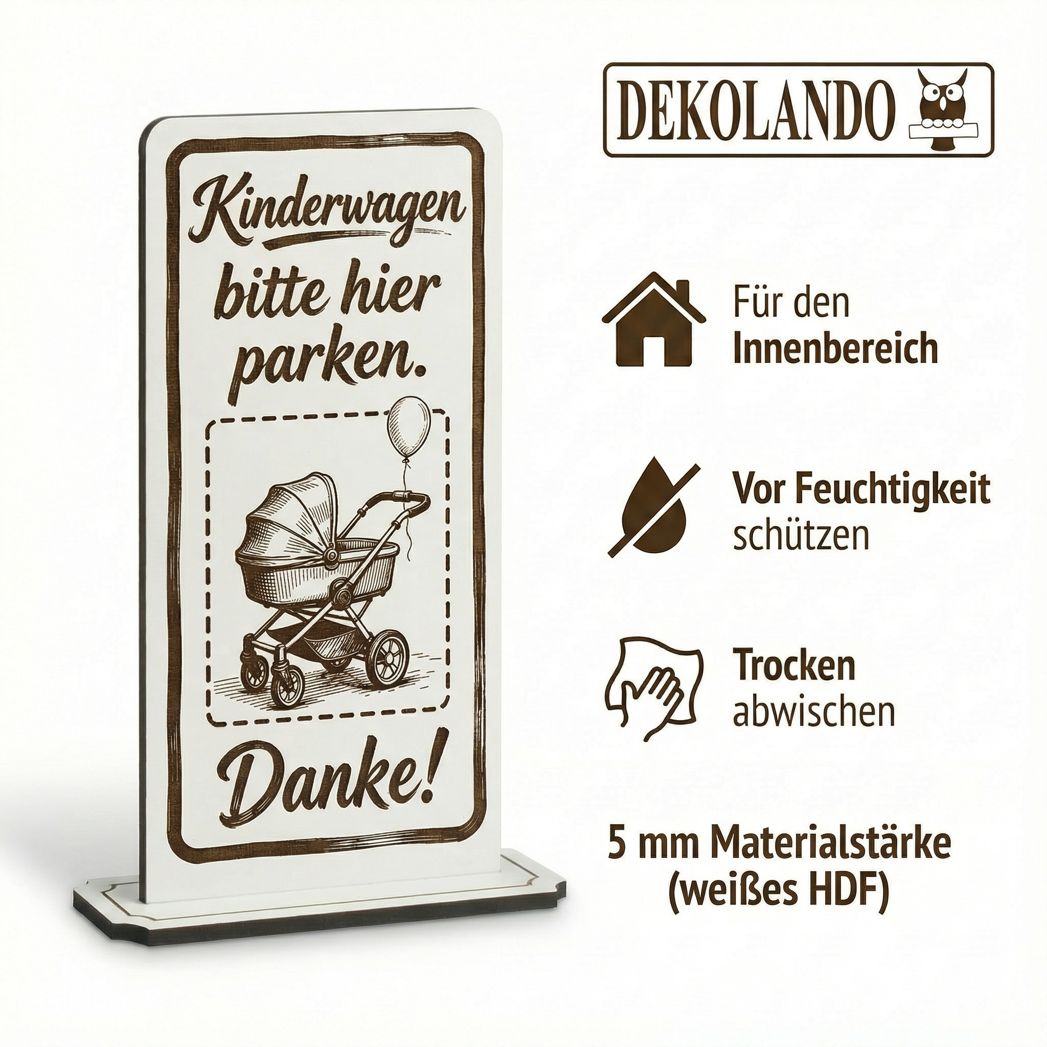 WICHTIGER HINWEIS (HDF): HDF ist nicht wasserfest – bitte vor Feuchtigkeit/Nässe schützen und nicht dauerhaft feucht reinigen; so bleibt der Aufsteller lange schön
