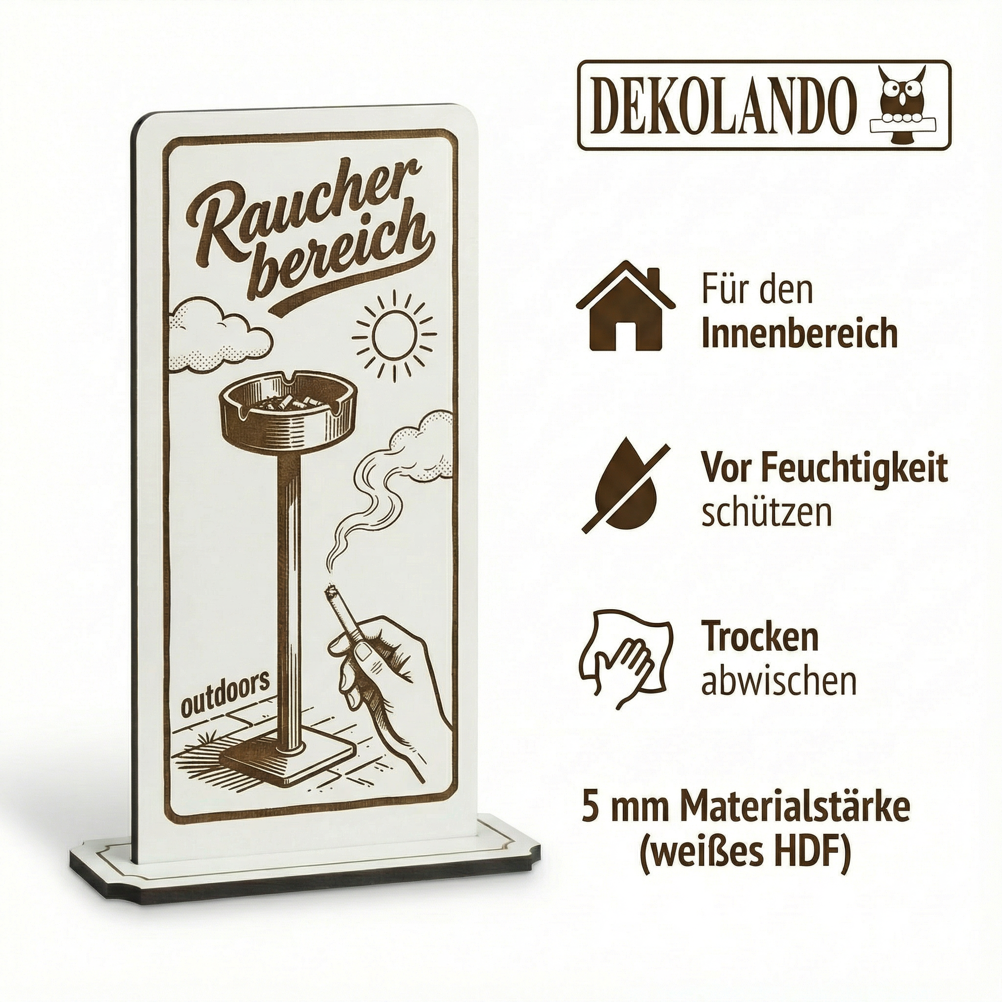 WICHTIGER HINWEIS (HDF): HDF ist nicht wasserfest – bitte vor Feuchtigkeit/Nässe schützen und nicht dauerhaft feucht reinigen; so bleibt der Aufsteller lange schön