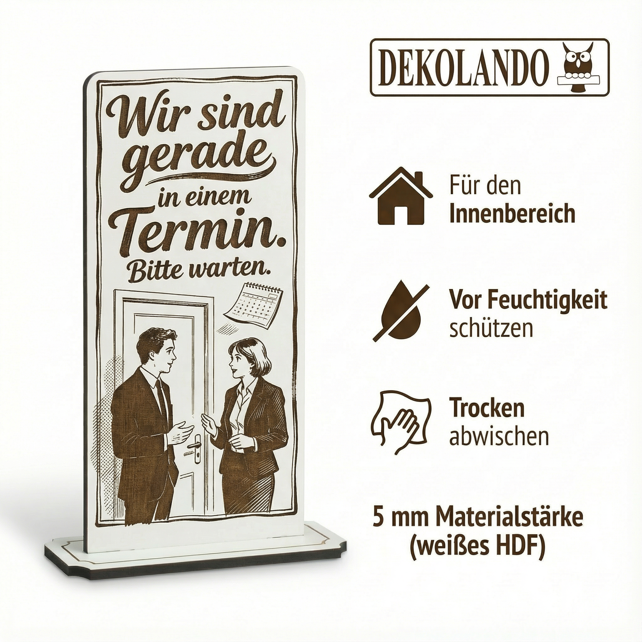 WICHTIGER HINWEIS (HDF): HDF ist nicht wasserfest – bitte vor Feuchtigkeit/Nässe schützen und nicht dauerhaft feucht reinigen; so bleibt der Aufsteller lange schön