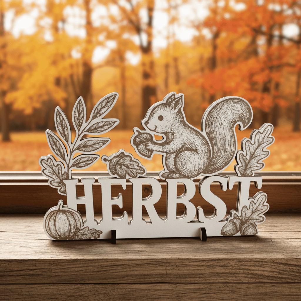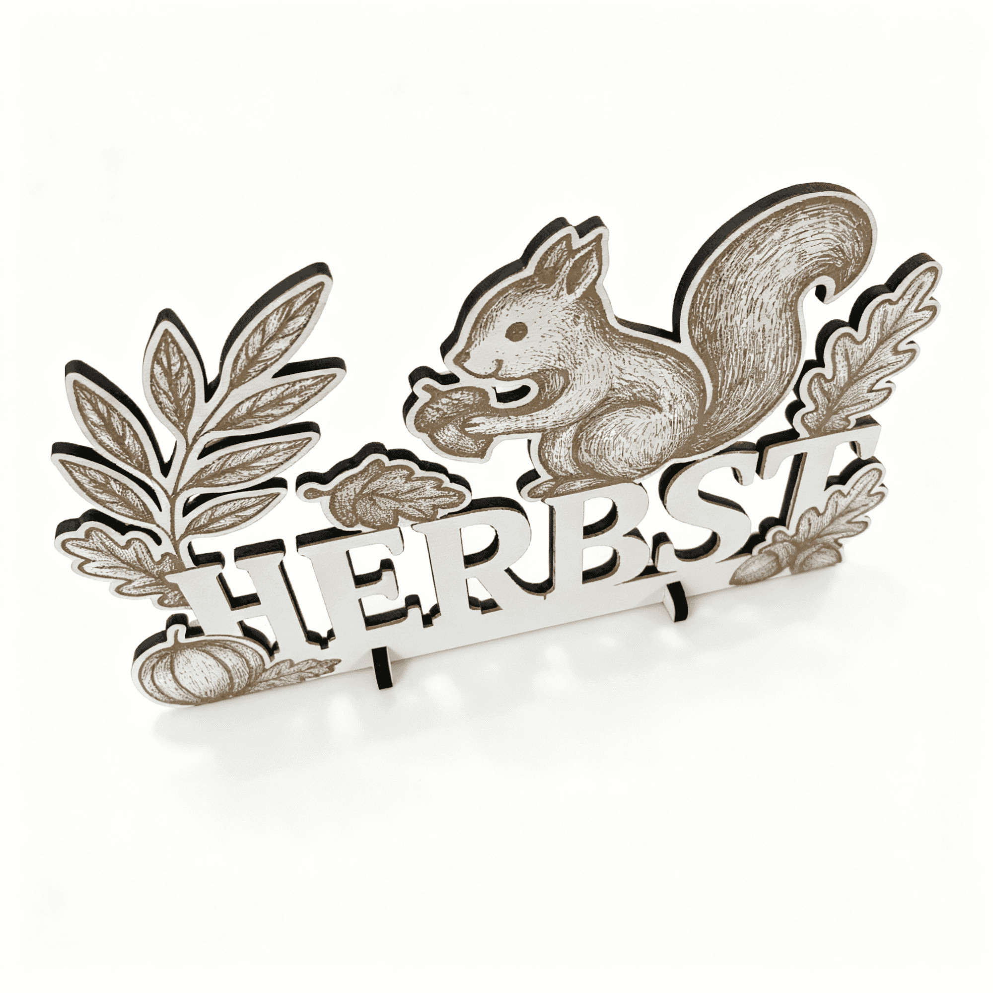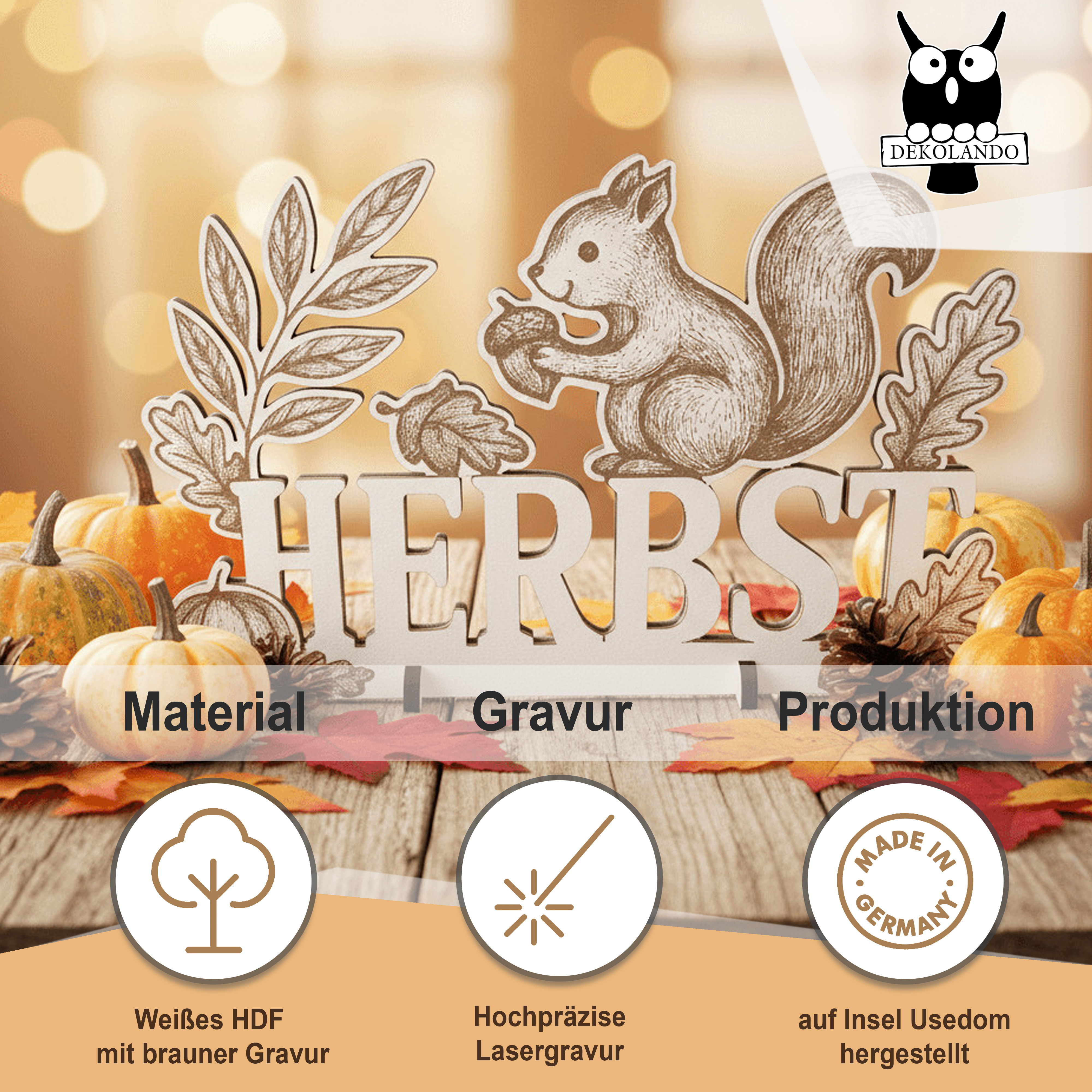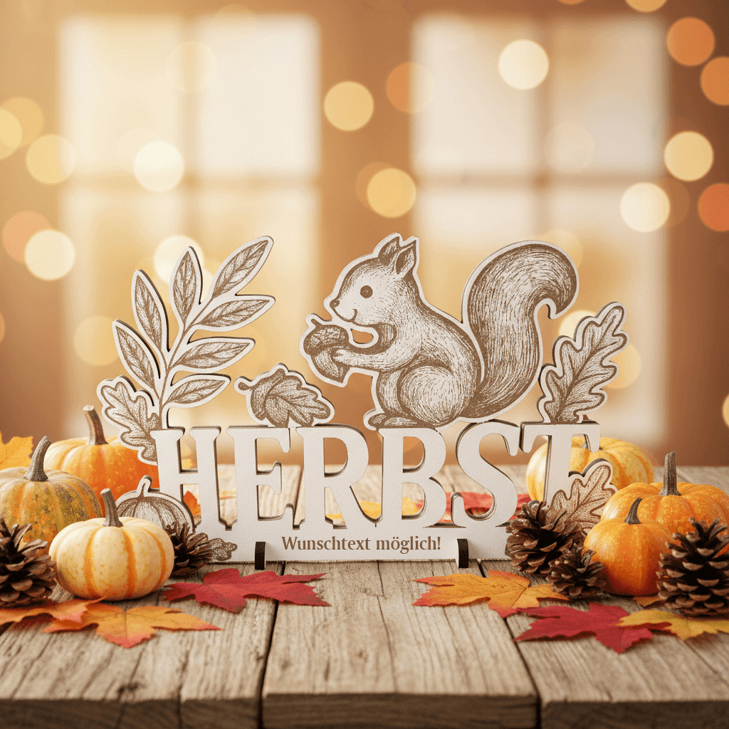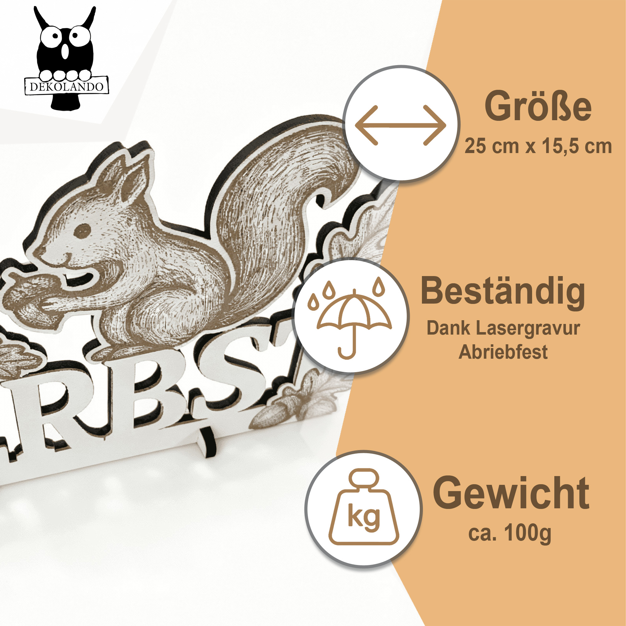 Aufsteller Schriftzug HERBST mit Eichhörnchen Nüssen Blätter Kürbis – dekorativer herbstlicher Dekoaufsteller