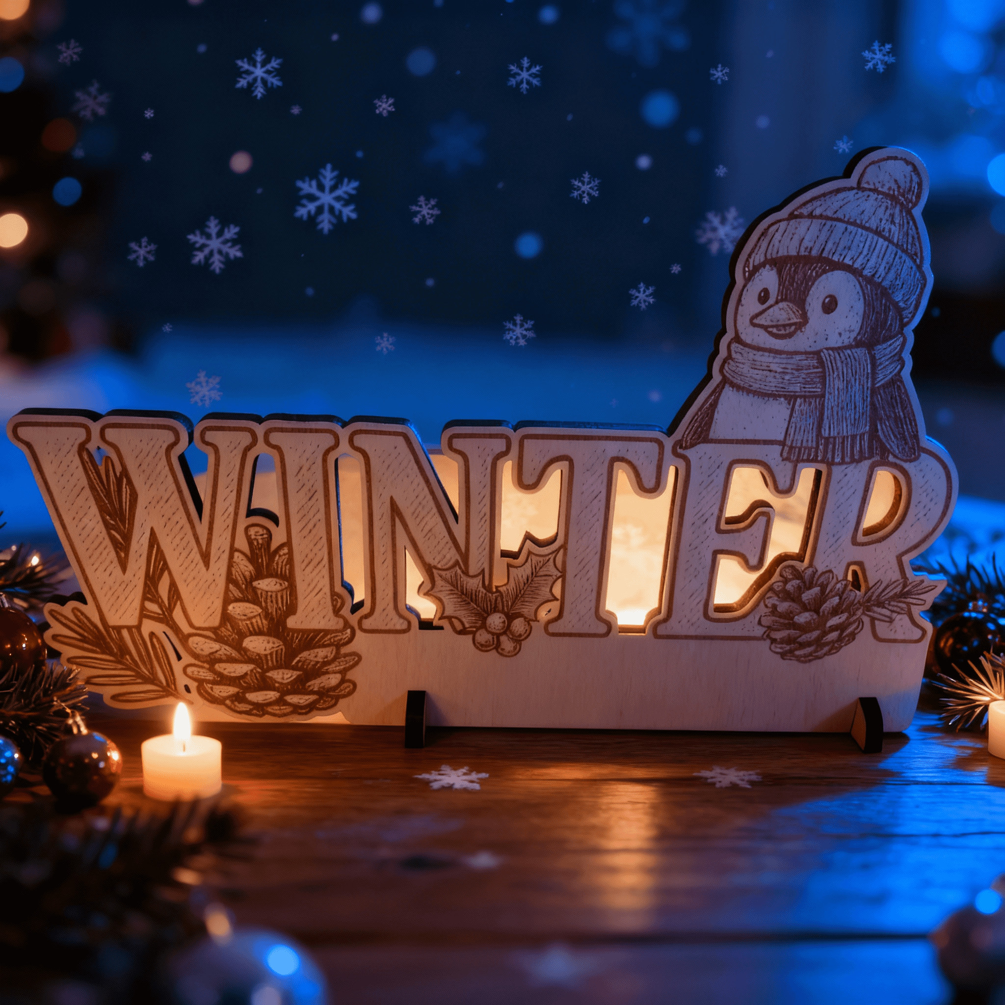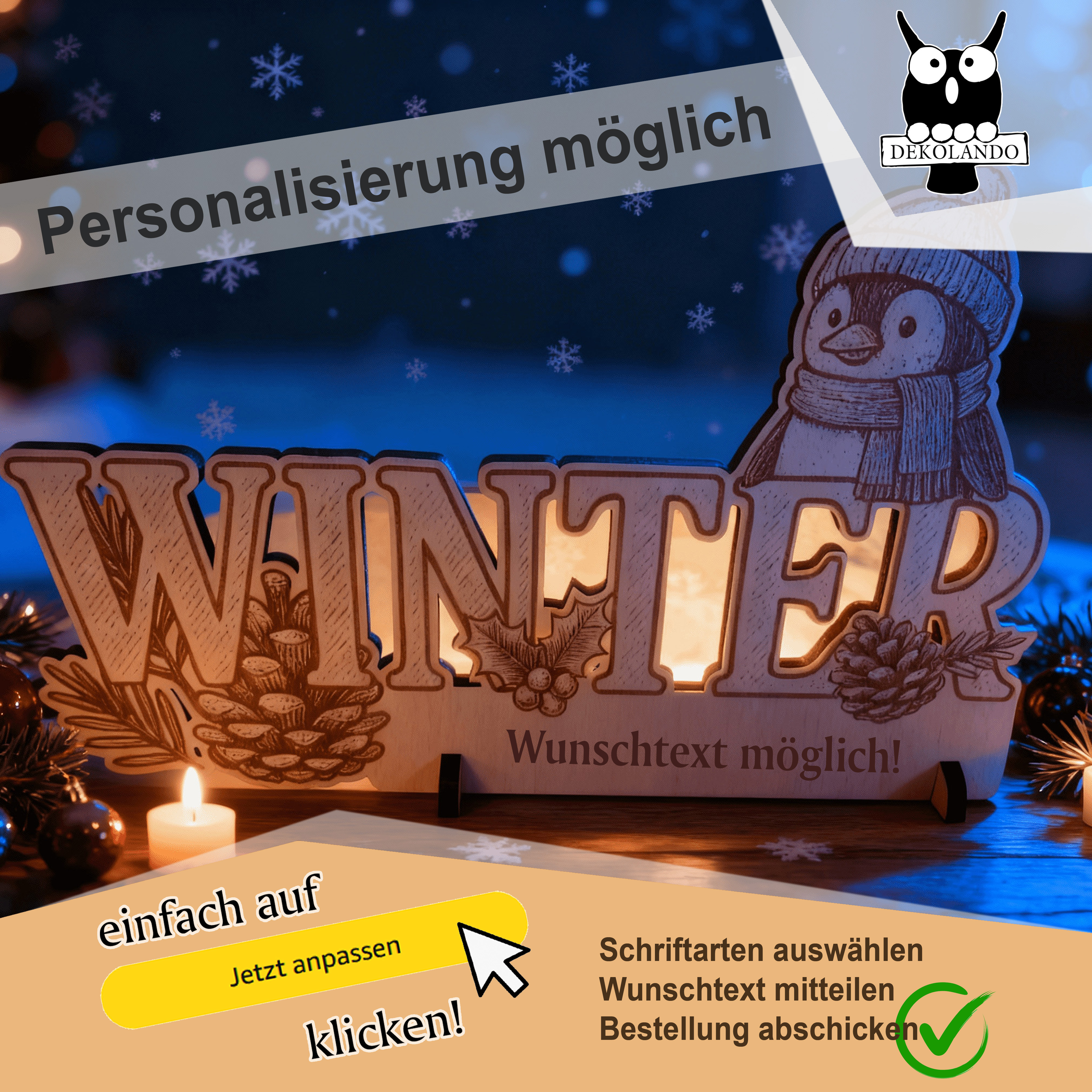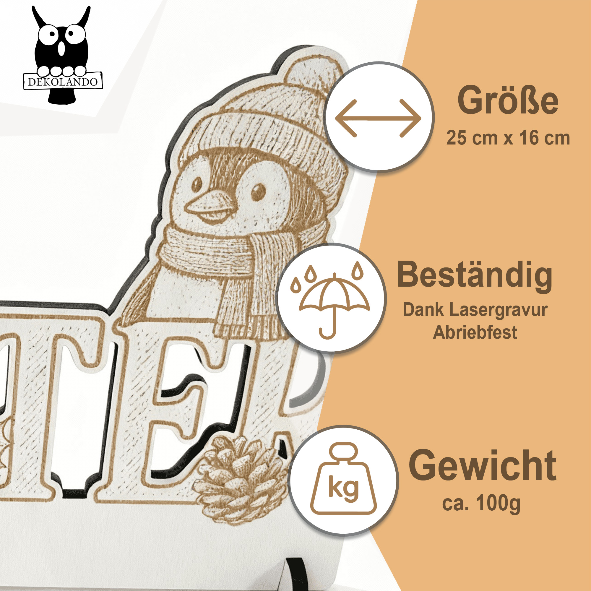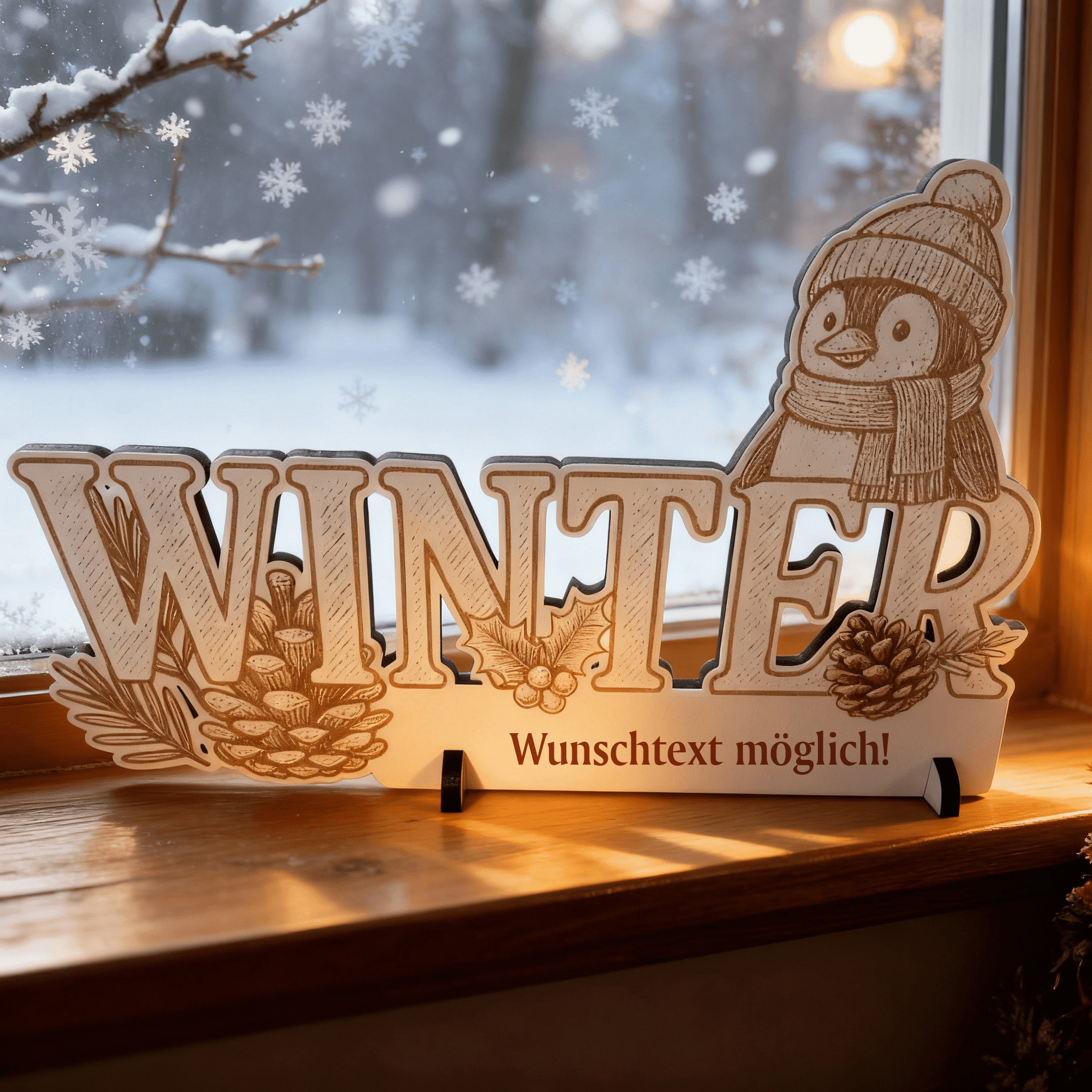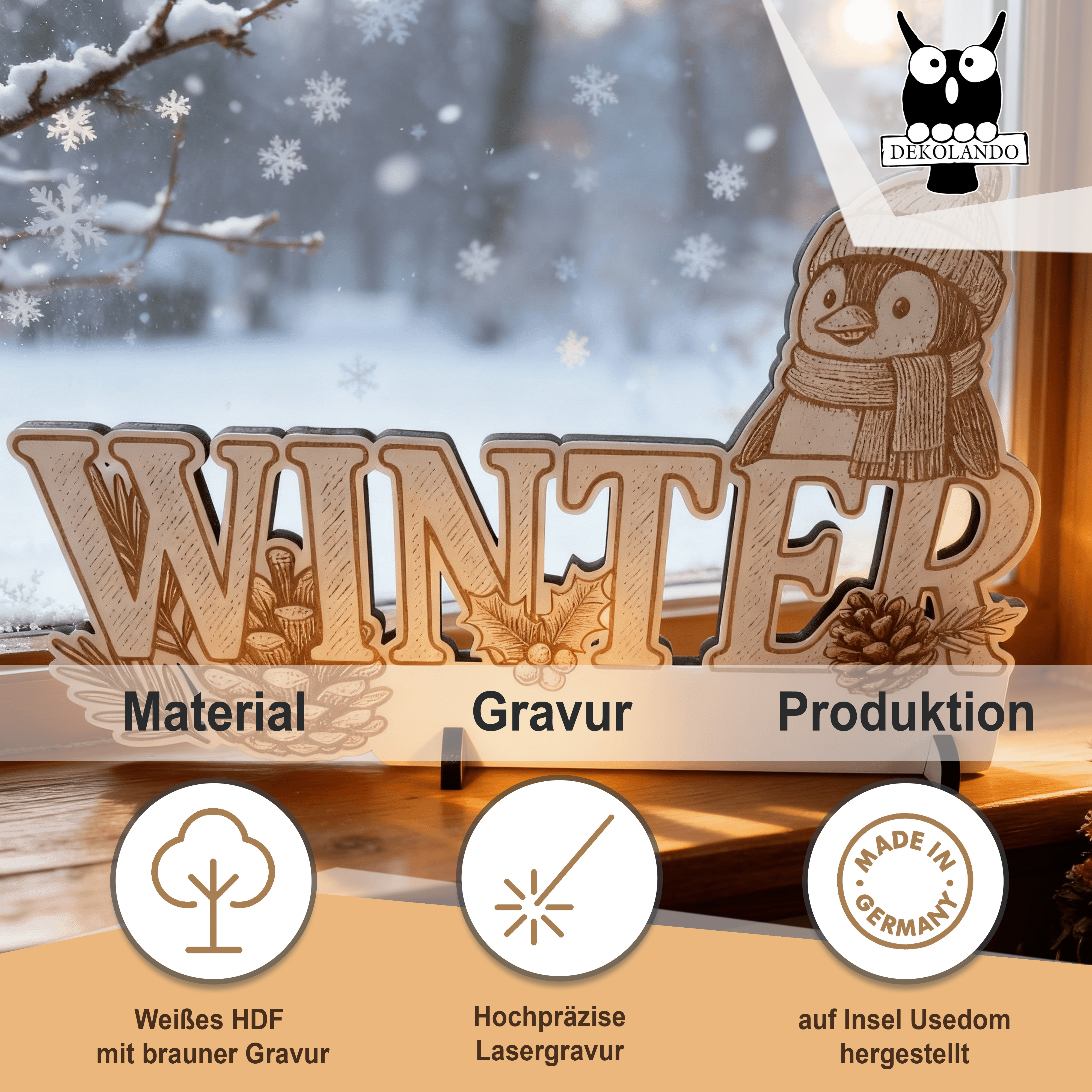 Aufsteller Schriftzug WINTER mit Pinguin, Zweigen & Zapfen – dekorativer winterlicher Dekoaufsteller