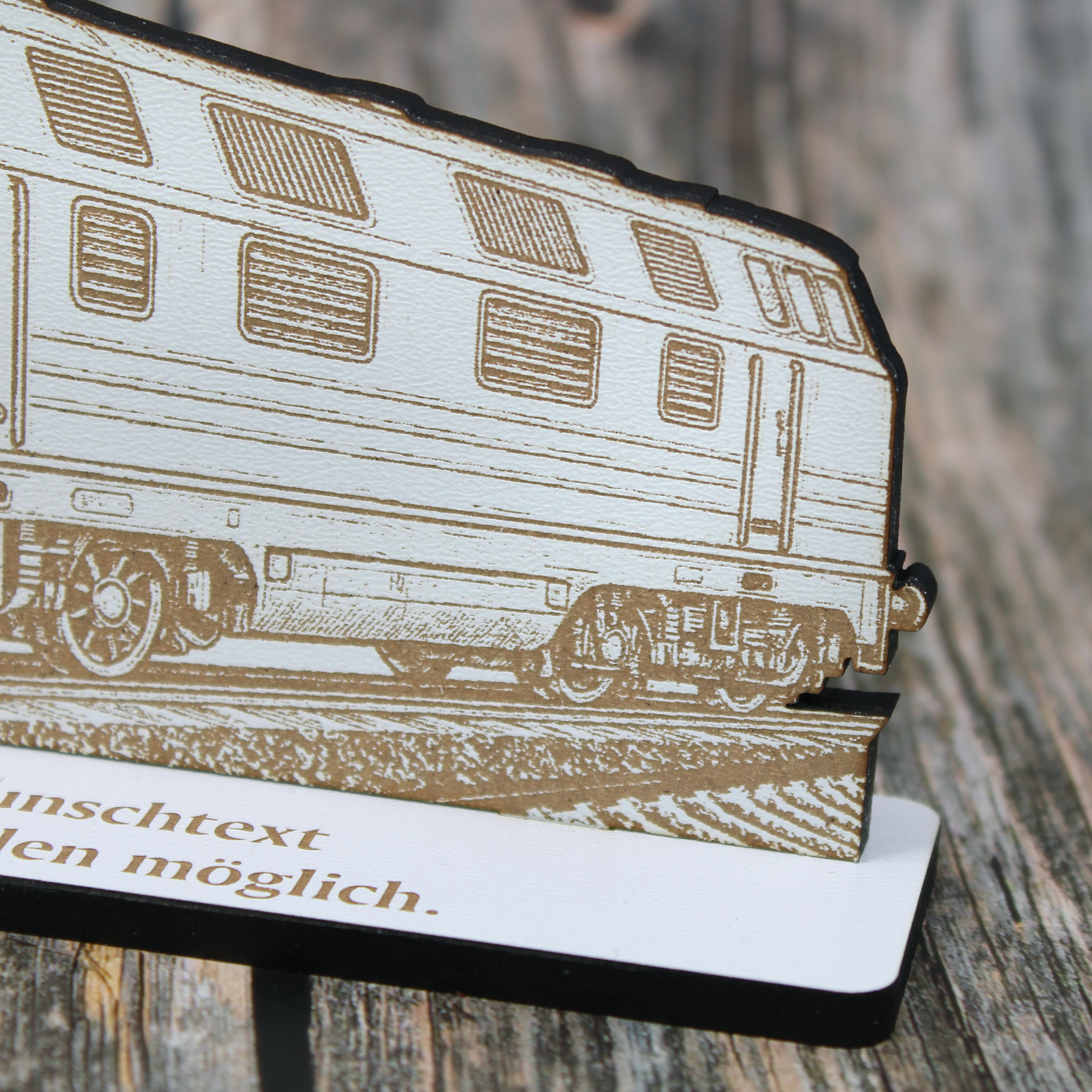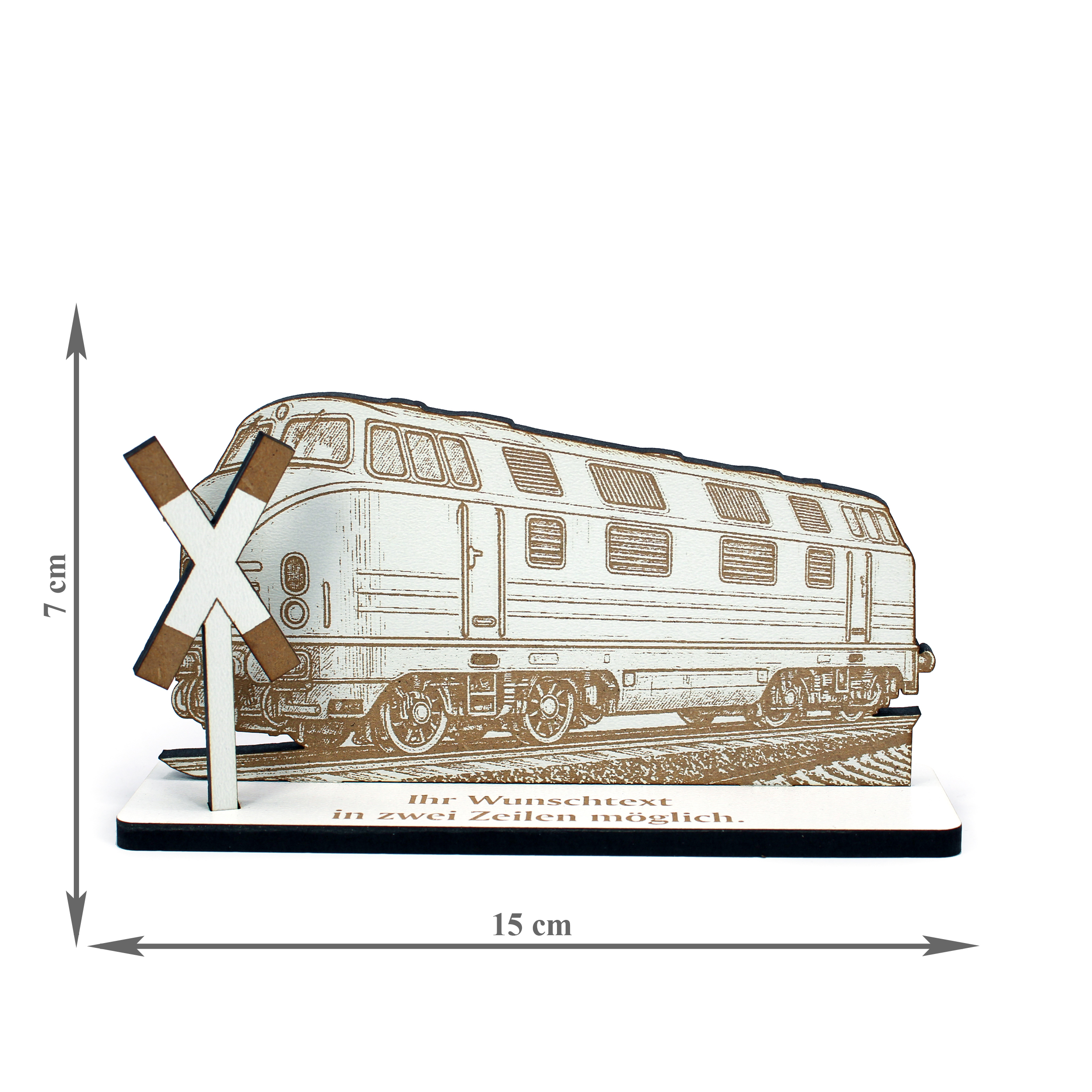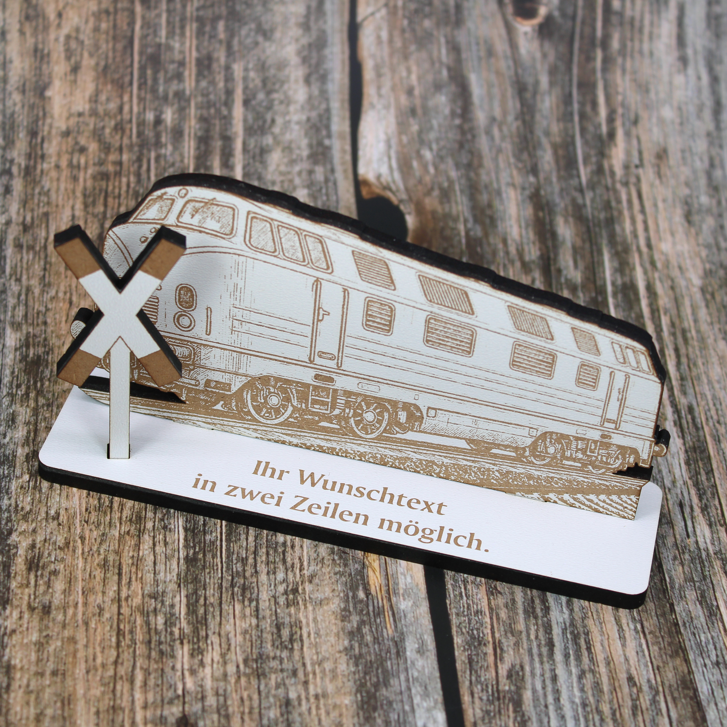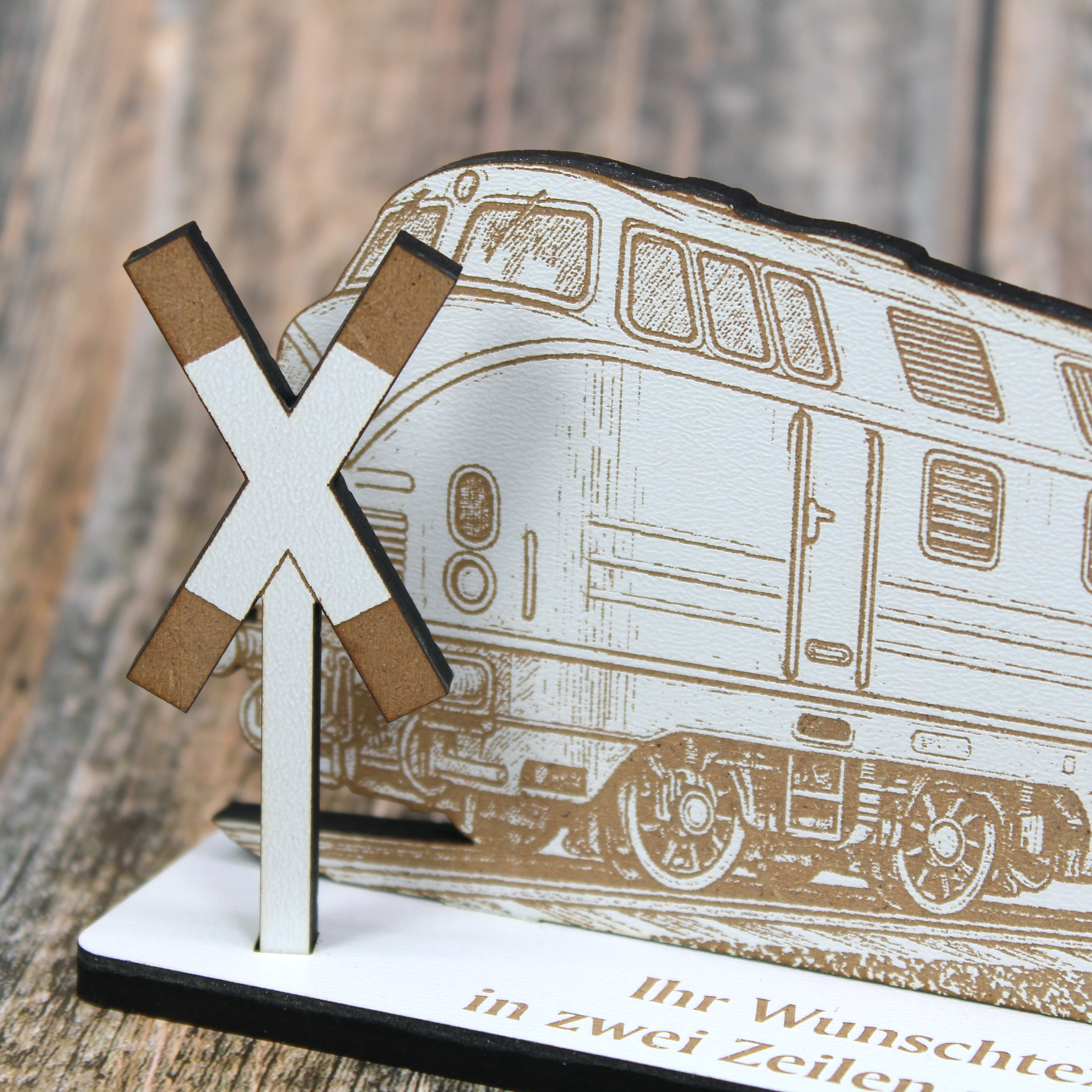 - V200 Diesellok Geschenk 15x7 cm – Moderner HDF Dekoaufsteller mit filigraner Gravur und personalisierbarem Sockel – perfekt für Eisenbahn- & Zugliebhaber.