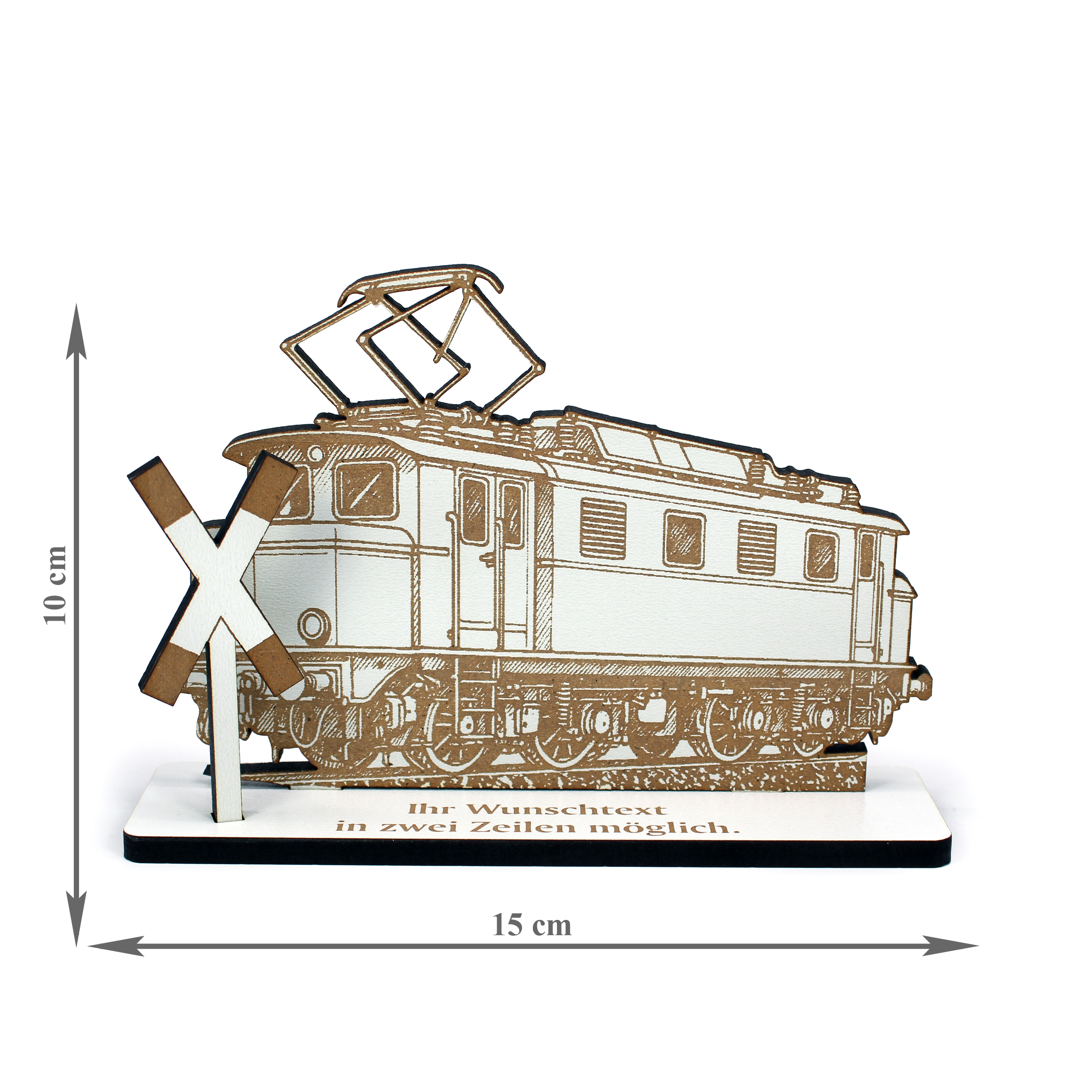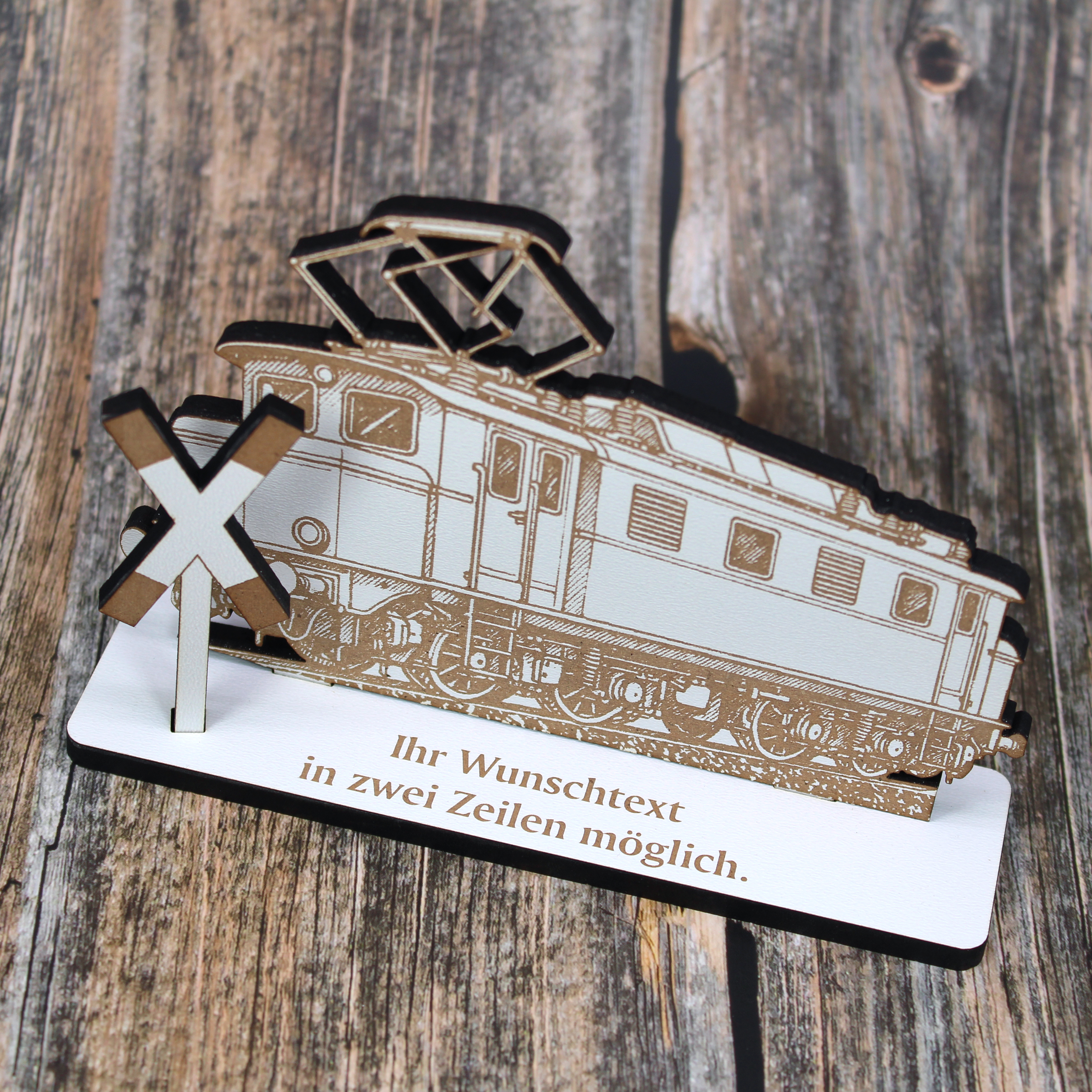 - Alte E-Lok Geschenk 15x10 cm – Moderner HDF Dekoaufsteller mit filigraner Gravur und personalisierbarem Sockel – perfekt für Eisenbahn- & Zugliebhaber.