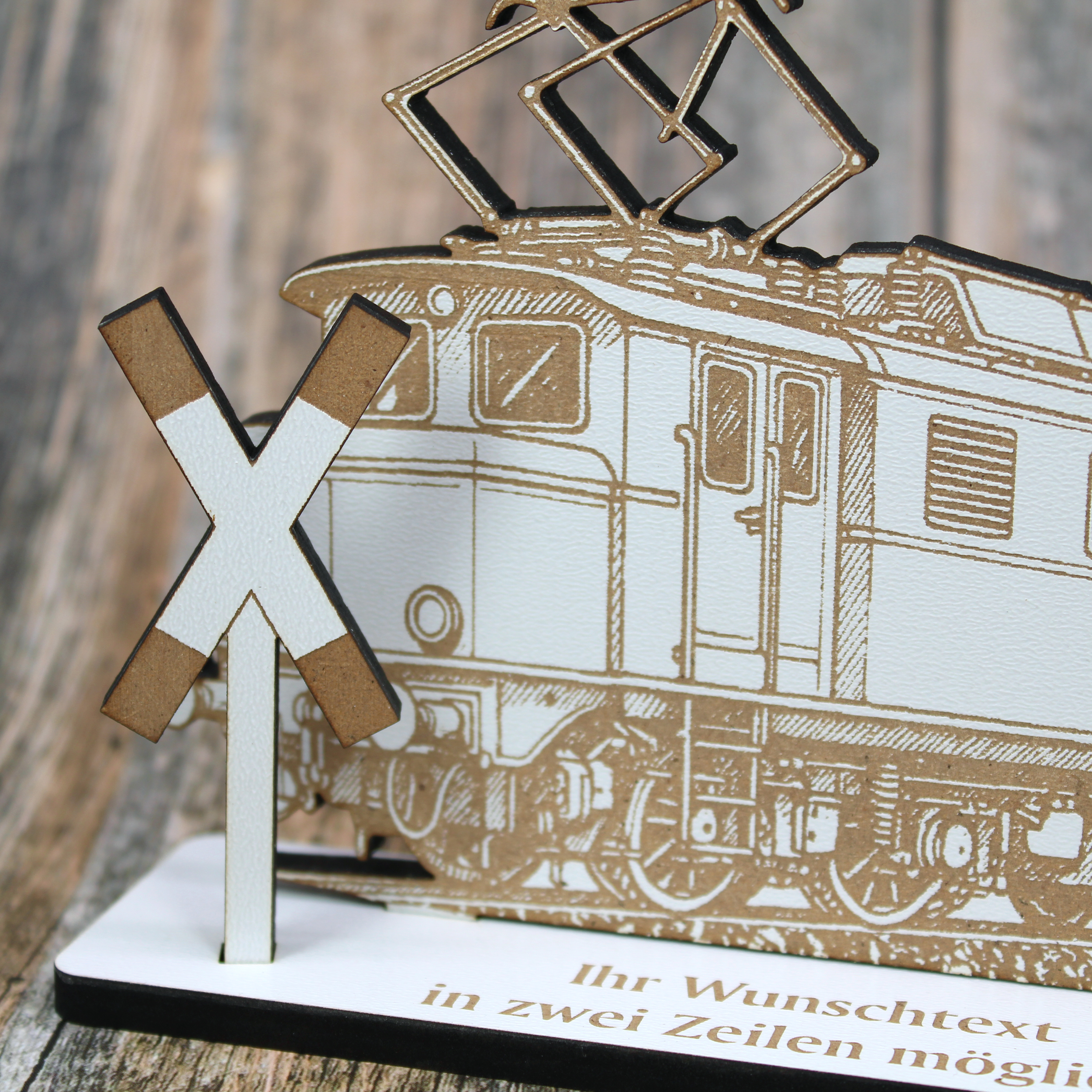 Der Aufsteller ist das ideale Geschenk für alle, die historische Züge, klassische Lokomotiven und filigrane Dekoration lieben. Dieser hochwertige Aufsteller zeigt eine nostalgische Lok sowie ein charakteristisches Andreaskreuz – perfekt dargestellt in feiner brauner Lasergravur auf weißem HDF. Durch diese Kombination entsteht ein edles, kontrastreiches Design, das Eisenbahnfreunde begeistert.