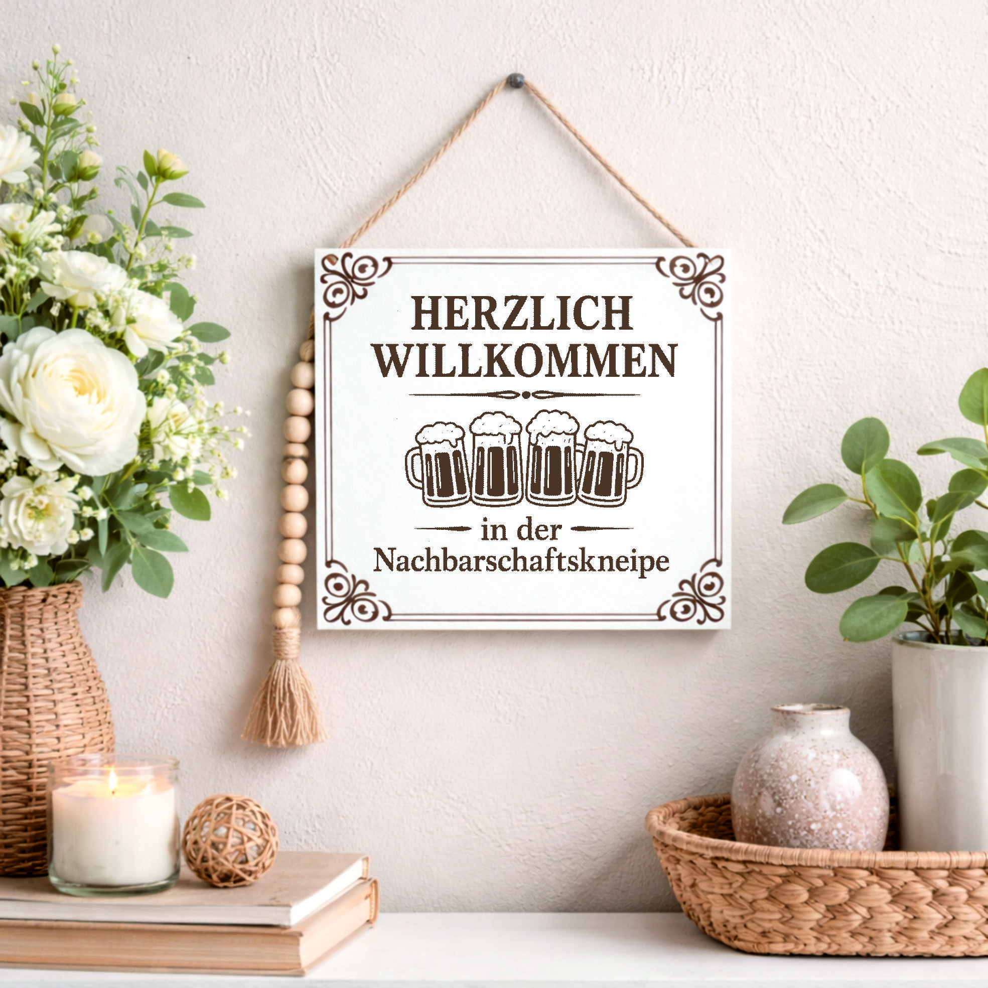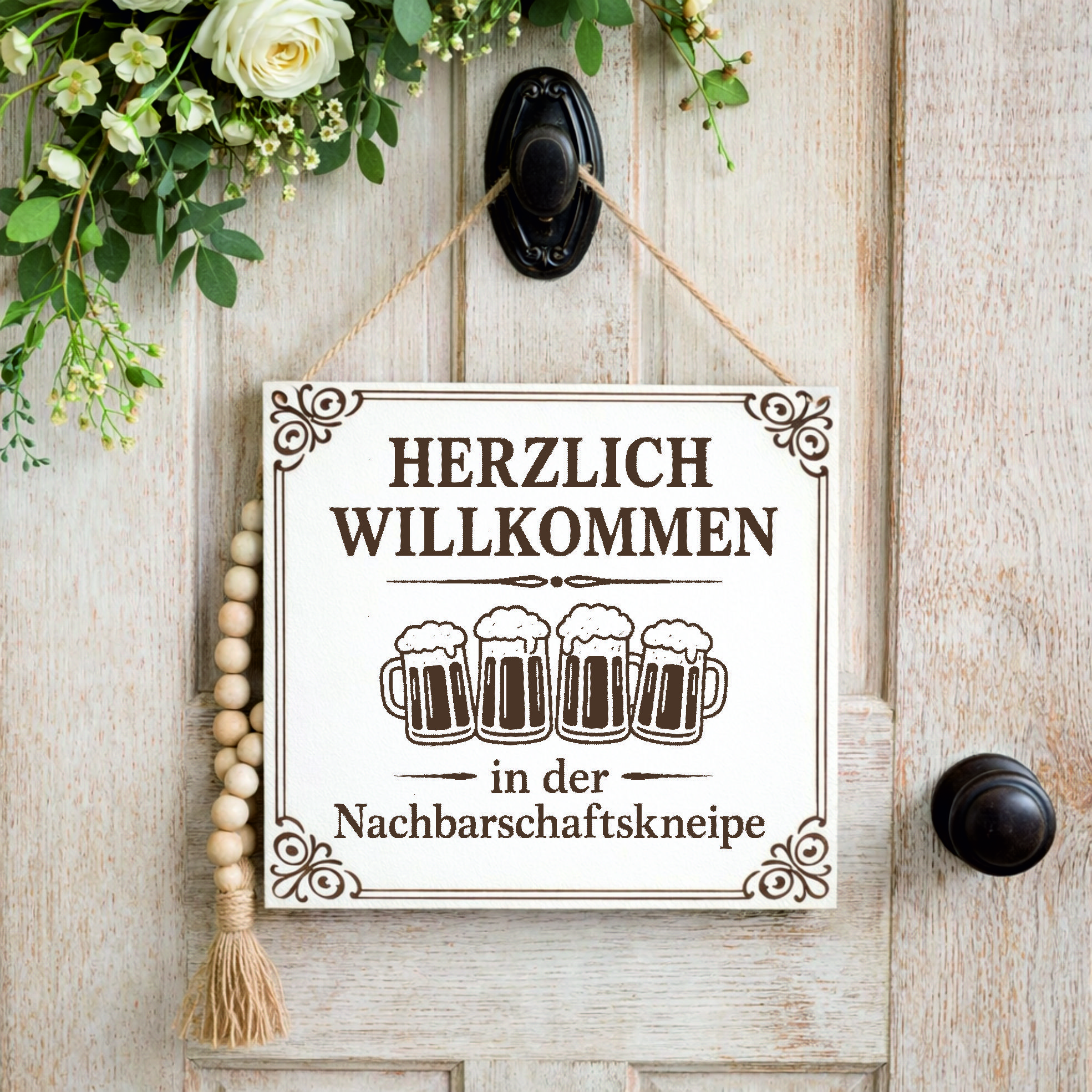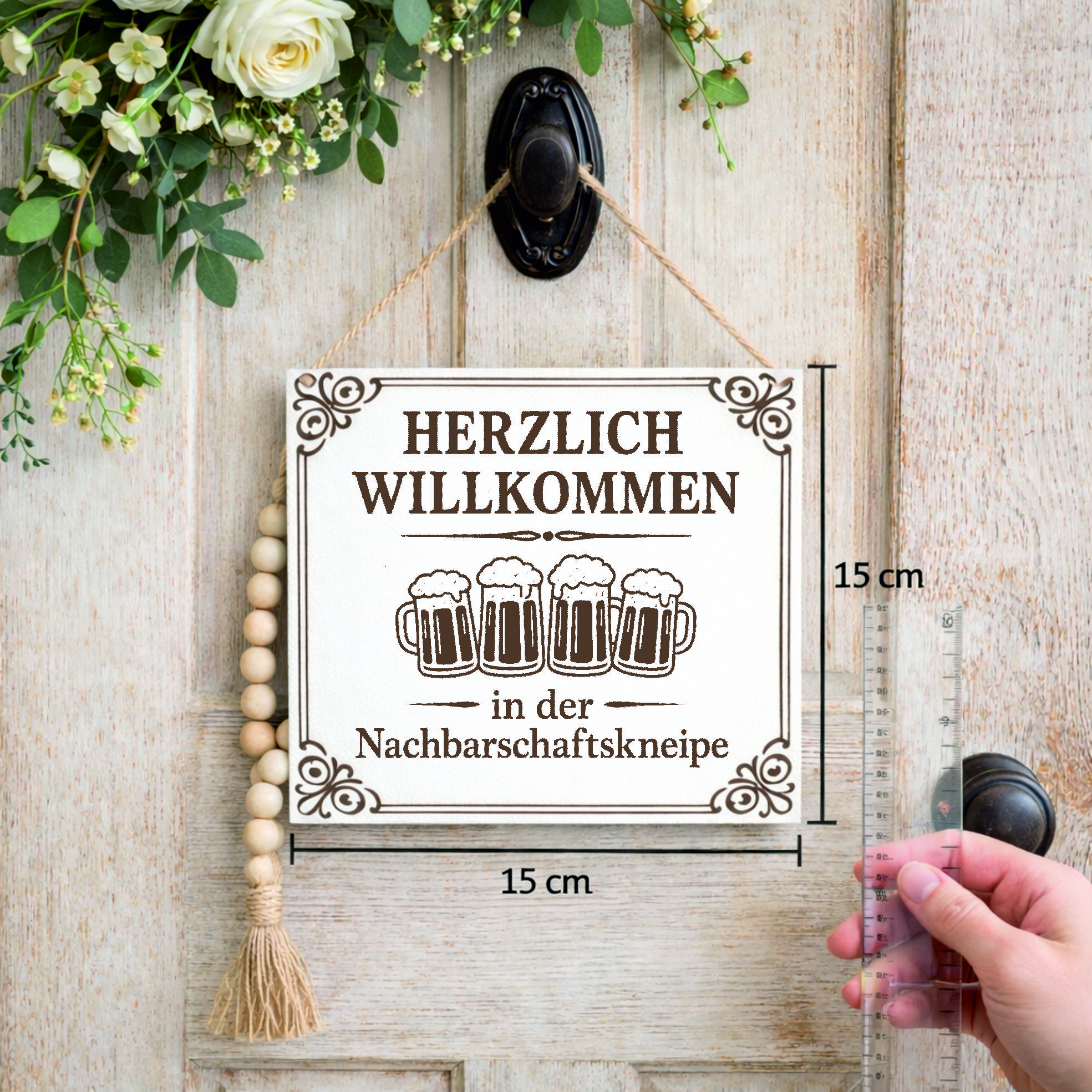 Gefertigt aus weißem HDF und mit einer präzisen Lasergravur versehen, überzeugt das Schild durch seine hochwertige Verarbeitung und seinen Vintage-Look.