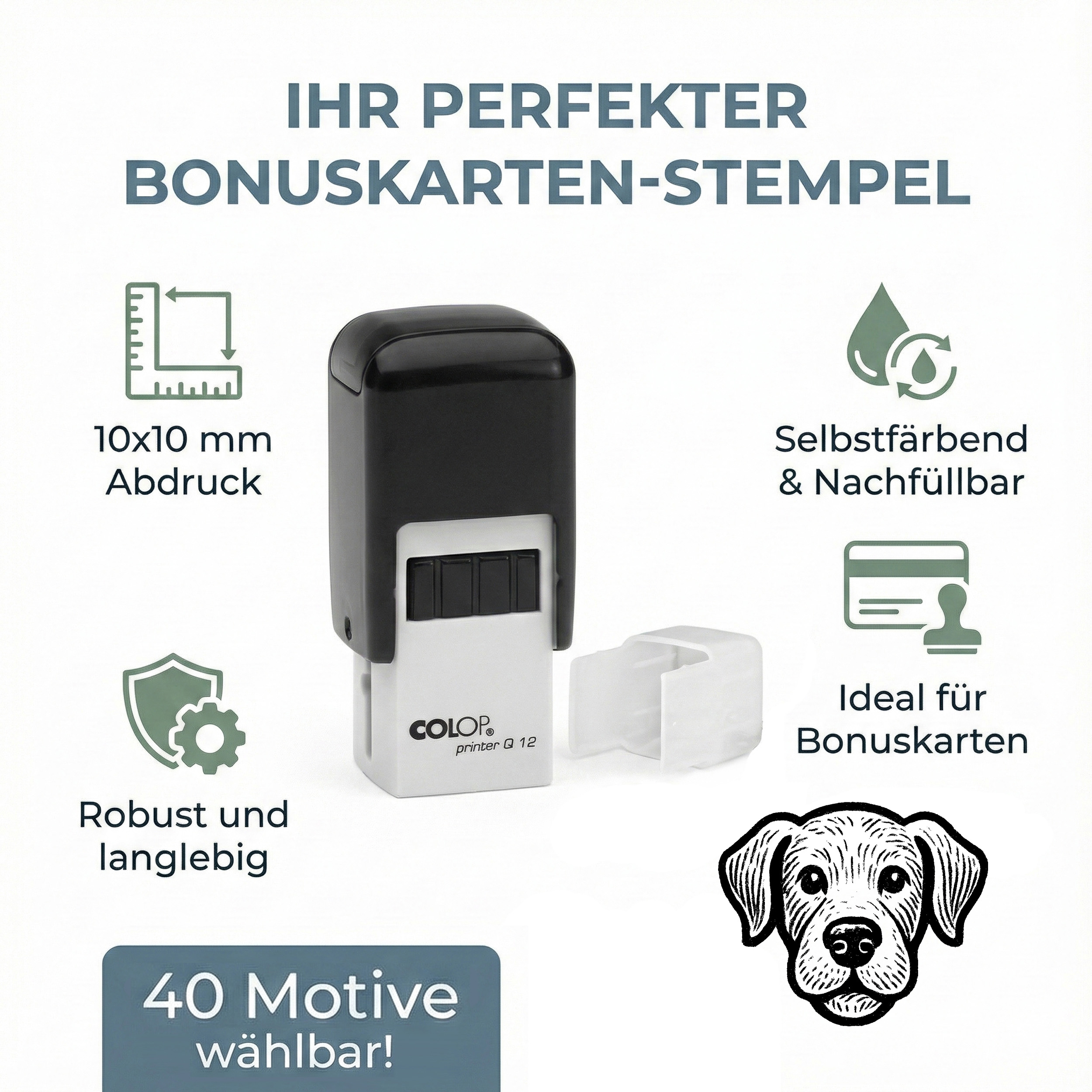 Der Bonusstempel Hund 10x10 mm ist die perfekte Lösung für Bonuskarte, Kundenkarte, Stempelkarte und alle Anwendungen im Tierpension. Das klare Motiv sorgt für einen professionellen Abdruck und ist sofort wiedererkennbar – ideal für Rabattaktionen, Kundenbindung und Bonusprogramme.