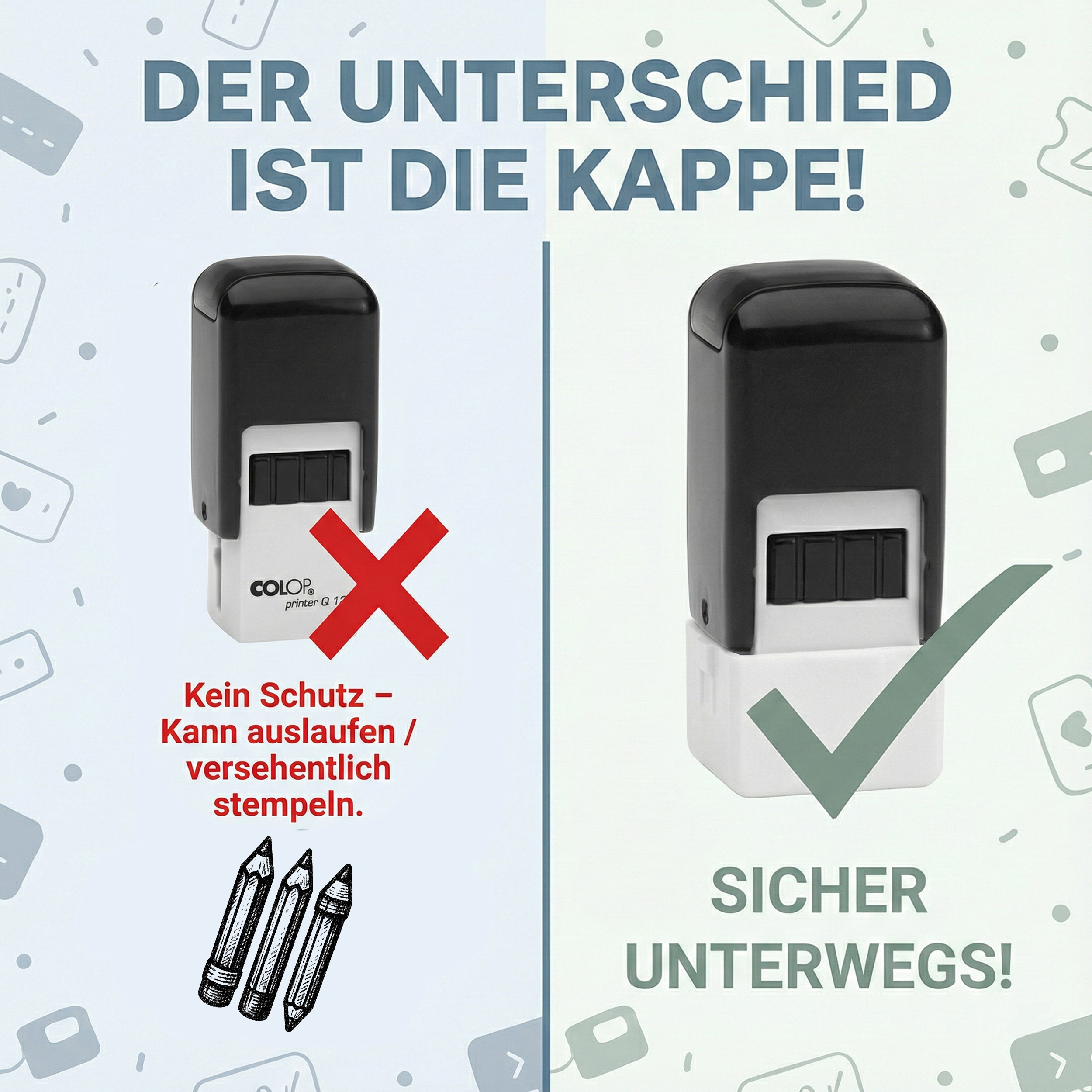 - Mit Schutzkappe für sauberen Transport – sicher in Tasche, Schublade oder Hosentasche; verhindert versehentliches Stempeln. Kein auslaufen - Keine verschmierten Finger