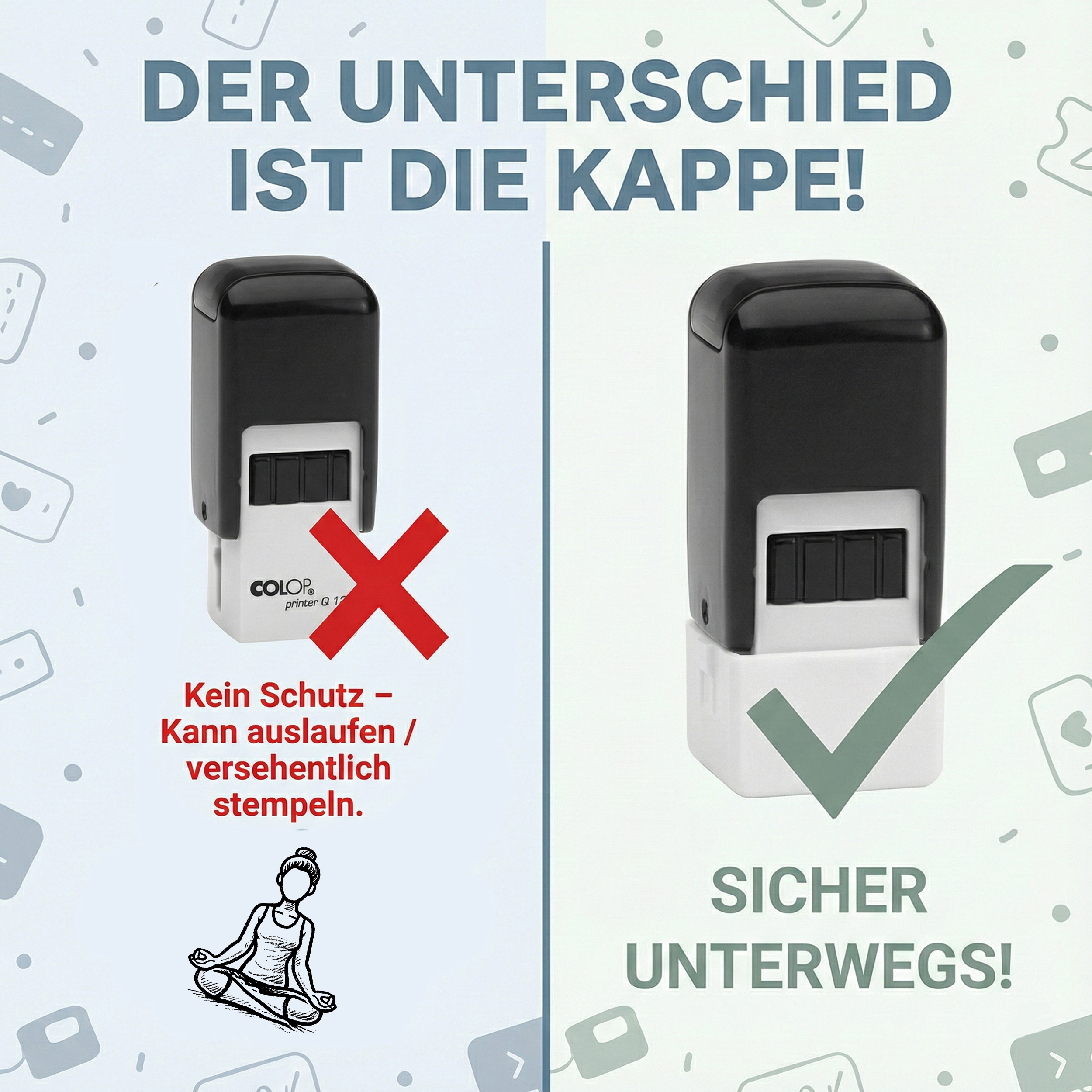 - Mit Schutzkappe für sauberen Transport – sicher in Tasche, Schublade oder Hosentasche; verhindert versehentliches Stempeln. Kein auslaufen - Keine verschmierten Finger