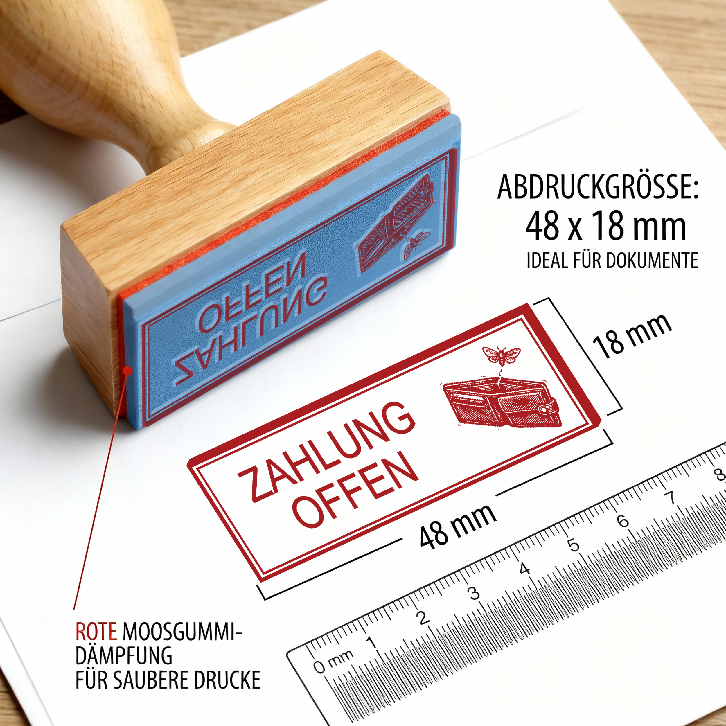 Bürostempel ZAHLUNG OFFEN Leeres Portemonnaie Stempel – Holzstempel 48x18 mm für Dokumente - unbezahlte Rechnung, offen