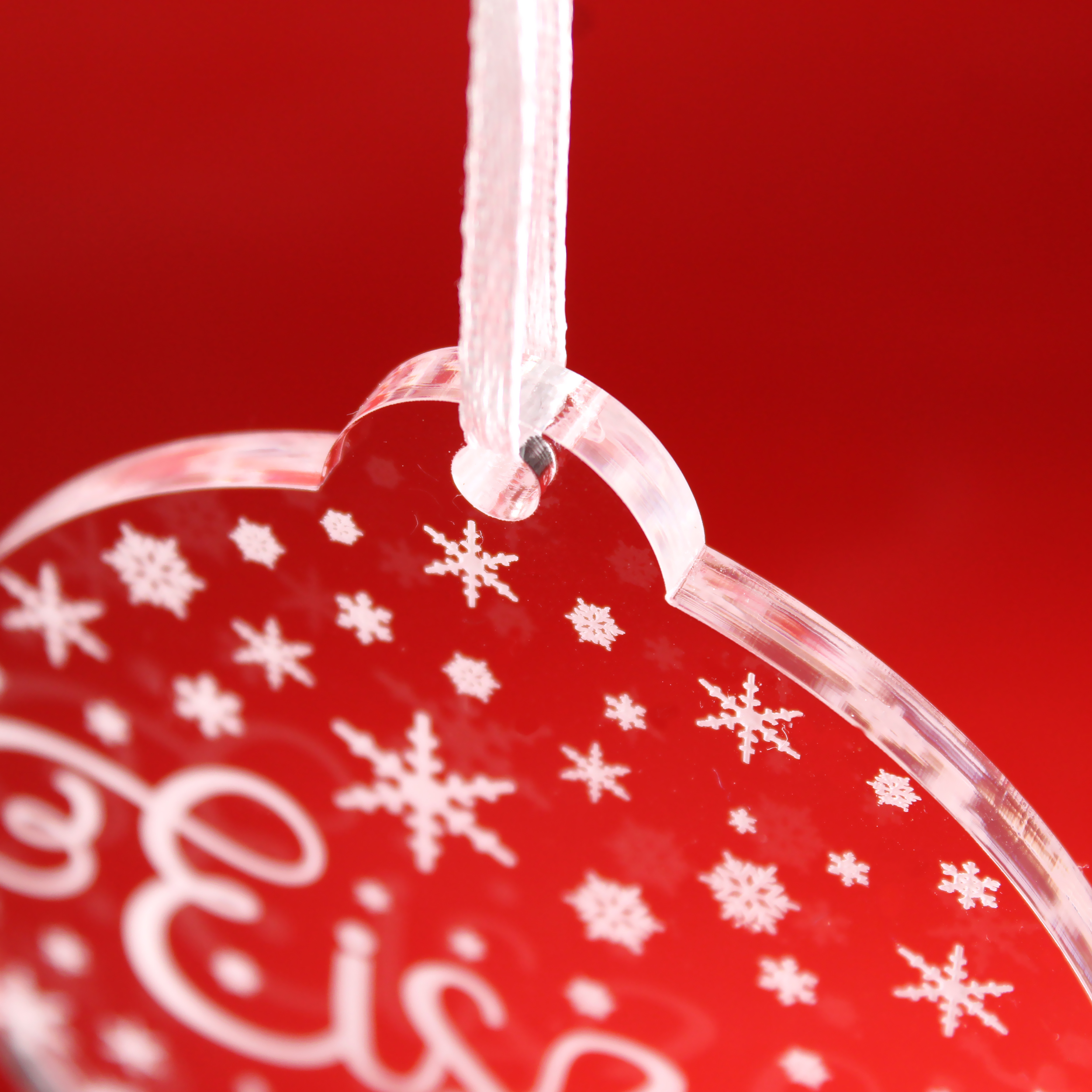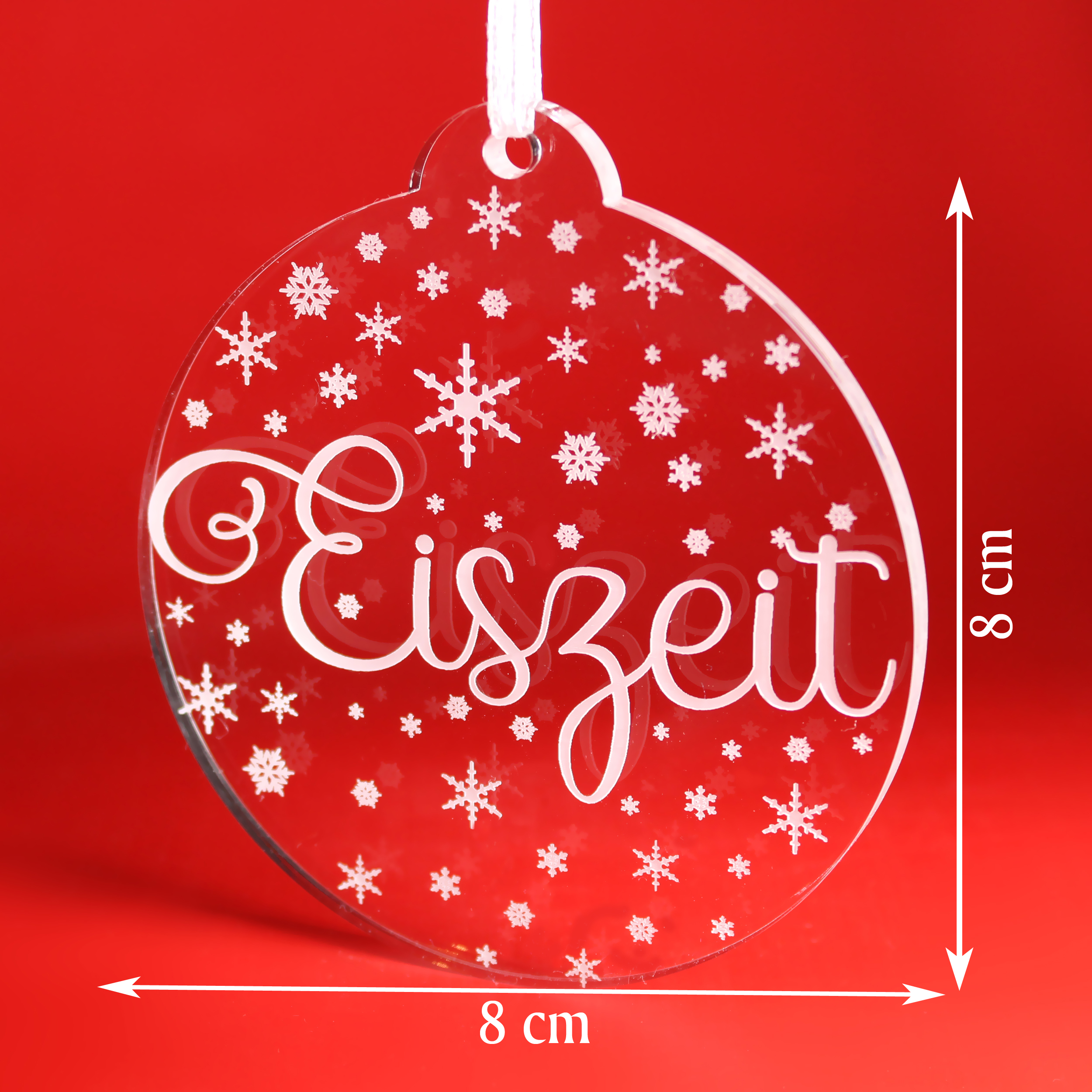 Die Dekolando Christbaumanhänger aus transparentem Acryl verbinden festliche Eleganz mit moderner Schlichtheit. Jeder Anhänger ist 8 × 8 cm groß, 0,5 cm dick und aus hochwertigem, glasklarem Acrylglas gefertigt – edel, stabil und langlebig. Die fein gearbeitete weiße Gravur entsteht durch präzise CO₂-Lasergravur und sorgt für ein brillantes, winterlich-frostiges Erscheinungsbild.