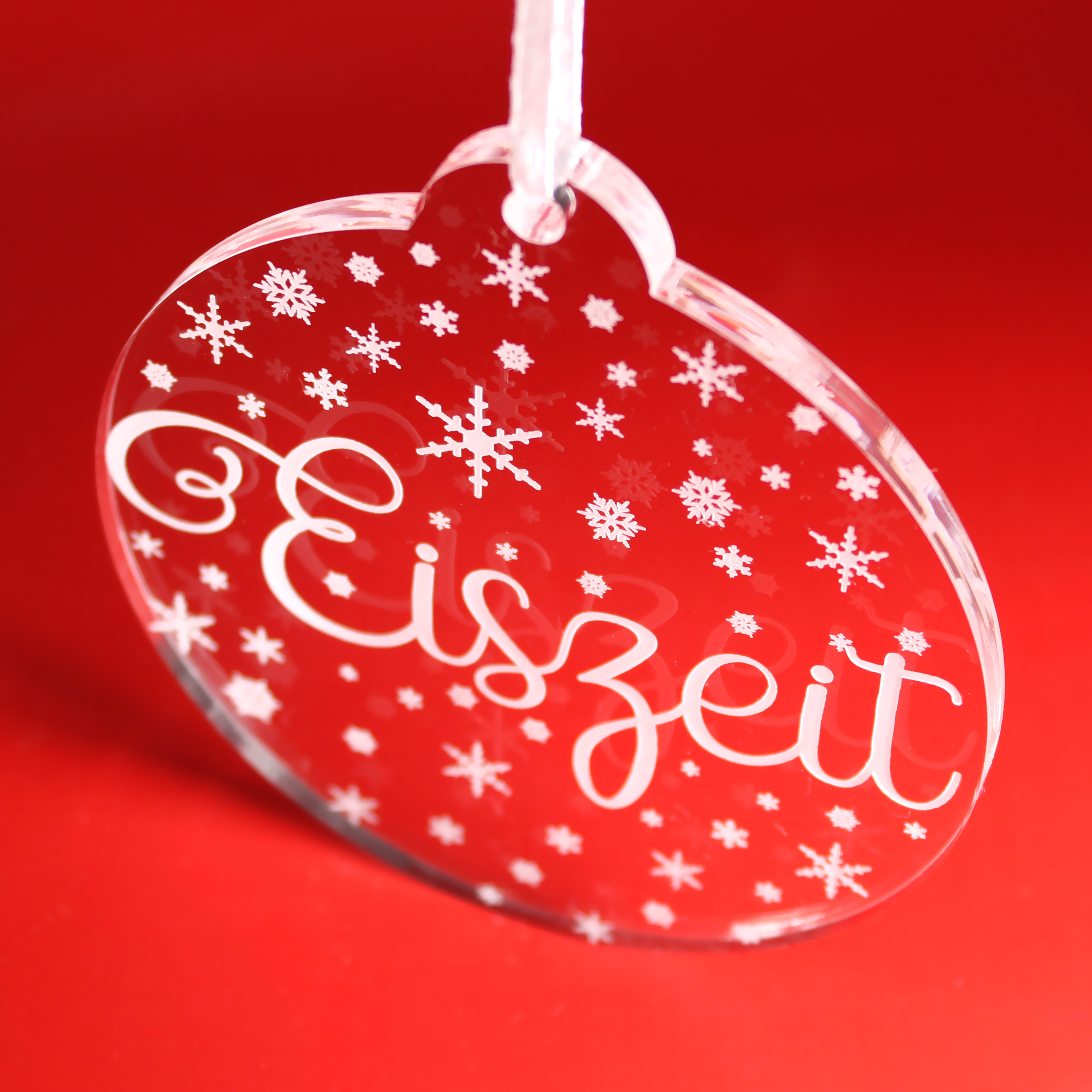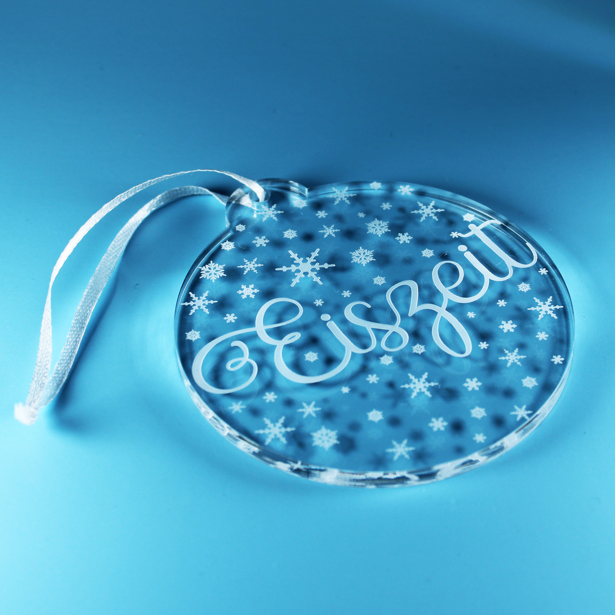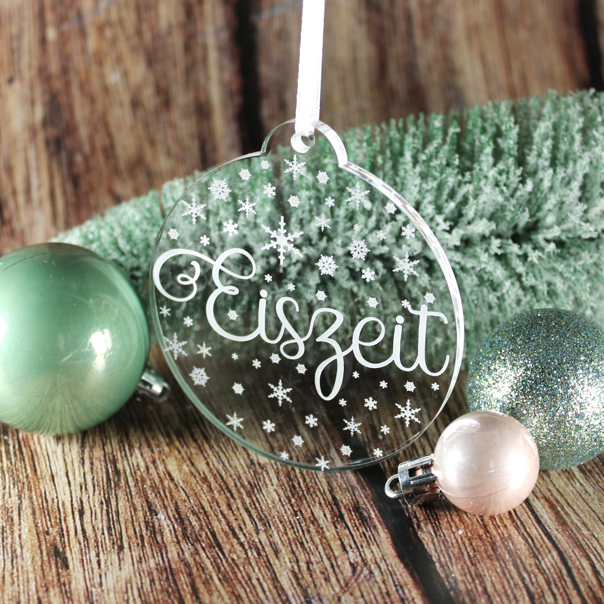 Christbaumanhänger Eiszeit aus Acryl – transparente Weihnachtsanhänger mit weißer Gravur