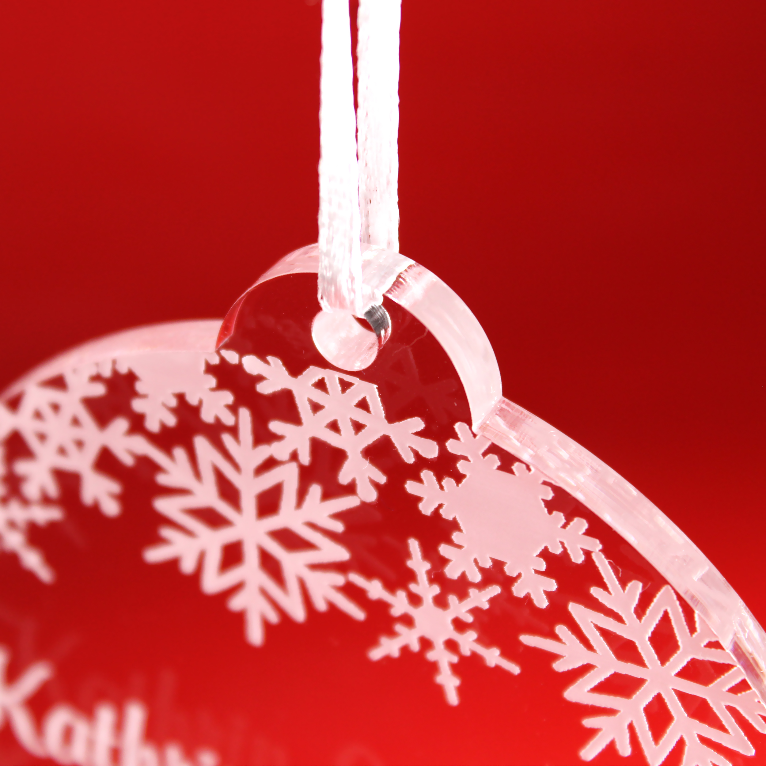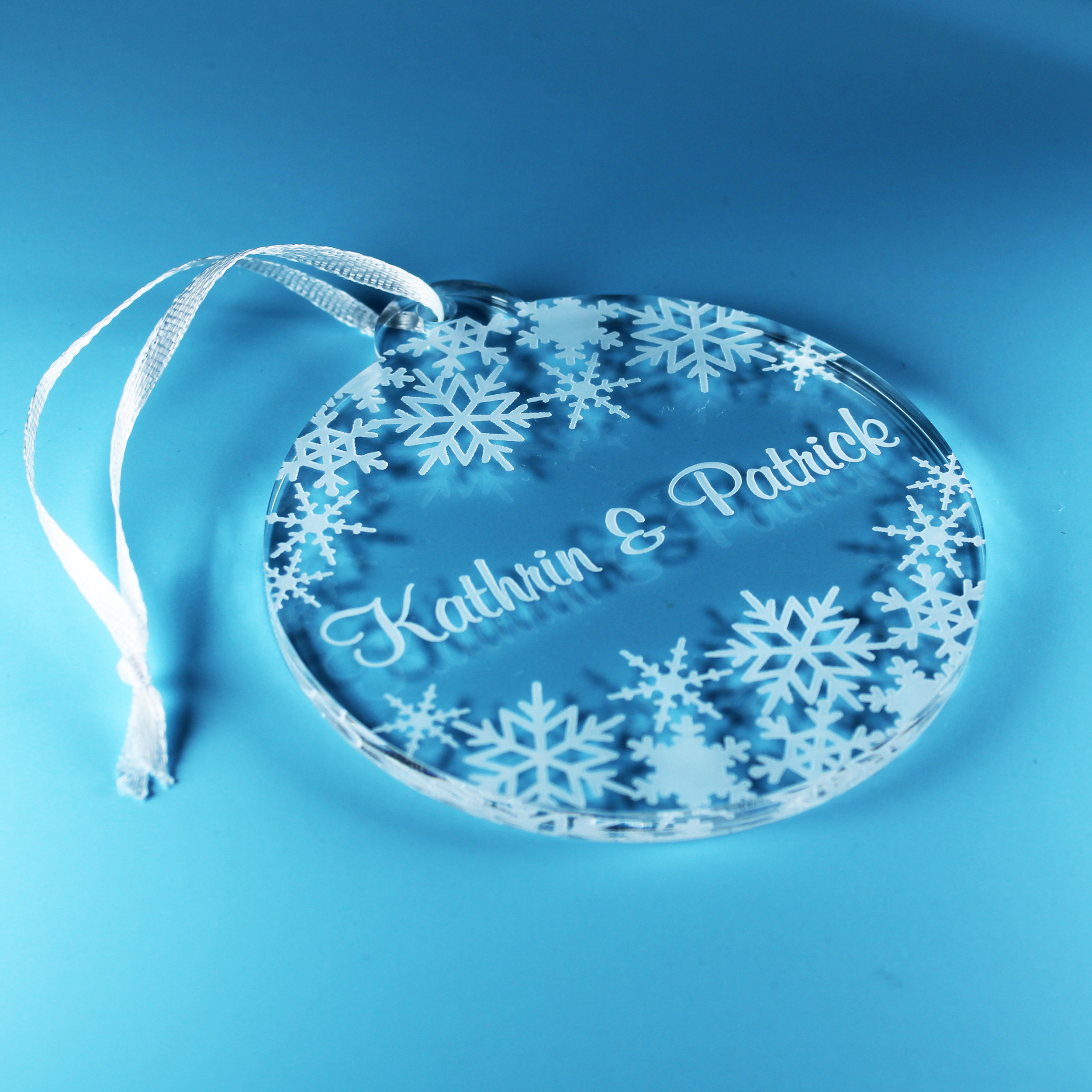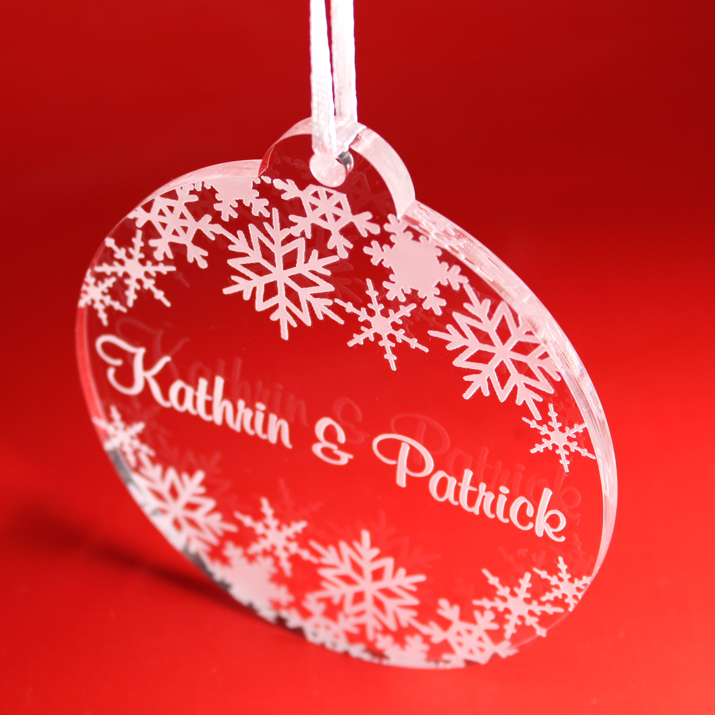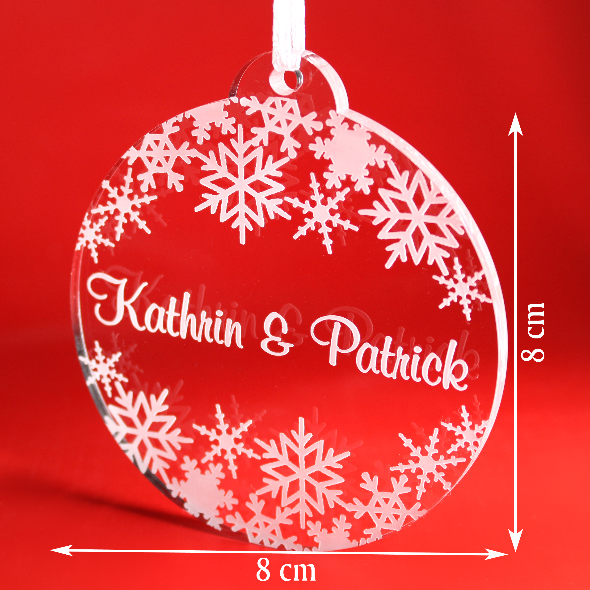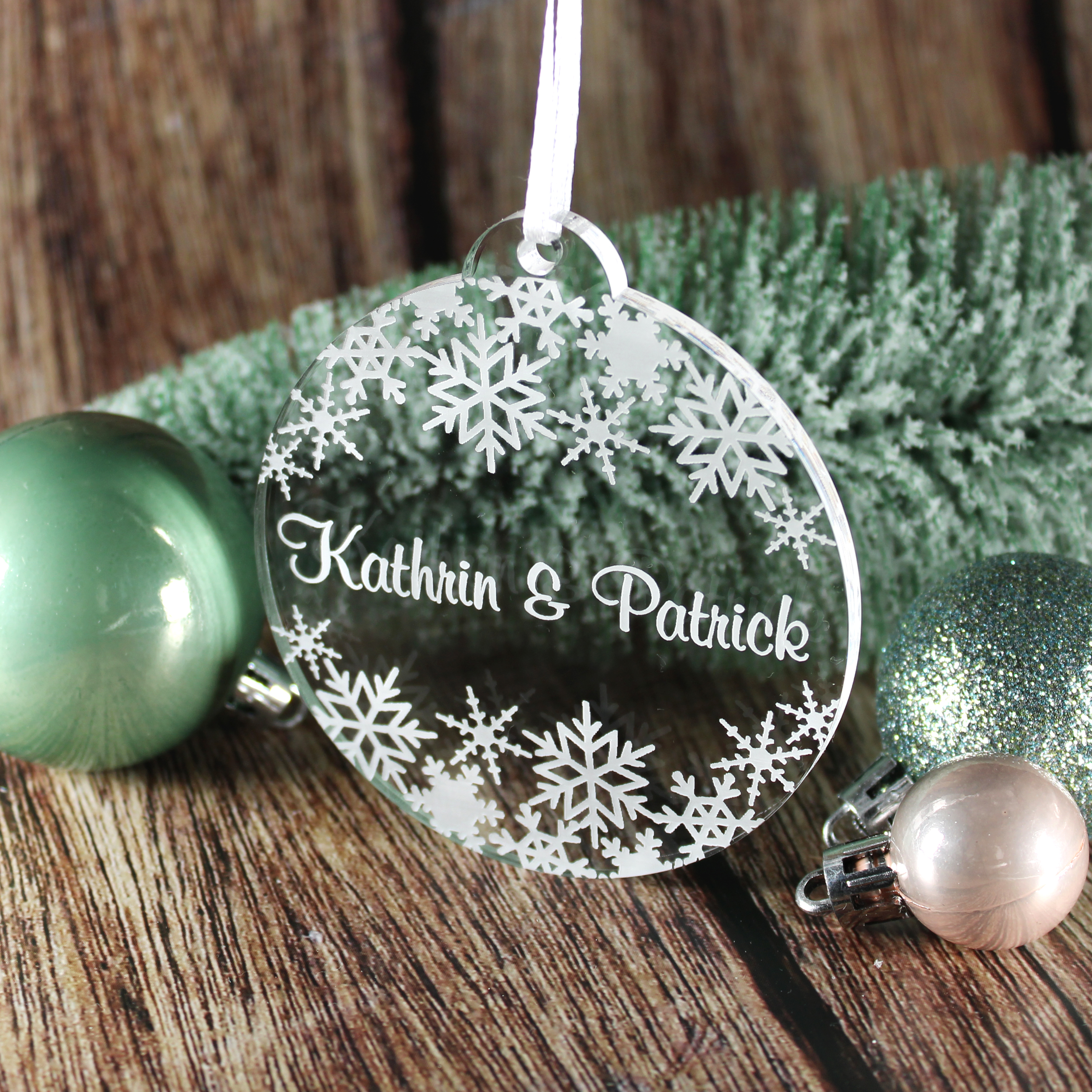 Christbaumanhänger Schneekugel Personalisiert aus Acryl – transparente Weihnachtsanhänger mit weißer Gravur