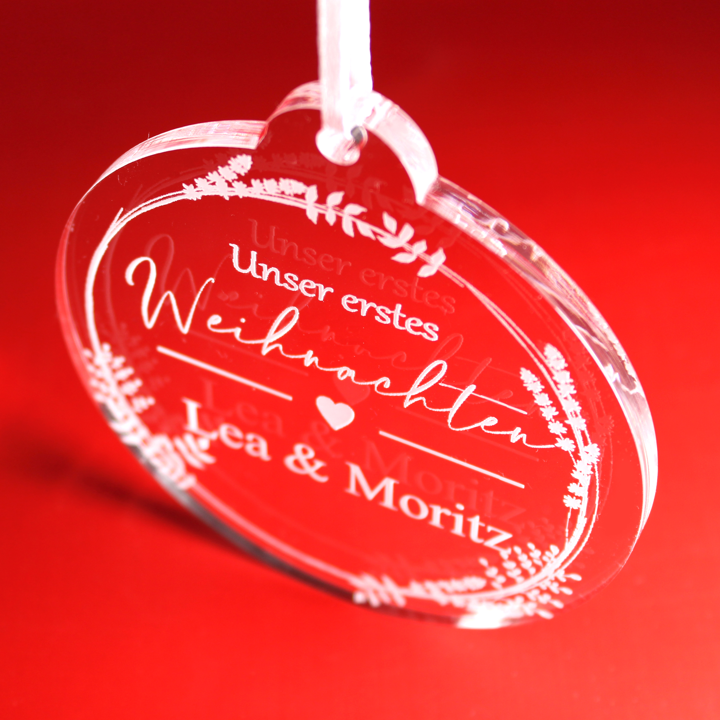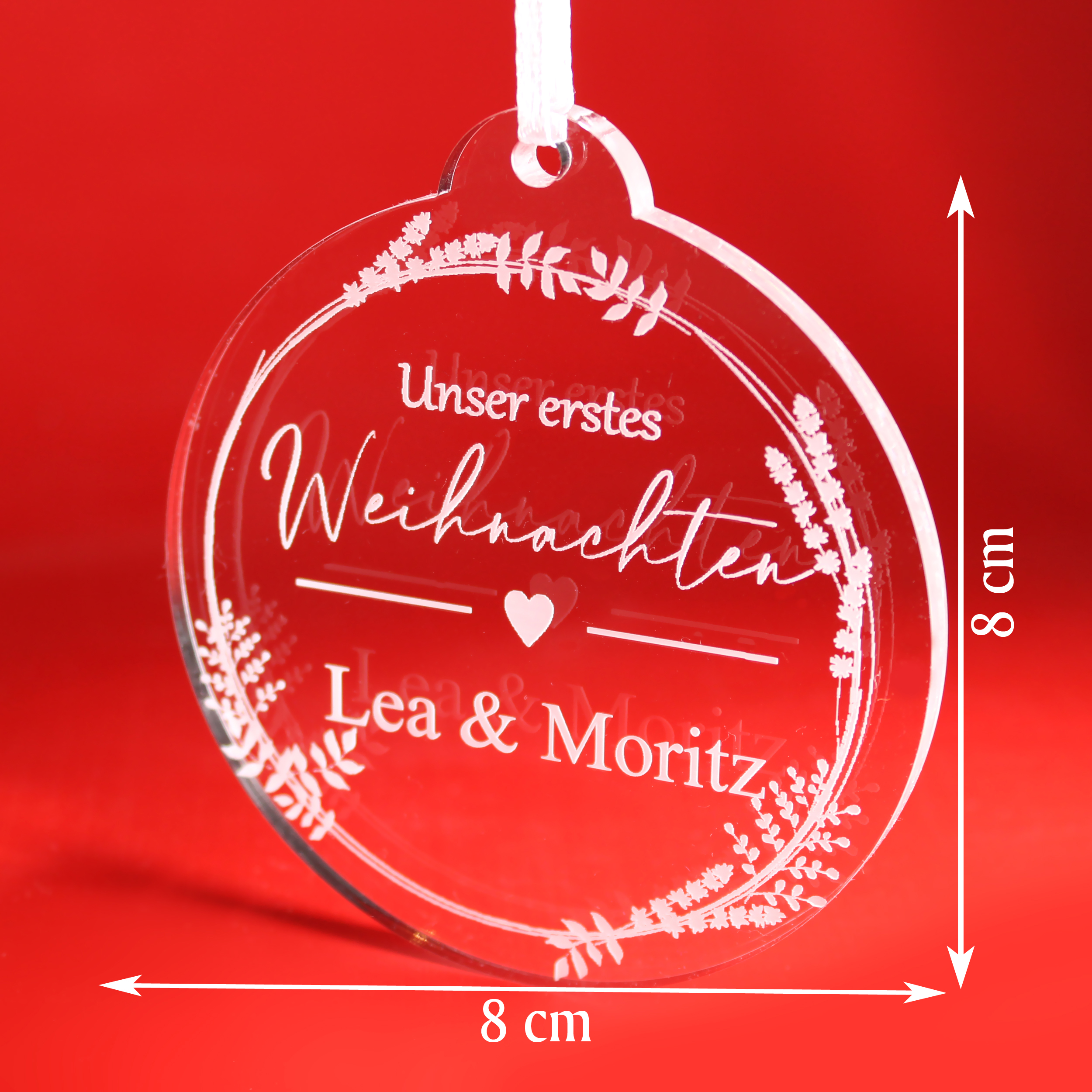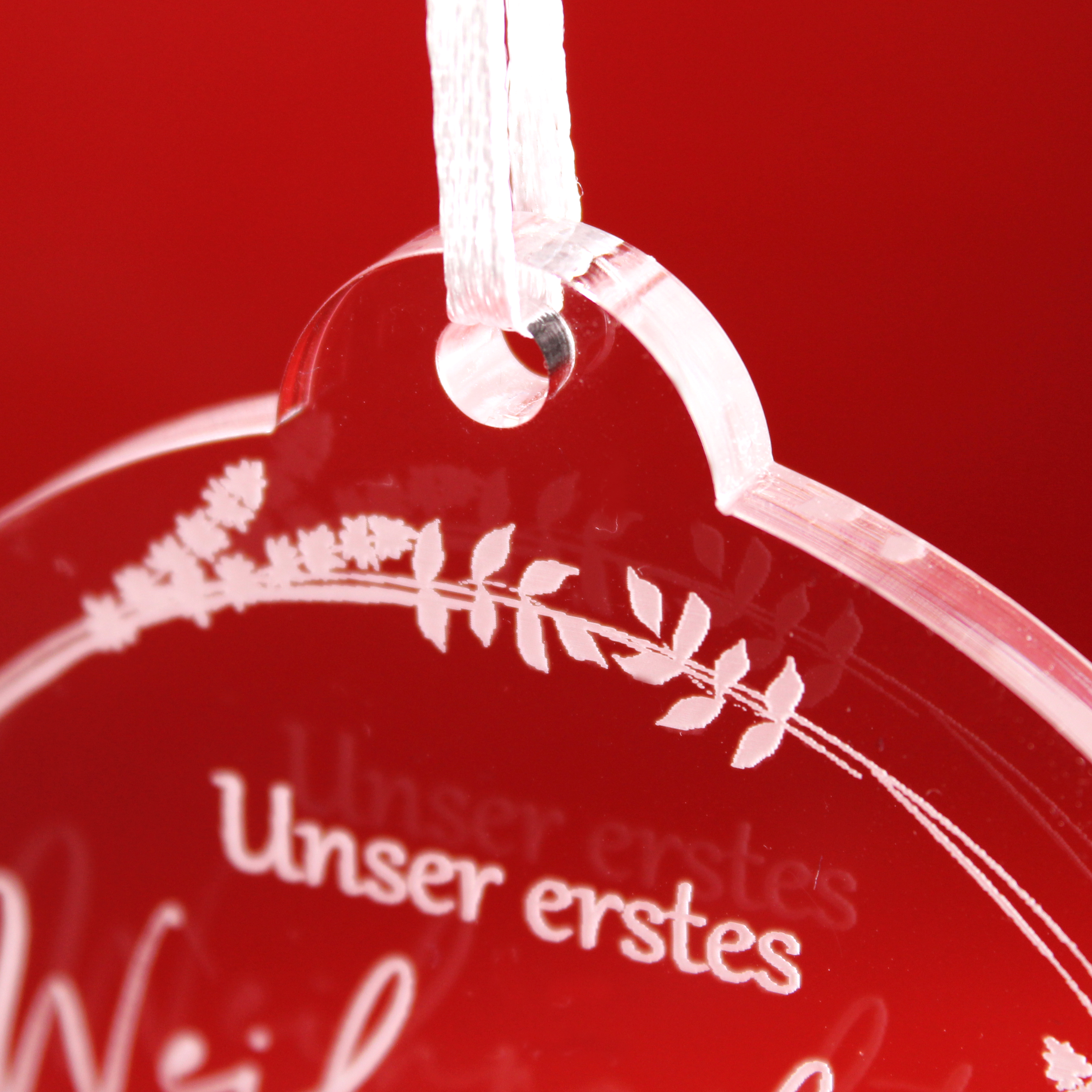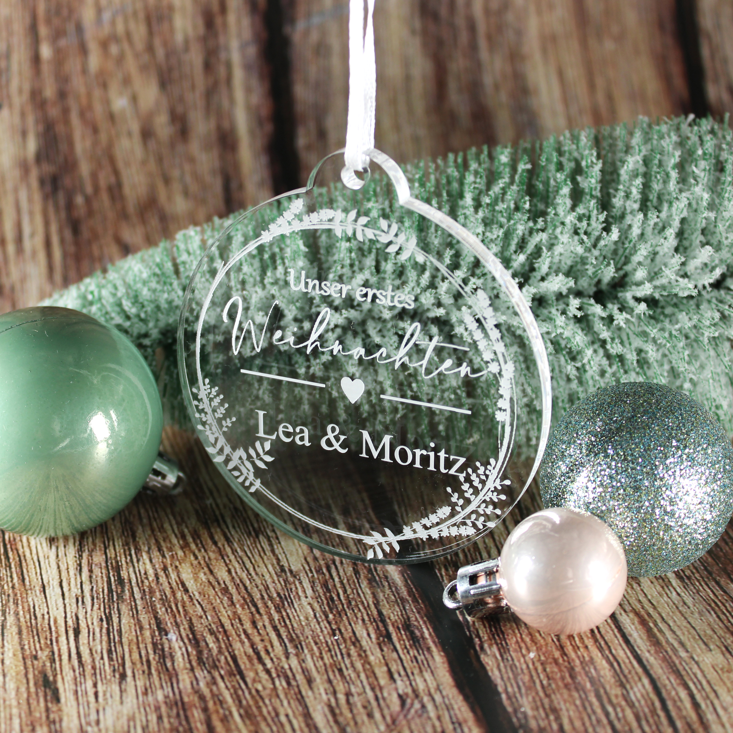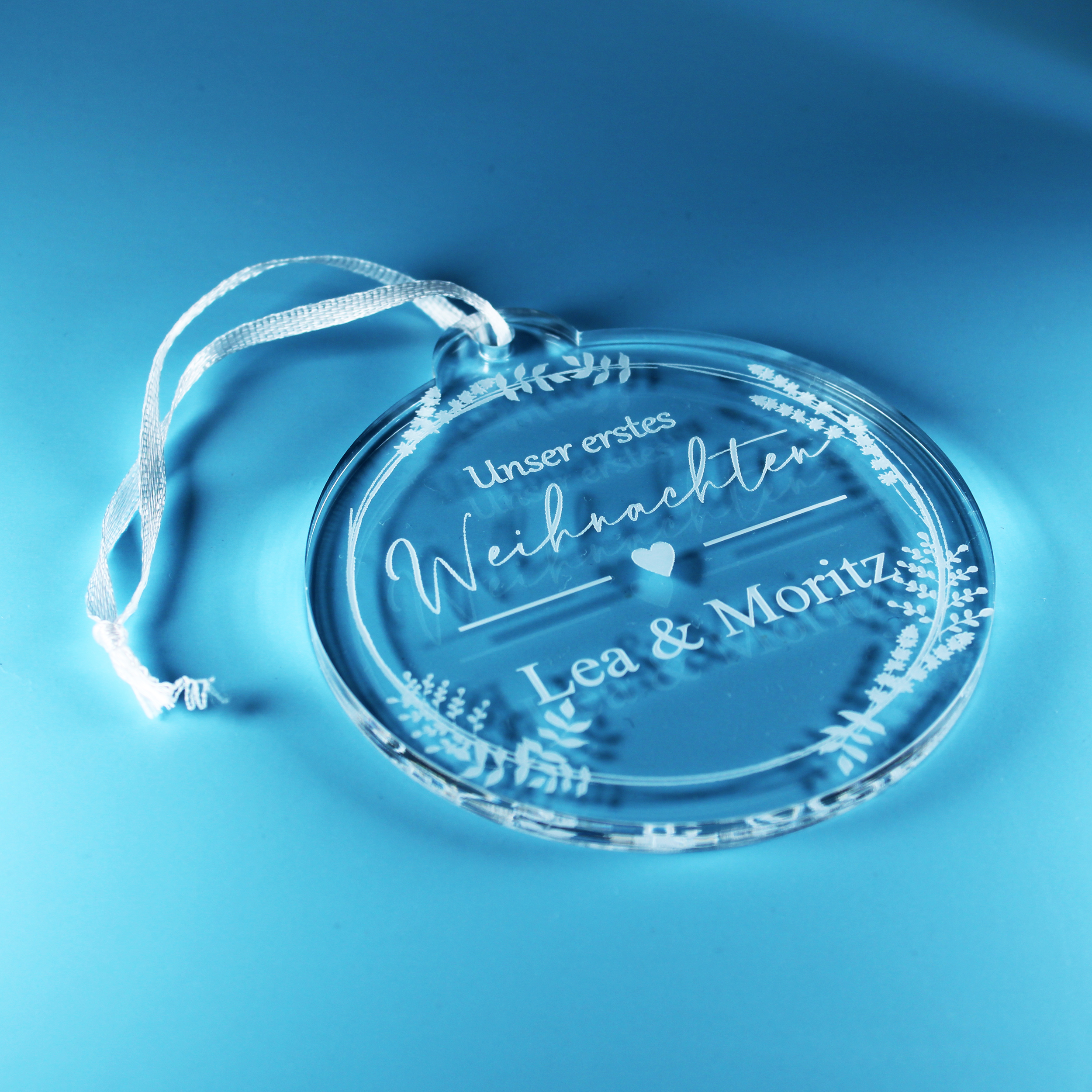 Christbaumanhänger Unser Erstes Weihnachten Kranz aus Acryl – transparente Weihnachtsanhänger mit weißer Gravur