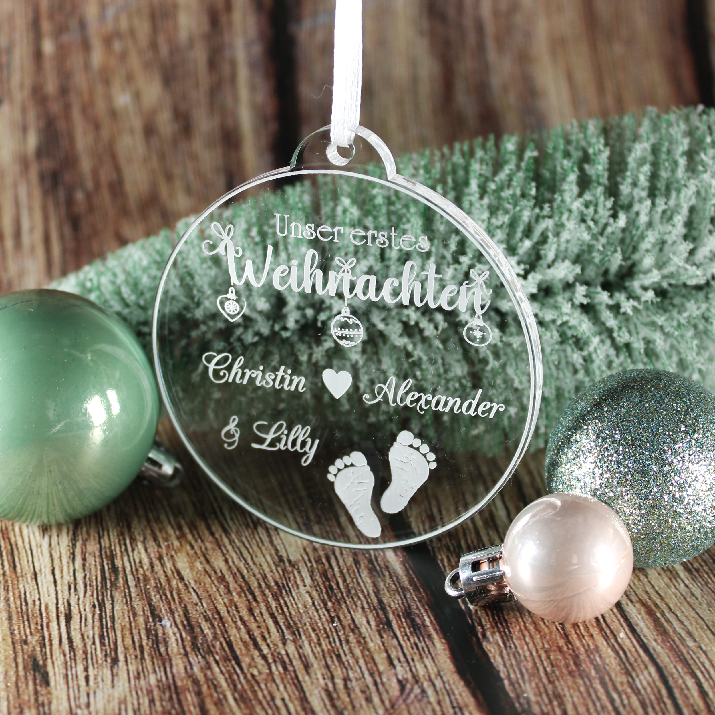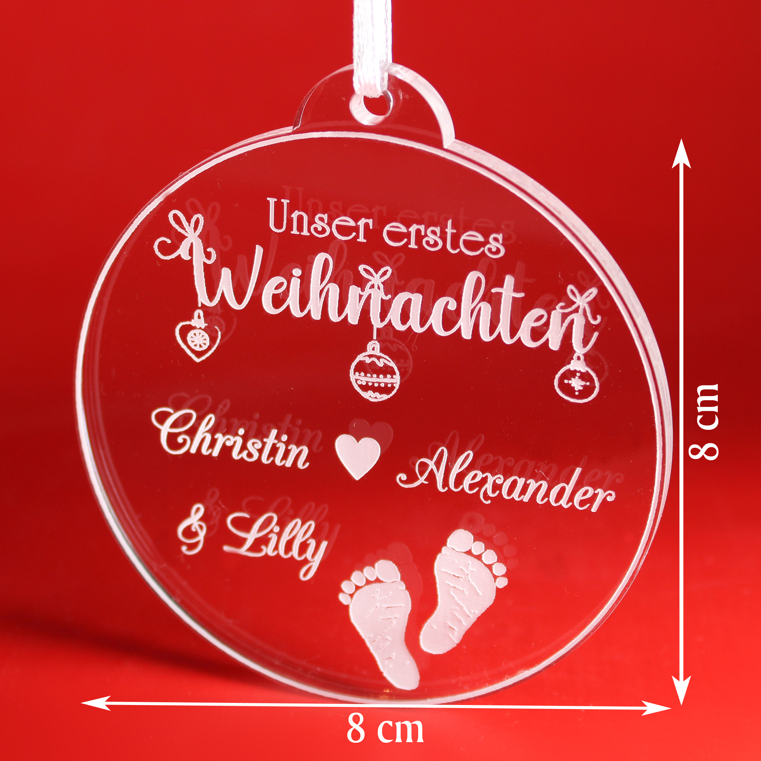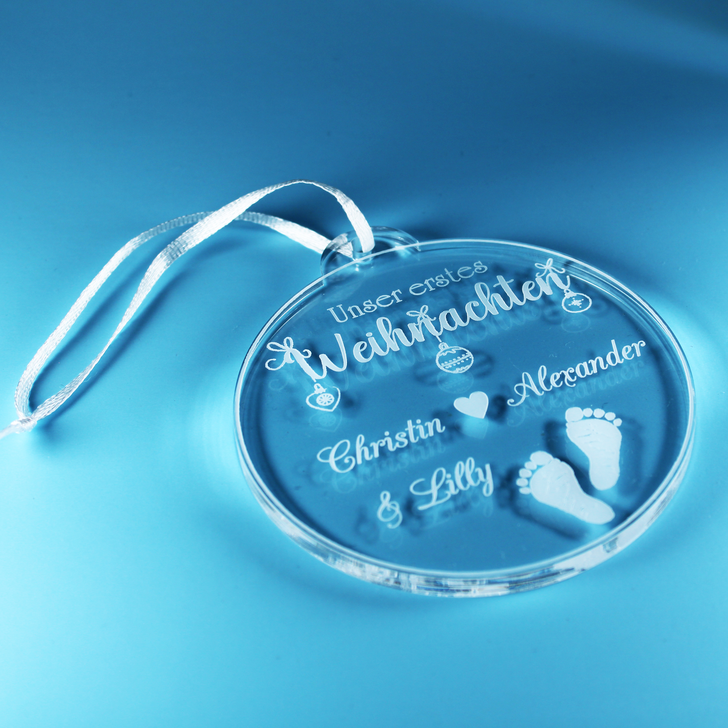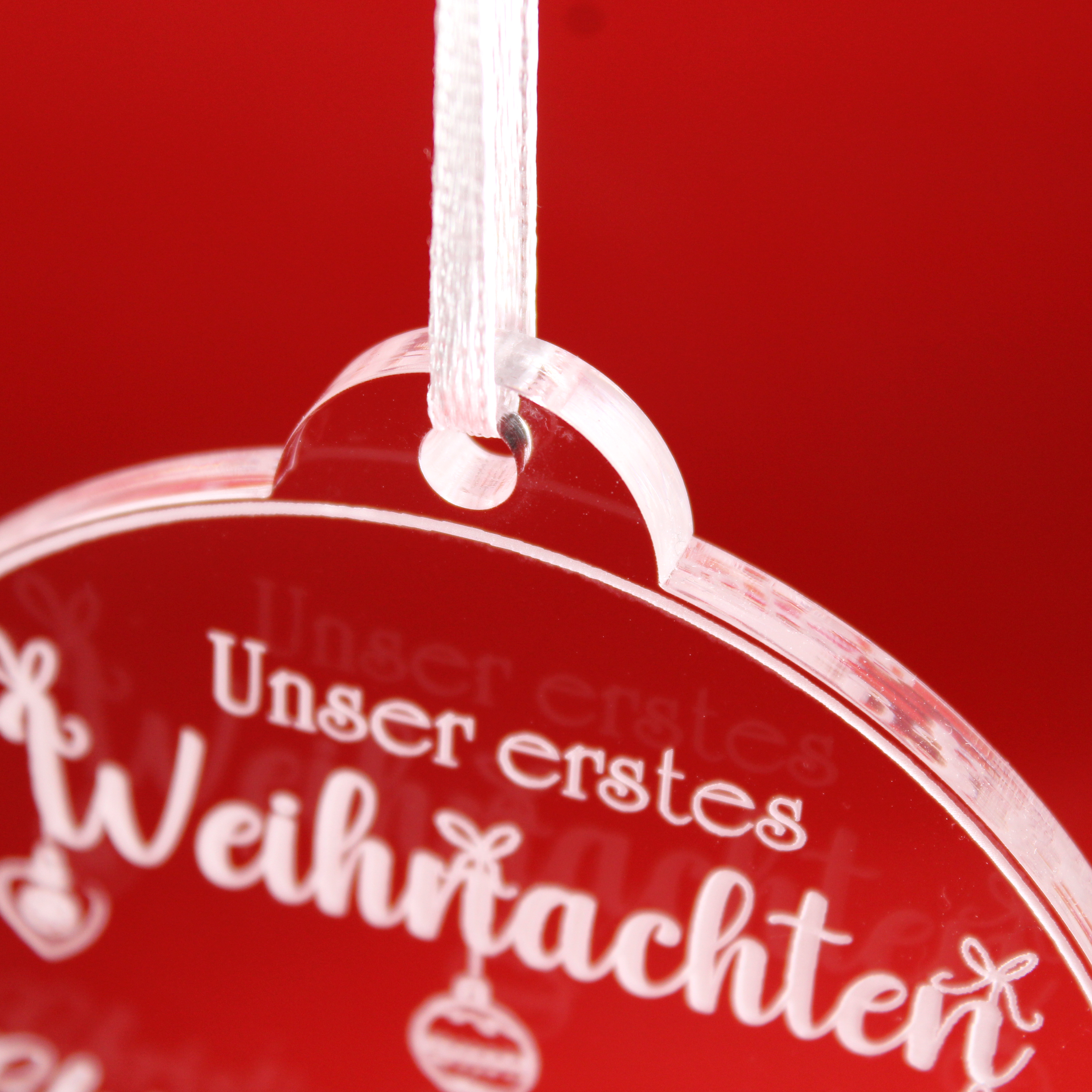 Christbaumanhänger Unser Erstes Weihnachten aus Acryl – transparente Weihnachtsanhänger mit weißer Gravur