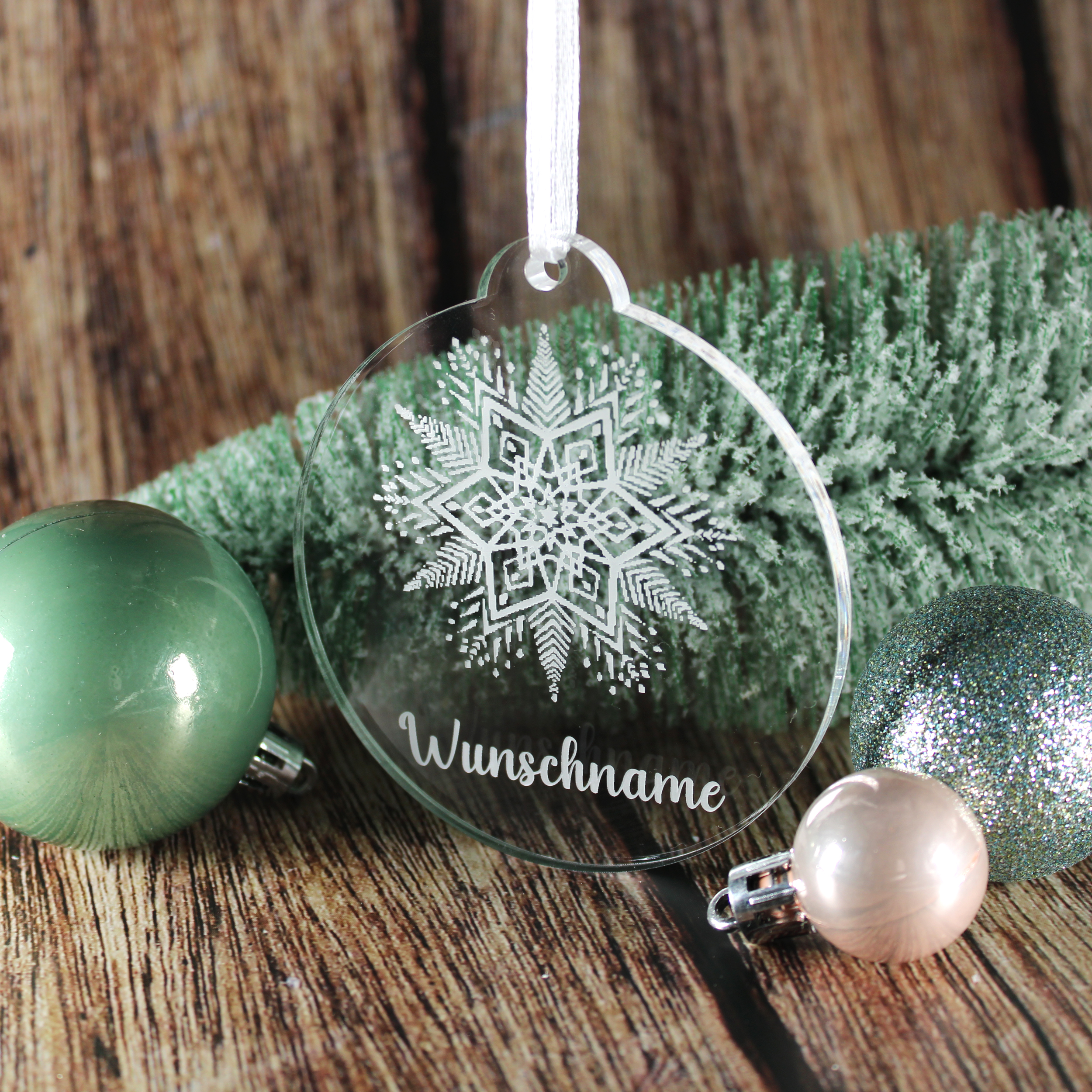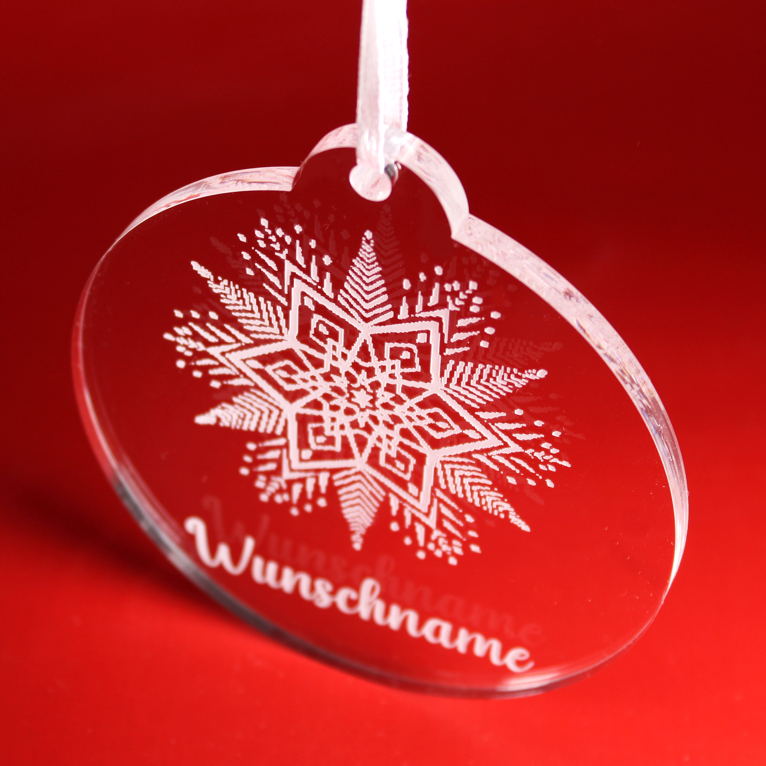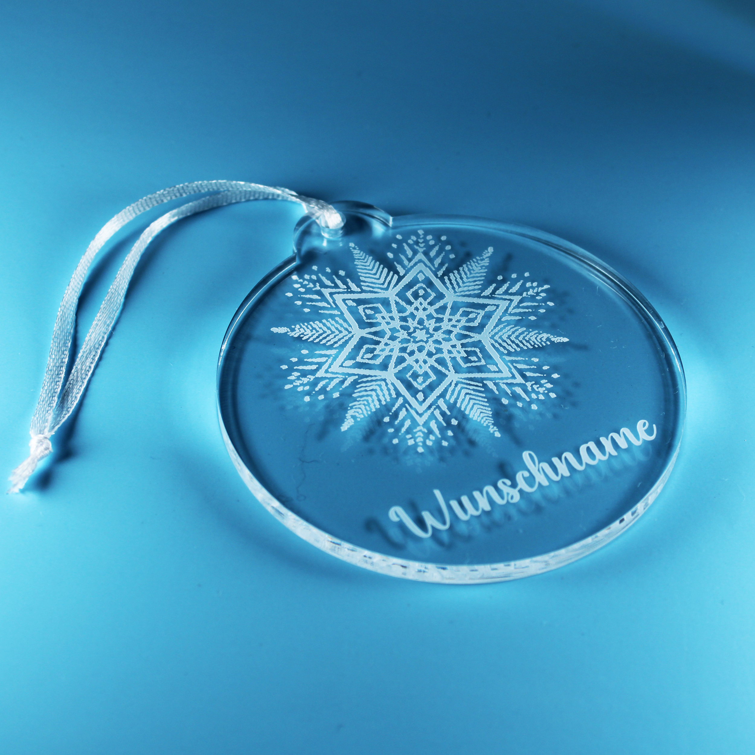 Christbaumanhänger Wunschname Schneeflockenstern aus Acryl – transparente Weihnachtsanhänger mit weißer Gravur