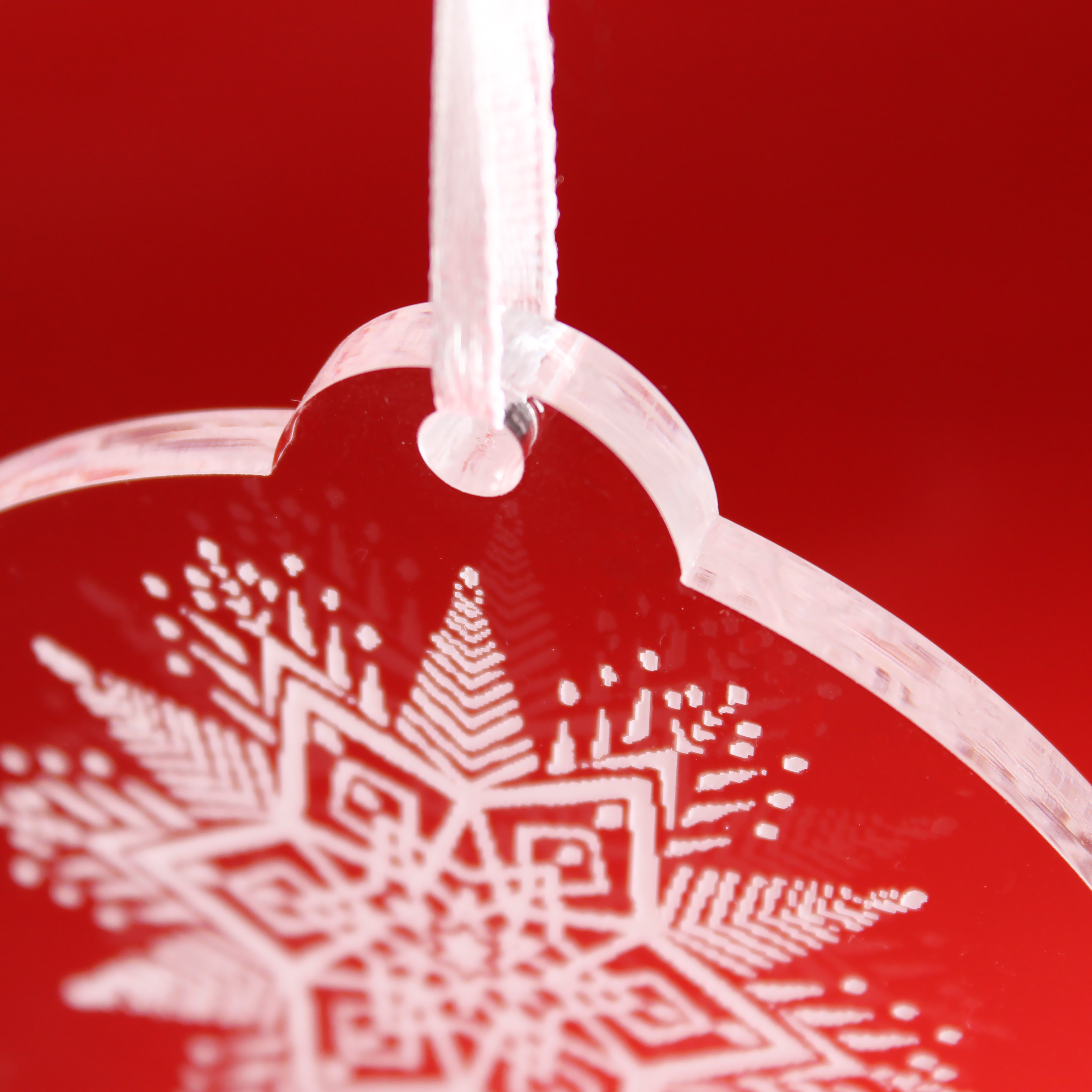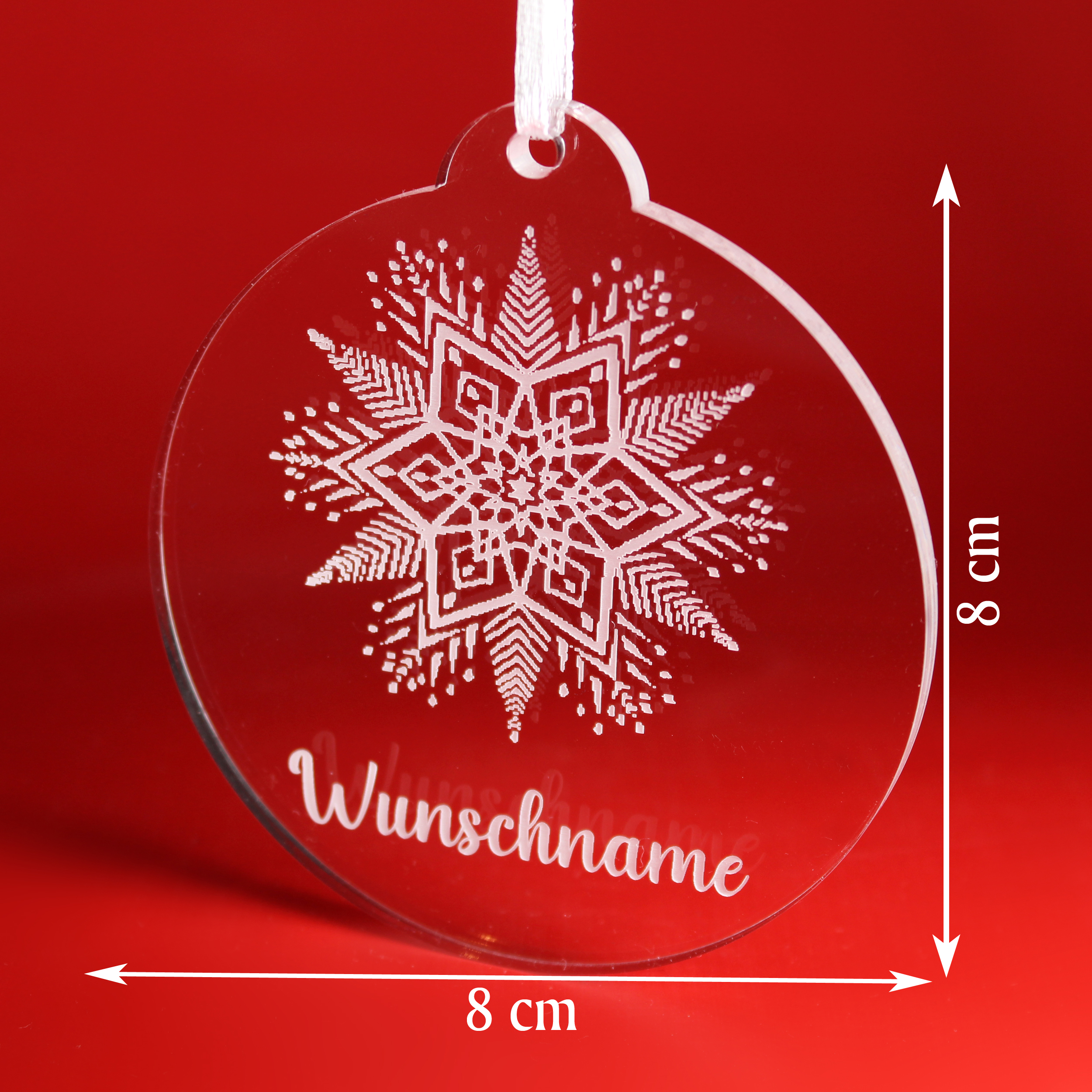 Die Dekolando Christbaumanhänger aus transparentem Acryl verbinden festliche Eleganz mit moderner Schlichtheit. Jeder Anhänger ist 8 × 8 cm groß, 0,5 cm dick und aus hochwertigem, glasklarem Acrylglas gefertigt – edel, stabil und langlebig. Die fein gearbeitete weiße Gravur entsteht durch präzise CO₂-Lasergravur und sorgt für ein brillantes, winterlich-frostiges Erscheinungsbild.