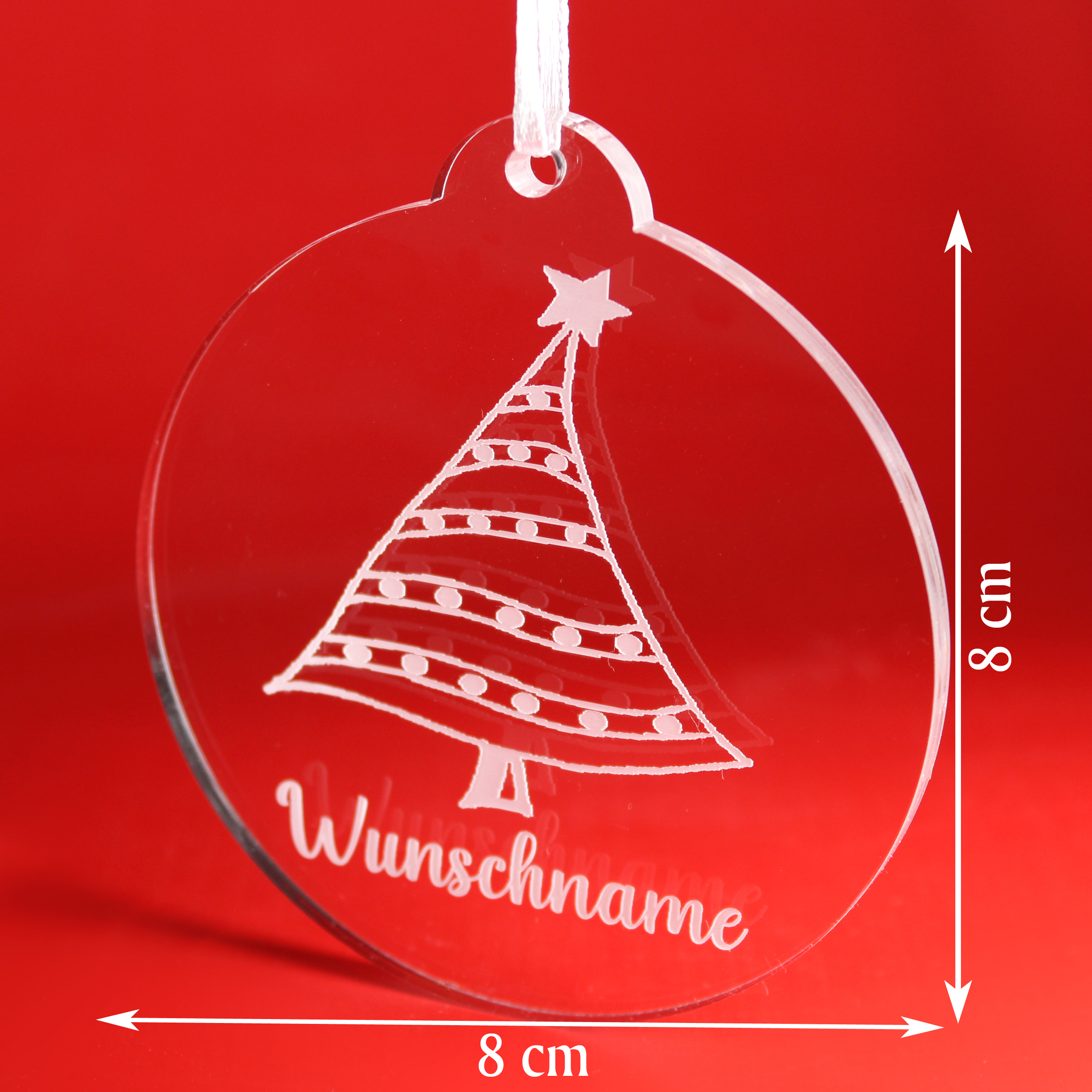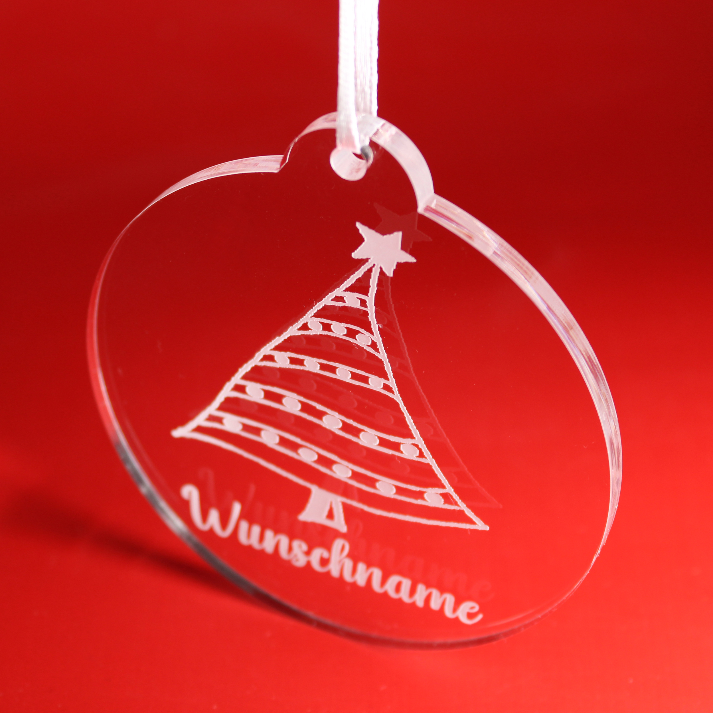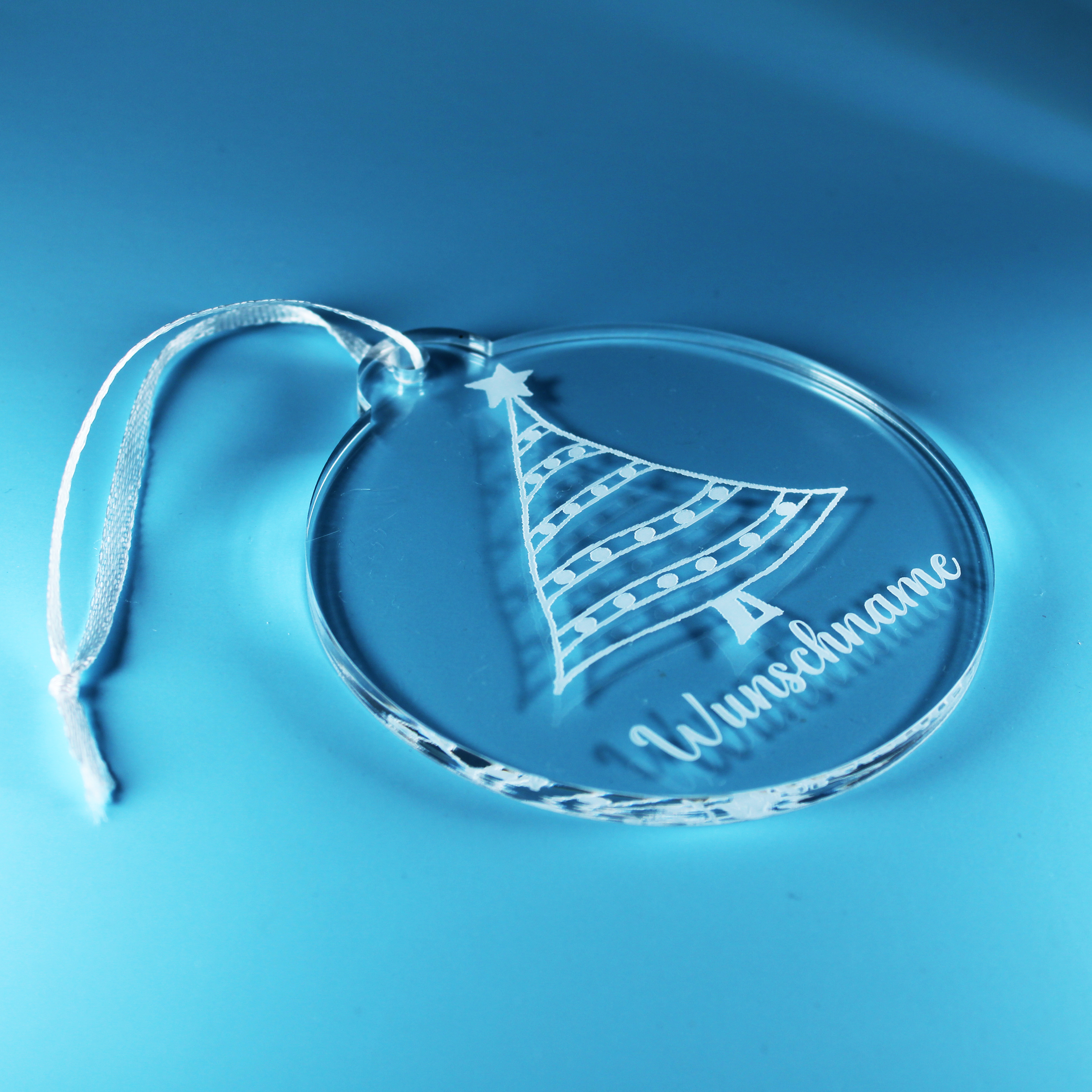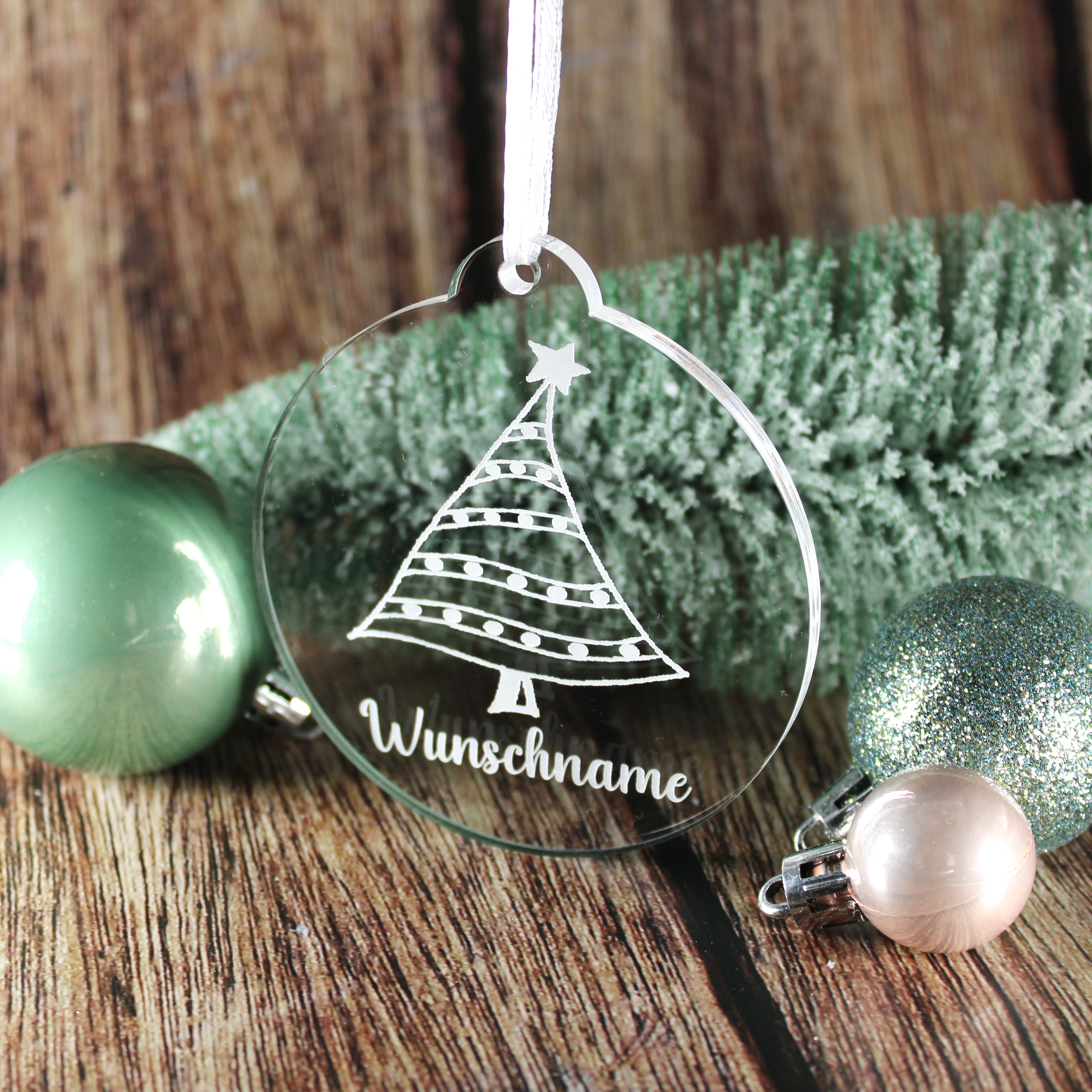 Christbaumanhänger Wunschname Tannenbaum aus Acryl – transparente Weihnachtsanhänger mit weißer Gravur