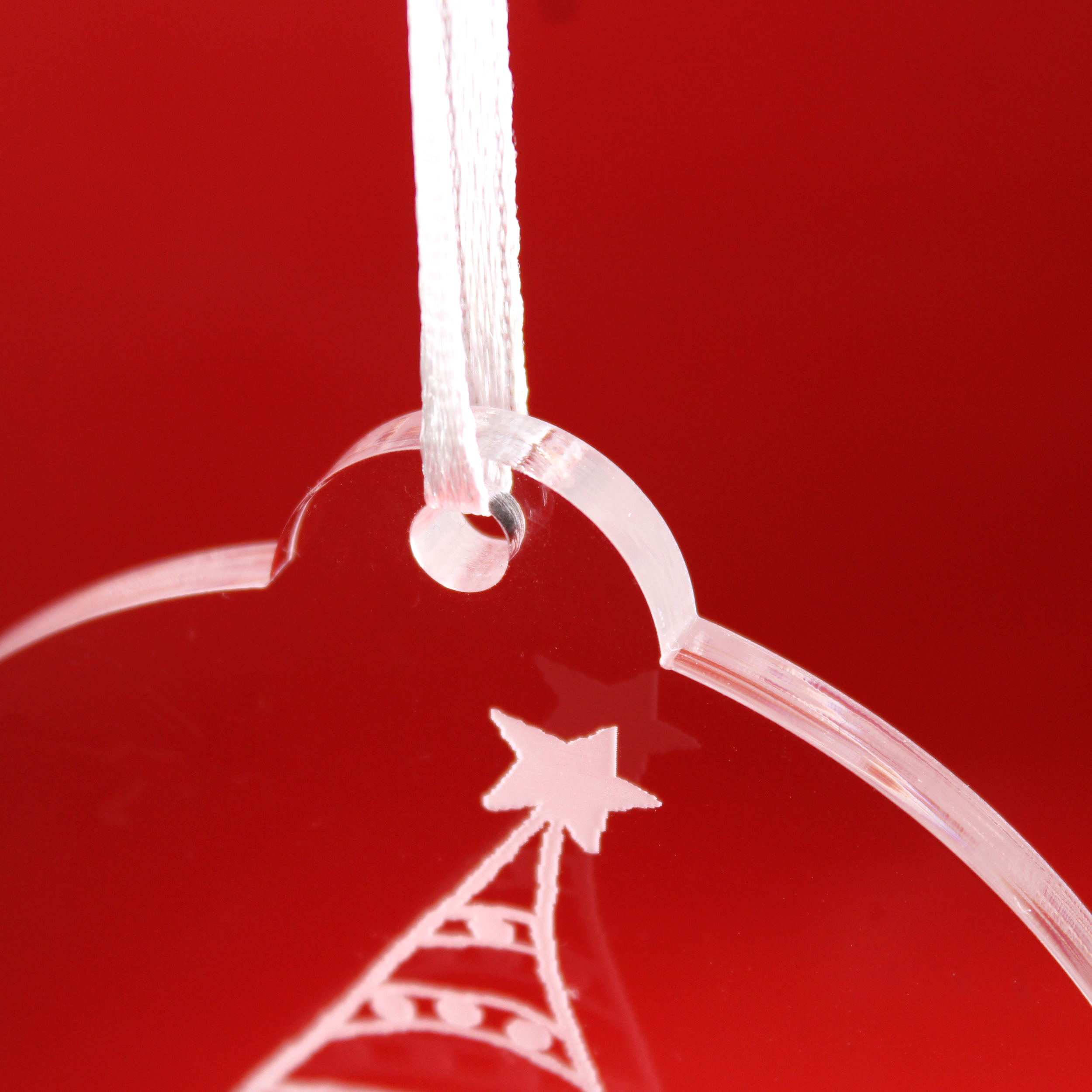 Die Dekolando Christbaumanhänger aus transparentem Acryl verbinden festliche Eleganz mit moderner Schlichtheit. Jeder Anhänger ist 8 × 8 cm groß, 0,5 cm dick und aus hochwertigem, glasklarem Acrylglas gefertigt – edel, stabil und langlebig. Die fein gearbeitete weiße Gravur entsteht durch präzise CO₂-Lasergravur und sorgt für ein brillantes, winterlich-frostiges Erscheinungsbild.