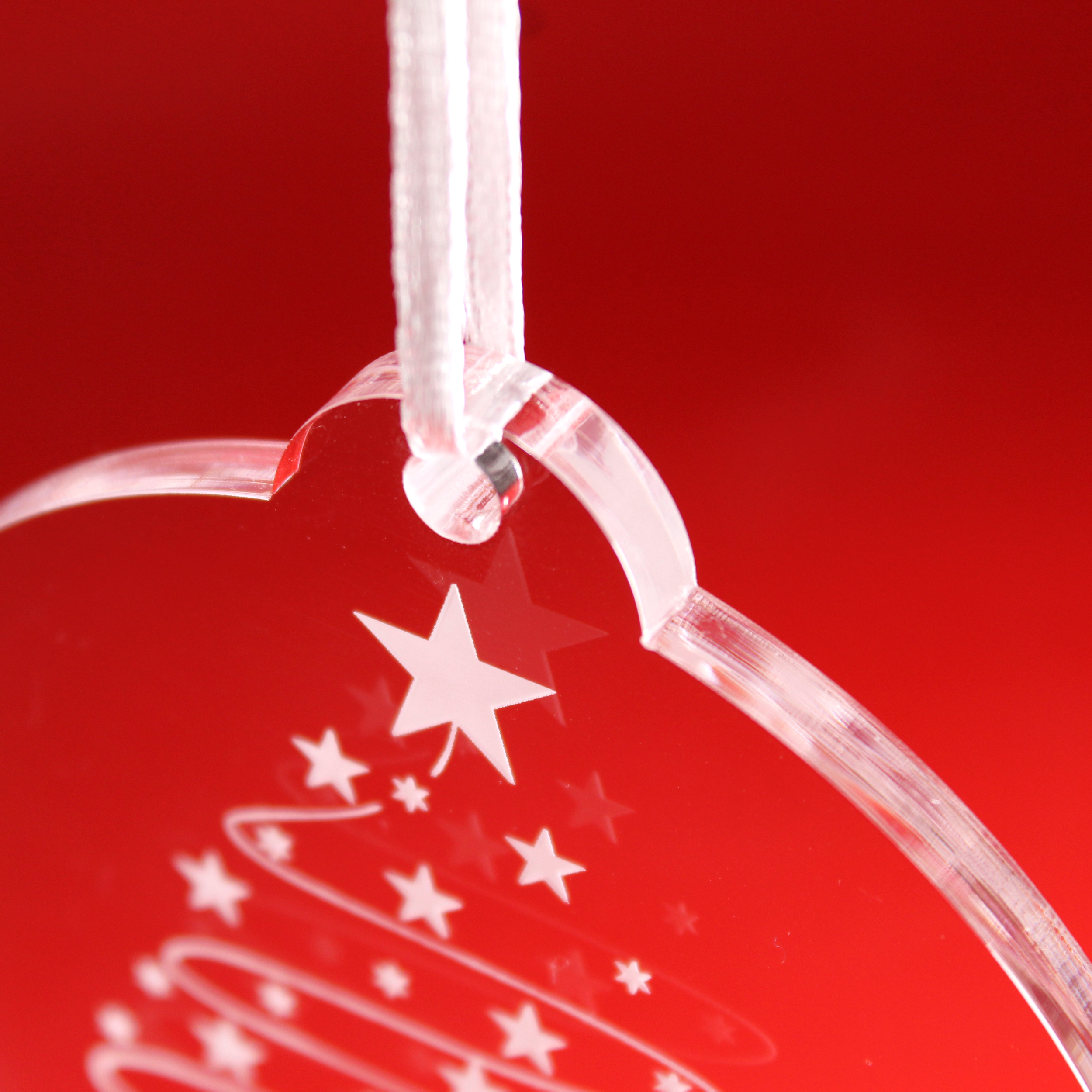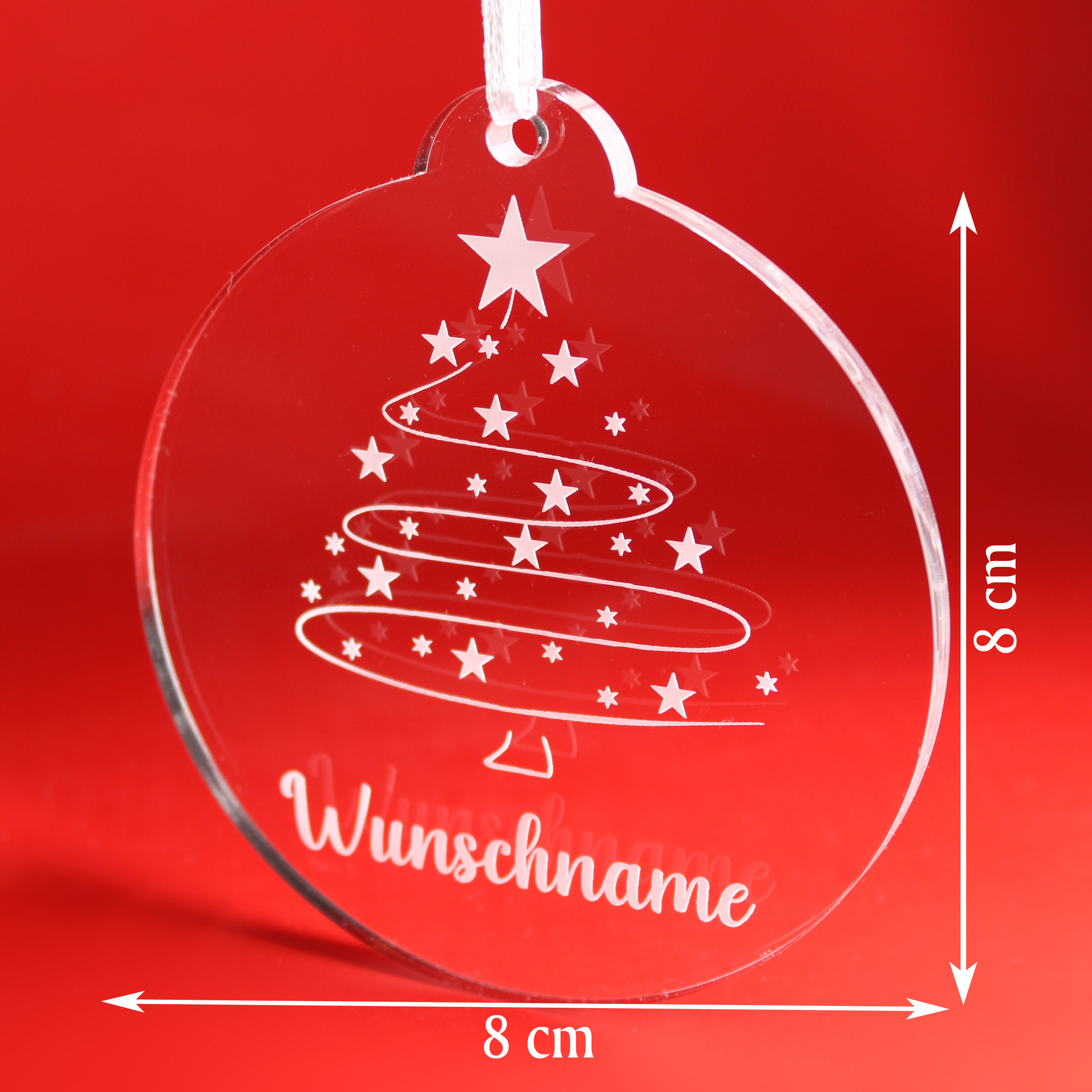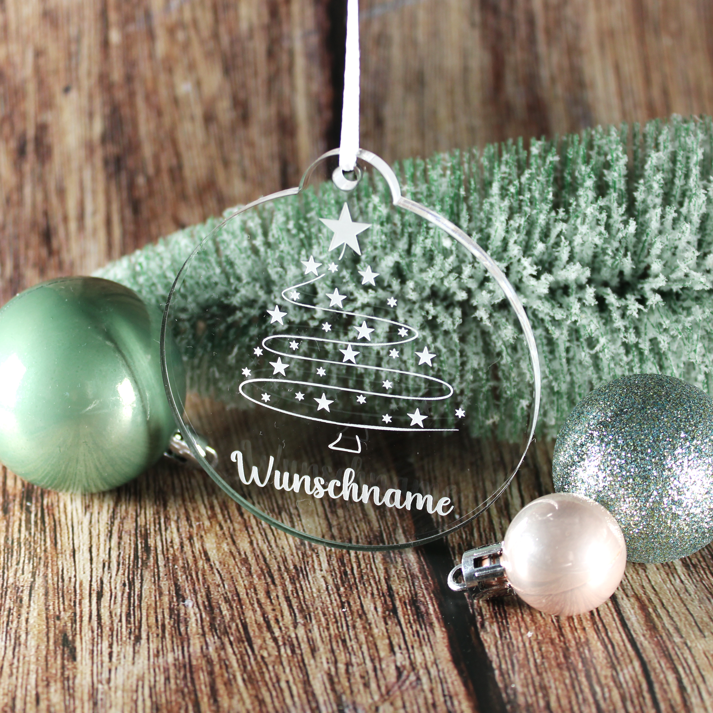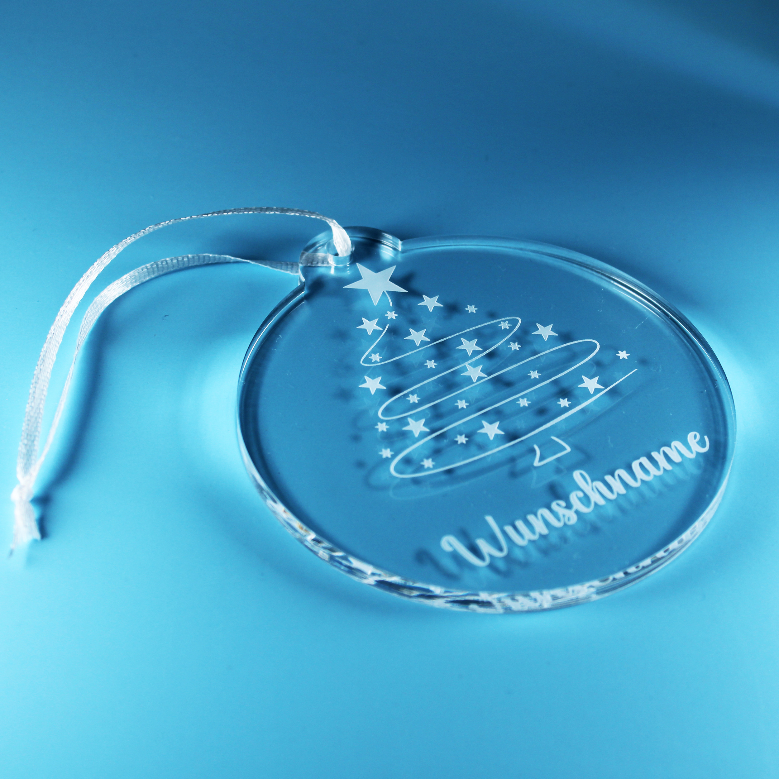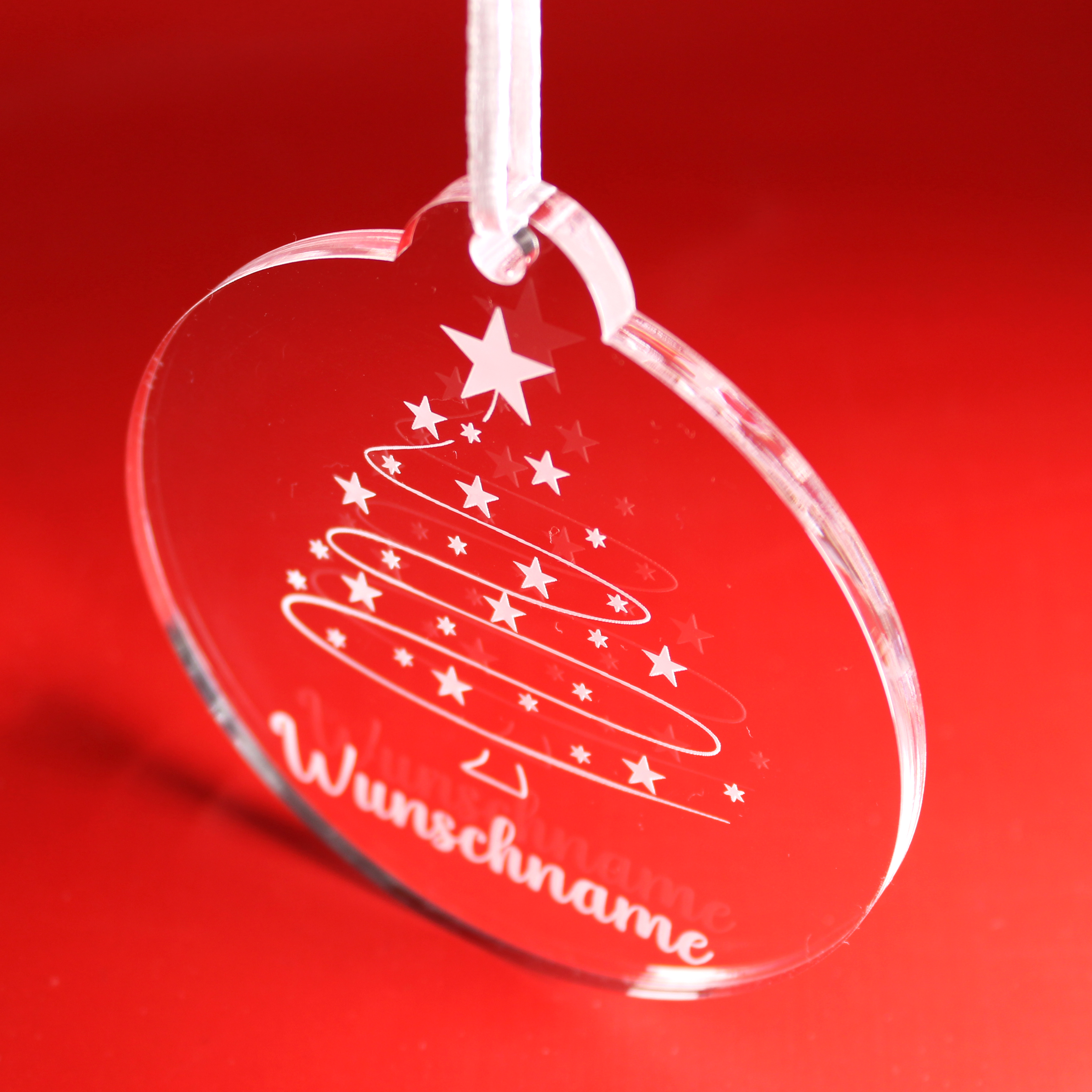 Christbaumanhänger Wunschname Weihnachtsbaum aus Acryl – transparente Weihnachtsanhänger mit weißer Gravur