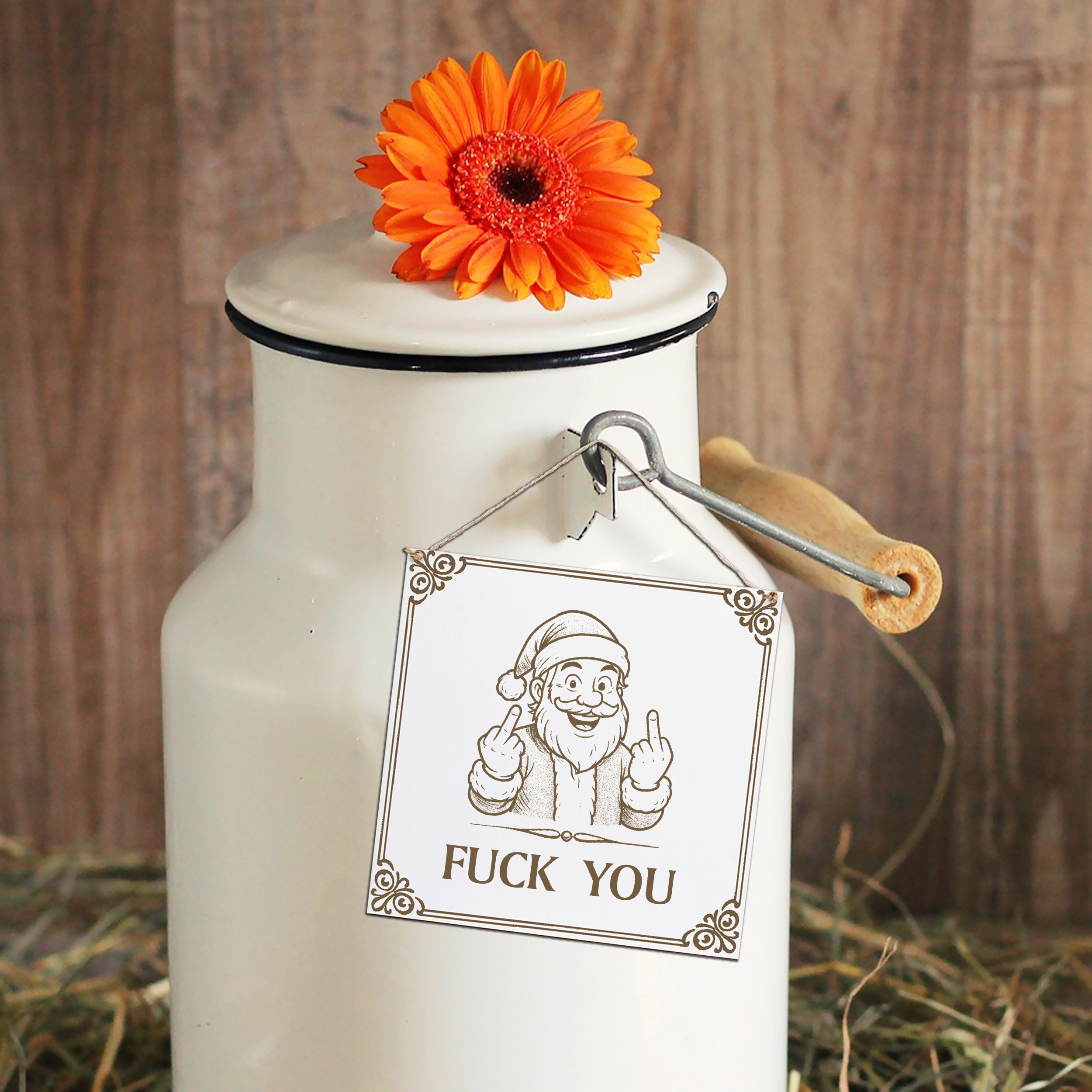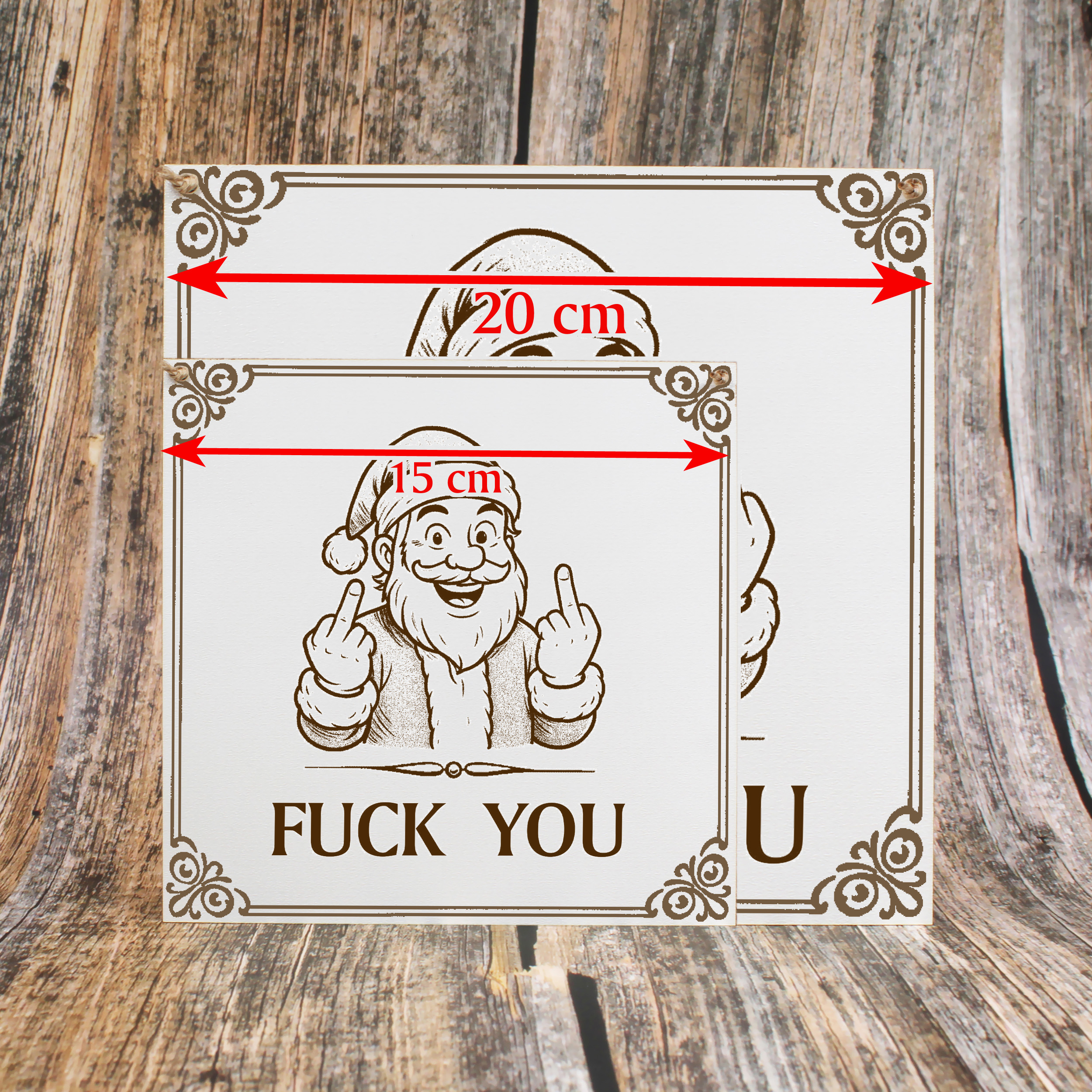 Comic Weihnachtsmann Wandschild „Fuck You“ – Weißes HDF-Dekoschild 15×15 cm (auch 20×20 cm)