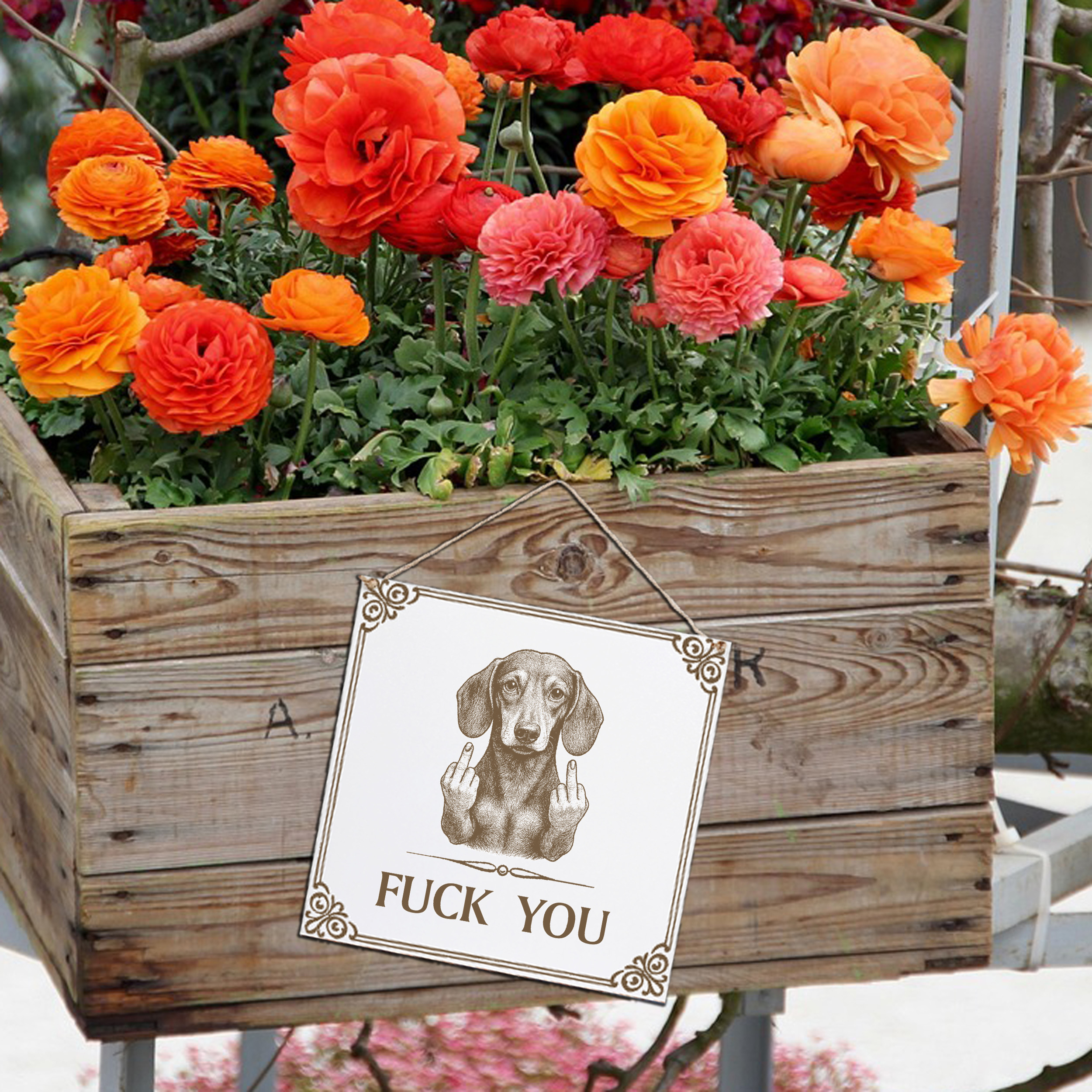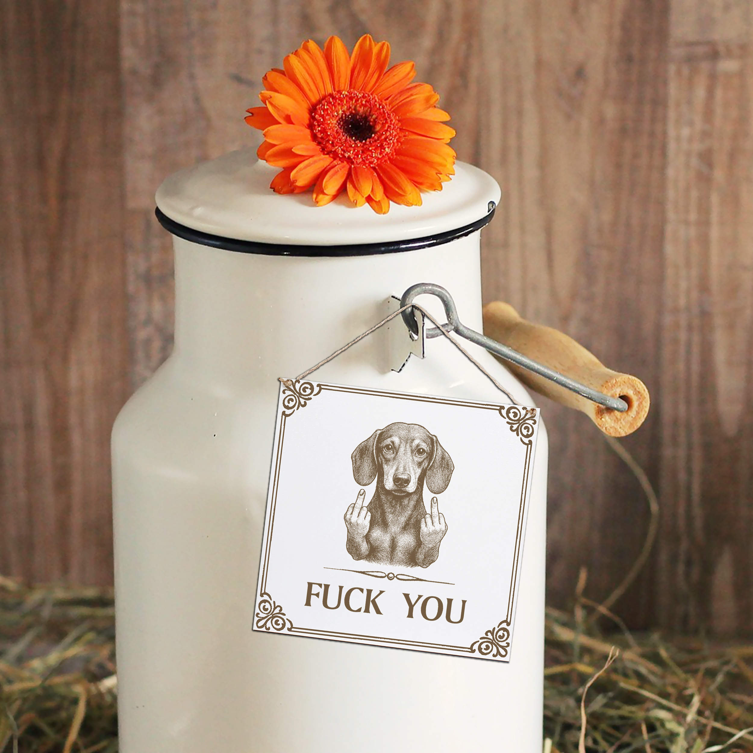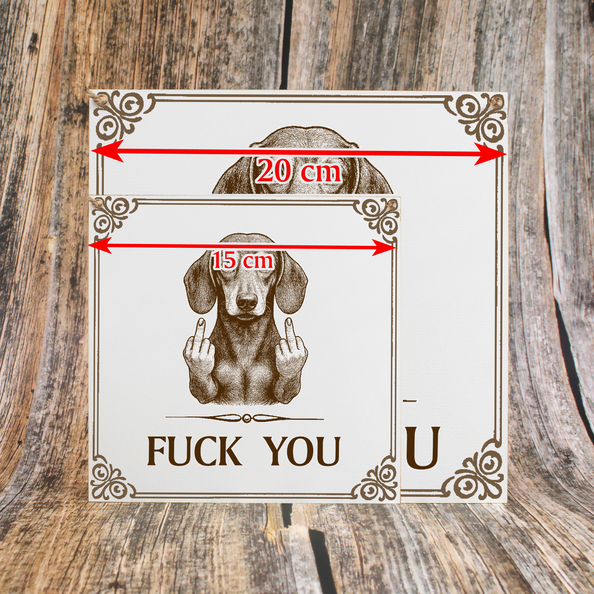 - Dieses weiße HDF-Schild bringt Humor und Provokation in deine Wohnung: Ein lustiger Dackel mit ausgestrecktem Stinkefinger und der Gravur „Fuck You“. Das Motiv ist dauerhaft ins Material eingraviert. Damit ist es ein langlebiges Dekoschild, das garantiert für Gesprächsstoff sorgt