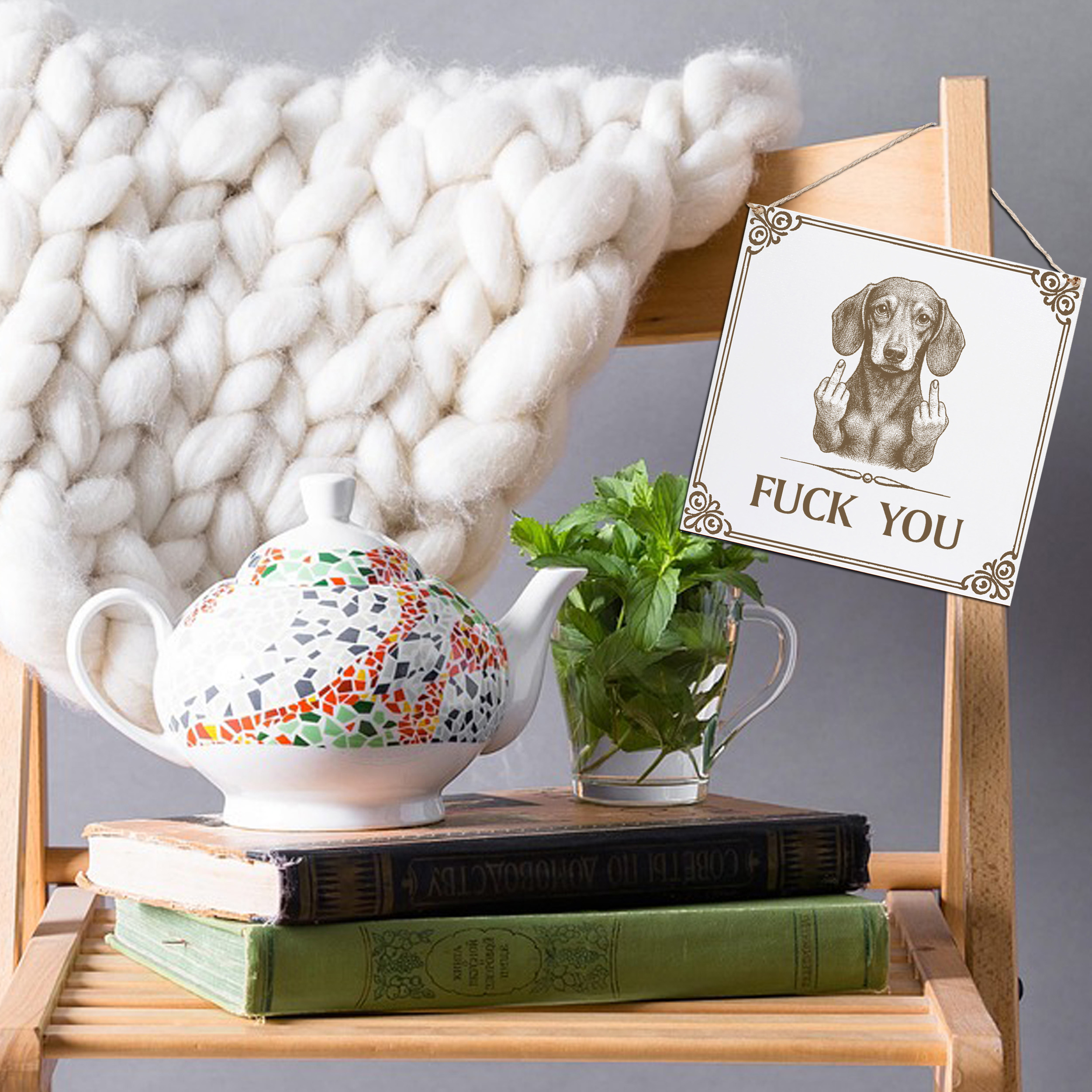 Dackel Wandschild „Fuck You“ – Weißes HDF-Dekoschild 15×15 cm (auch 20×20 cm)