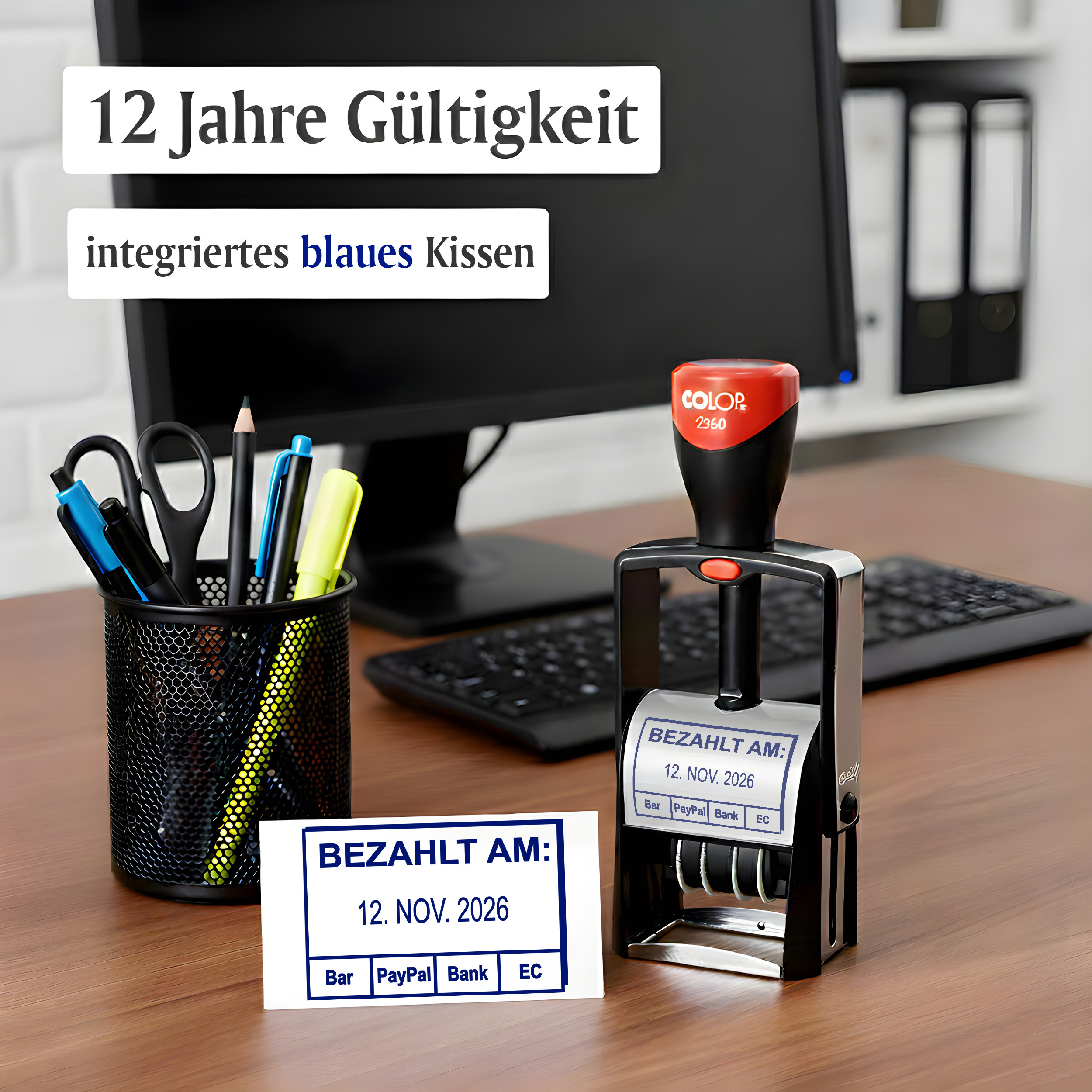 - DATUMSSTEMPEL BEZAHLT AM: 44x29 mm – Selbstfärbender Colop 2360 Stempel mit blauem Abdruck, verstellbarem Datum (Tag/Monat/Jahr) & klarer Textplatte für Büro, Eingang & Postbearbeitung.