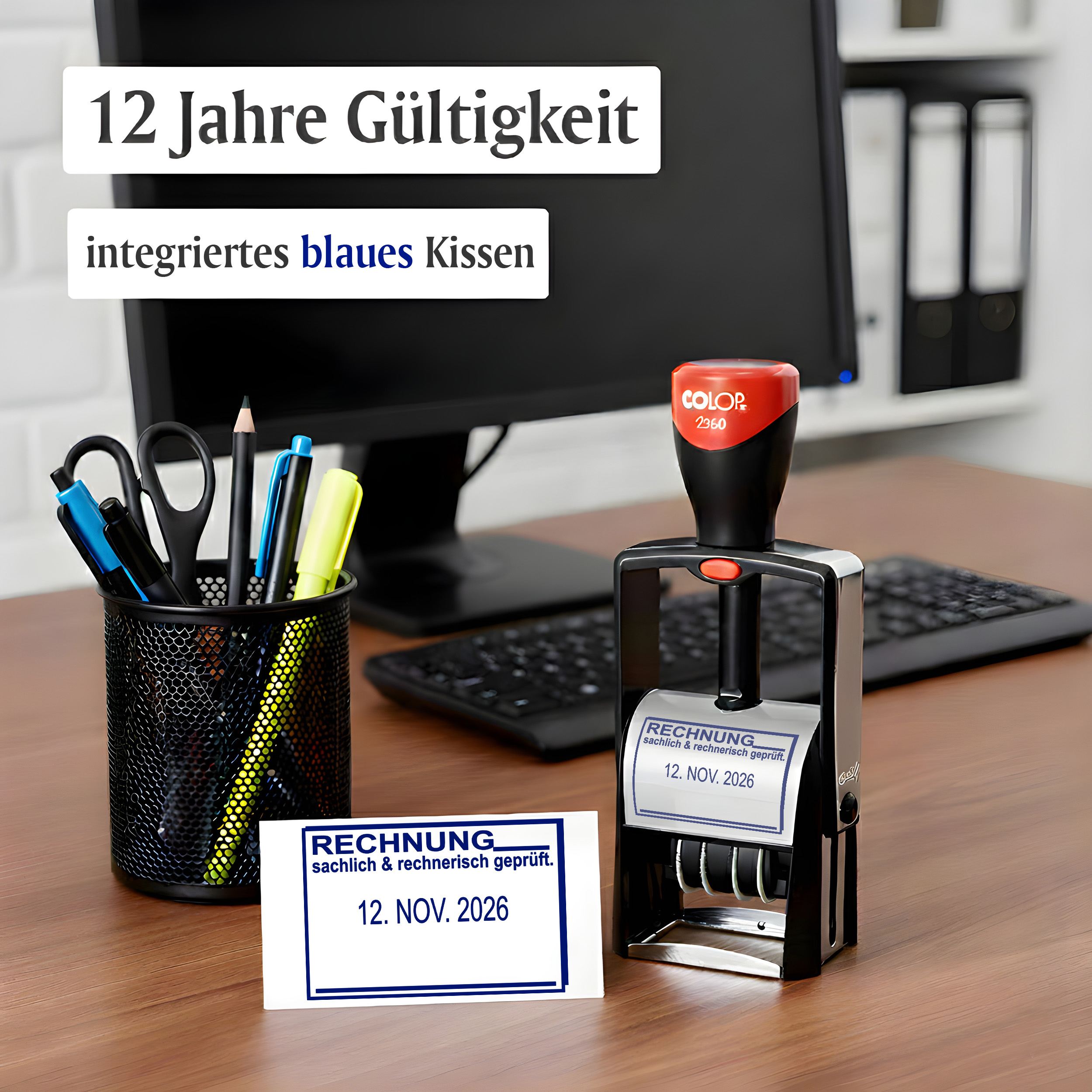 - DATUMSSTEMPEL RECHNUNG sachlich rechnerisch geprüft: 44x29 mm – Selbstfärbender Colop 2360 Stempel mit blauem Abdruck, verstellbarem Datum (Tag/Monat/Jahr) & klarer Textplatte für Büro, Eingang & Postbearbeitung.
