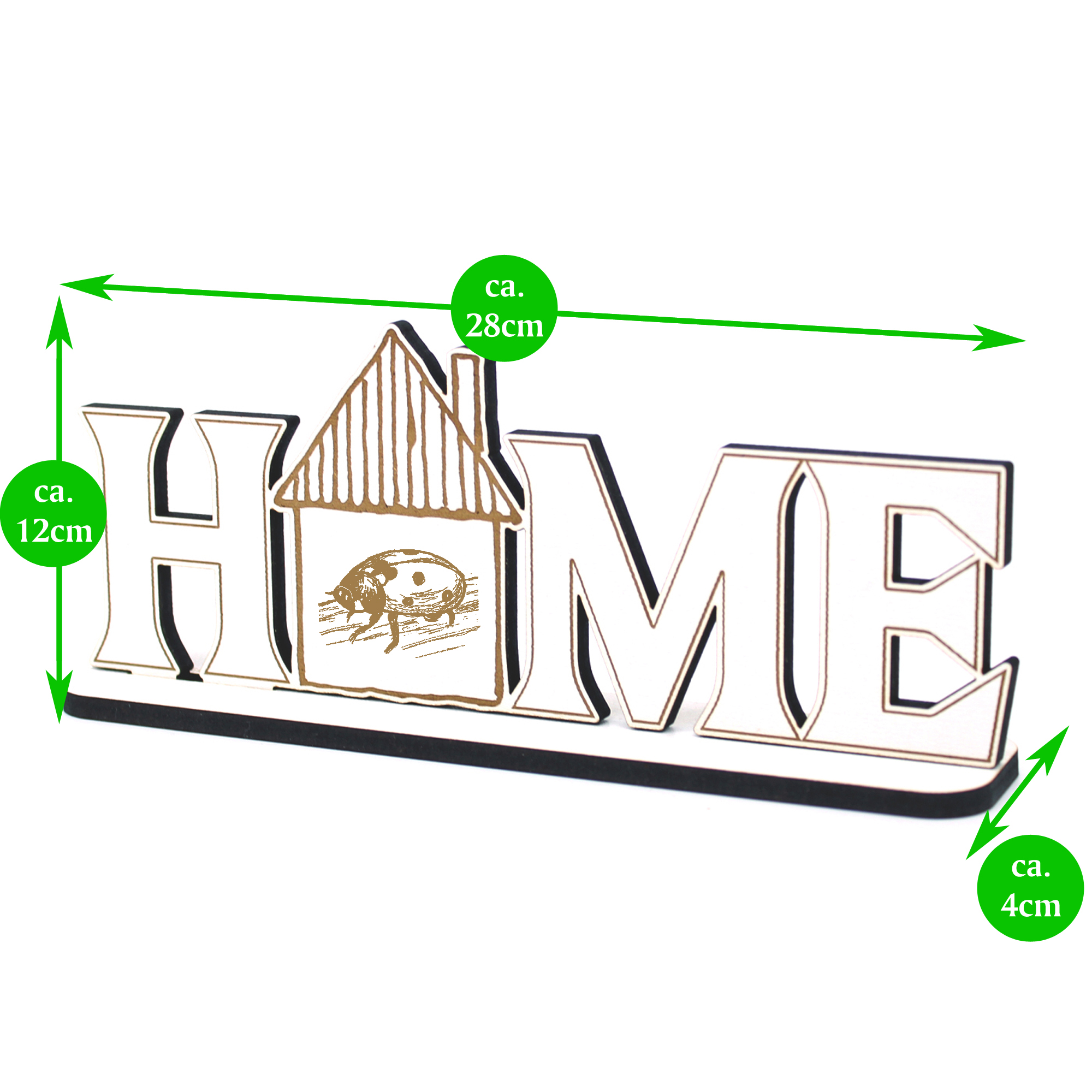 - HOLZAUFSTELLER: Die Wohndekoration ist stehend ca. 28 cm x 12 cm x 4 cm gross und wiegt ca. 70g. Der Holzschriftzug besteht aus HDF in weiß, einem sehr robusten und formstabilen Holz. Die Lasergravur wird mit hochpräzisen Industrielasern gefertigt. Die obere Schicht des Materials wird klein abgetragen und das untere Braun kommt zum Vorschein