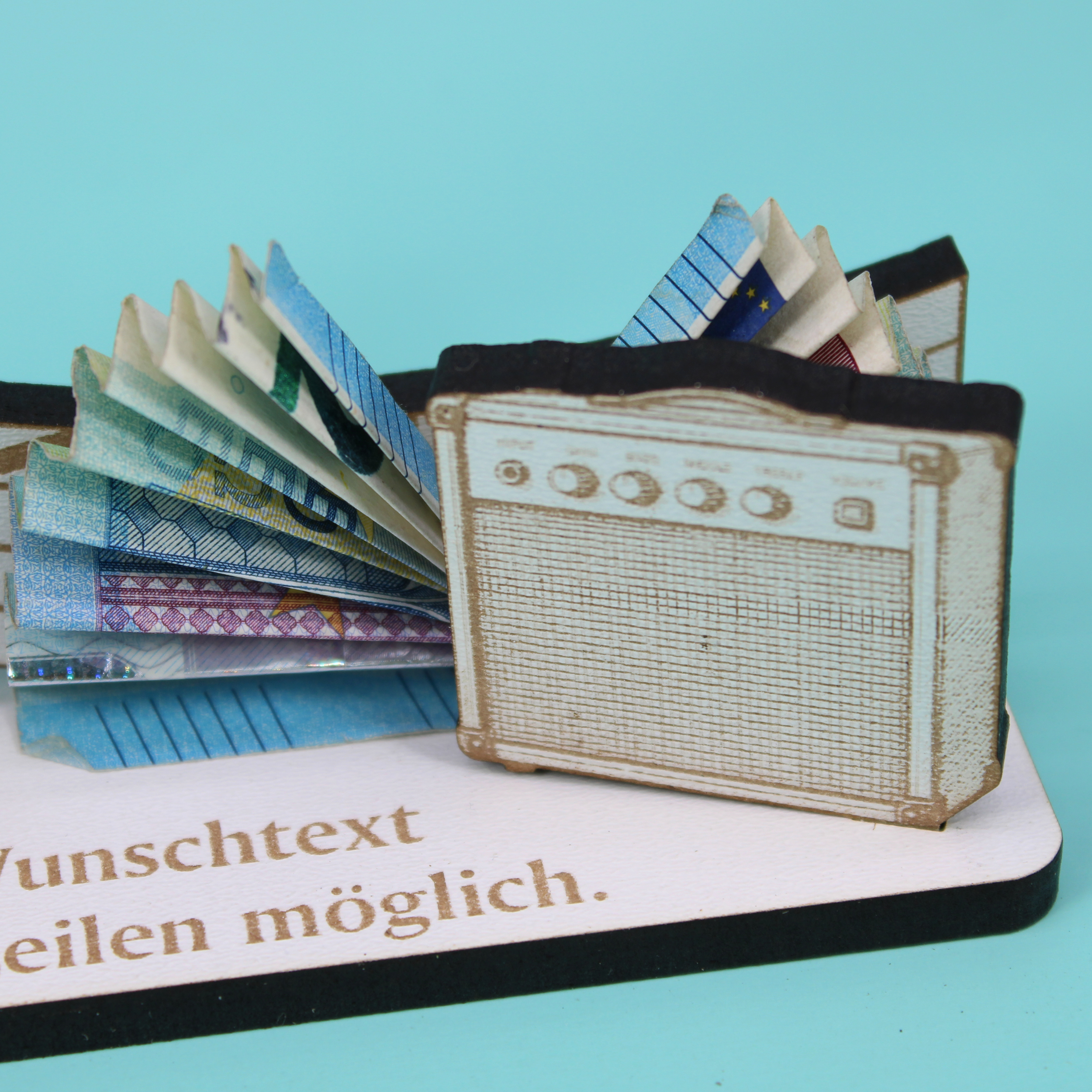 Freistehend platziert auf Regal, Sideboard, Schreibtisch oder Fensterbank wird er zum Blickfang – solo oder kombiniert mit Vinyls, Noten, Plektren, Drumsticks oder Kopfhörerständer. Ideal, um Geldscheine, Gutscheine oder Karten dekorativ beizulegen und so ein wertiges Geldgeschenk mit persönlicher Note zu überreichen.
