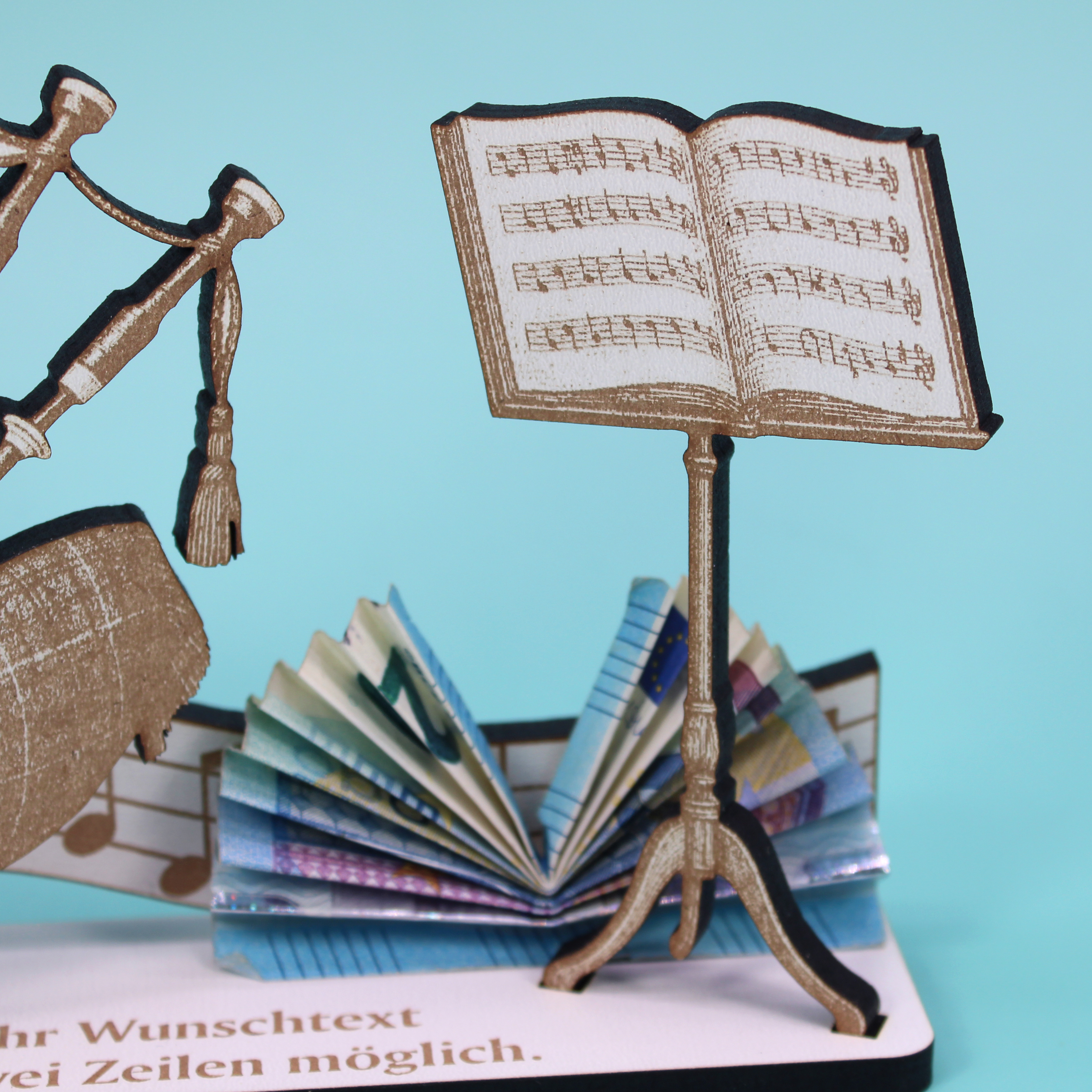 Freistehend platziert auf Regal, Sideboard, Schreibtisch oder Fensterbank wird er zum Blickfang – solo oder kombiniert mit Vinyls, Noten, Plektren, Drumsticks oder Kopfhörerständer. Ideal, um Geldscheine, Gutscheine oder Karten dekorativ beizulegen und so ein wertiges Geldgeschenk mit persönlicher Note zu überreichen.