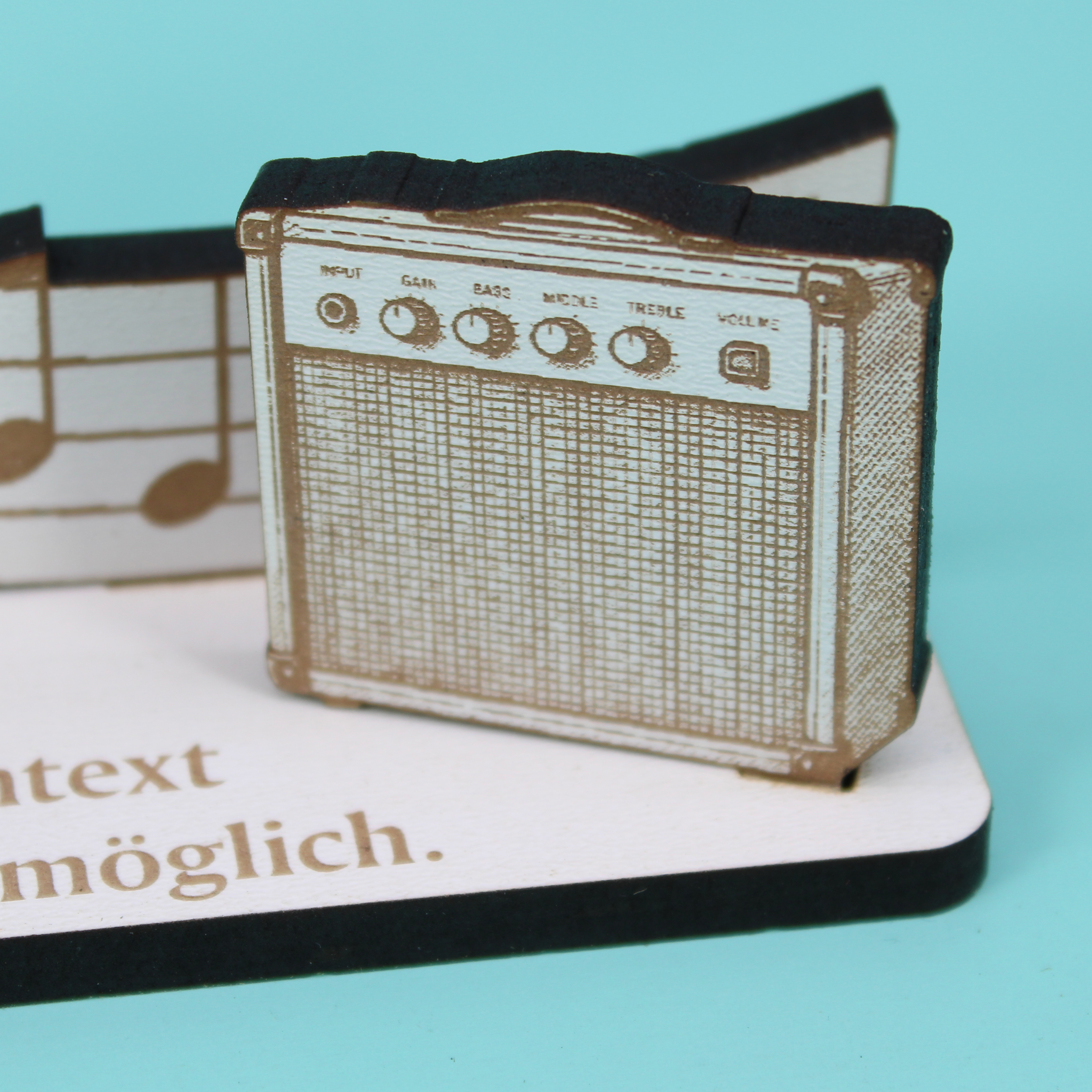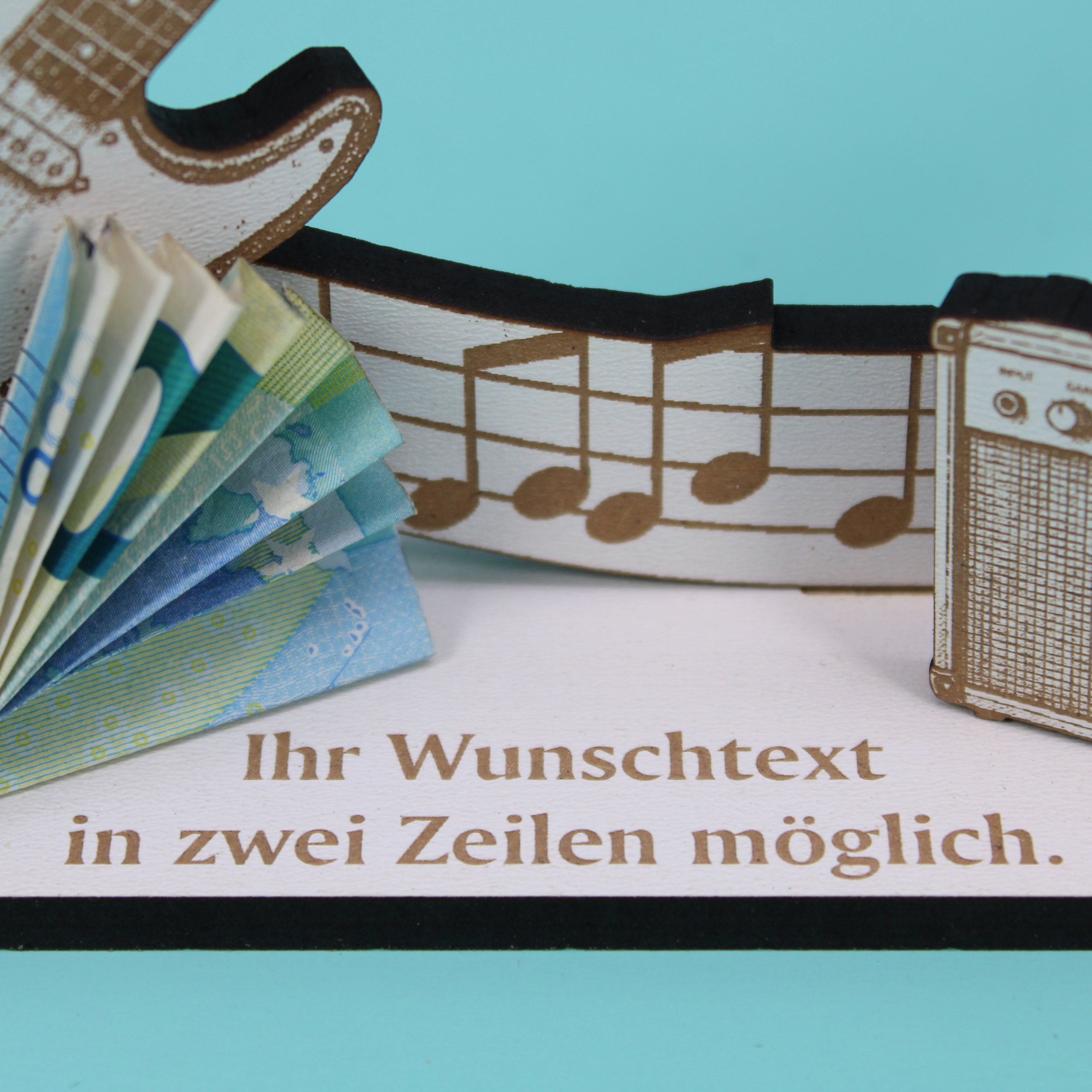 Freistehend platziert auf Regal, Sideboard, Schreibtisch oder Fensterbank wird er zum Blickfang – solo oder kombiniert mit Vinyls, Noten, Plektren, Drumsticks oder Kopfhörerständer. Ideal, um Geldscheine, Gutscheine oder Karten dekorativ beizulegen und so ein wertiges Geldgeschenk mit persönlicher Note zu überreichen.